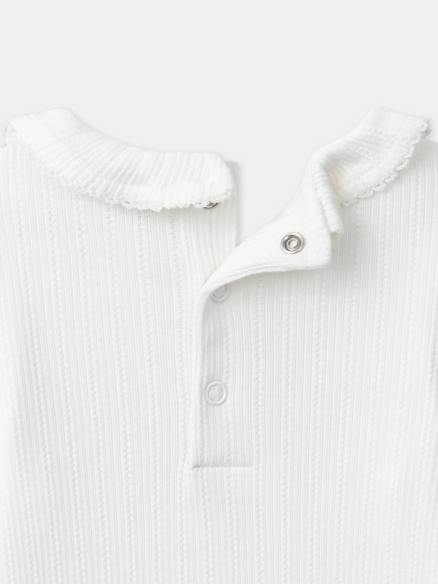 Pour les petites exploratrices, parfait pour le printemps. Combinaison en twill gratté et body à côtes, bretelles ajustables et boutons pression. Imprimés fleuris et ruban sur chaussettes, univers poétique et délicat. Body : Body à côtes ajourées de couleur écrue Col rond à côtes ajourées avec finitions picots Bas des manches froncées avec finitions picots […]