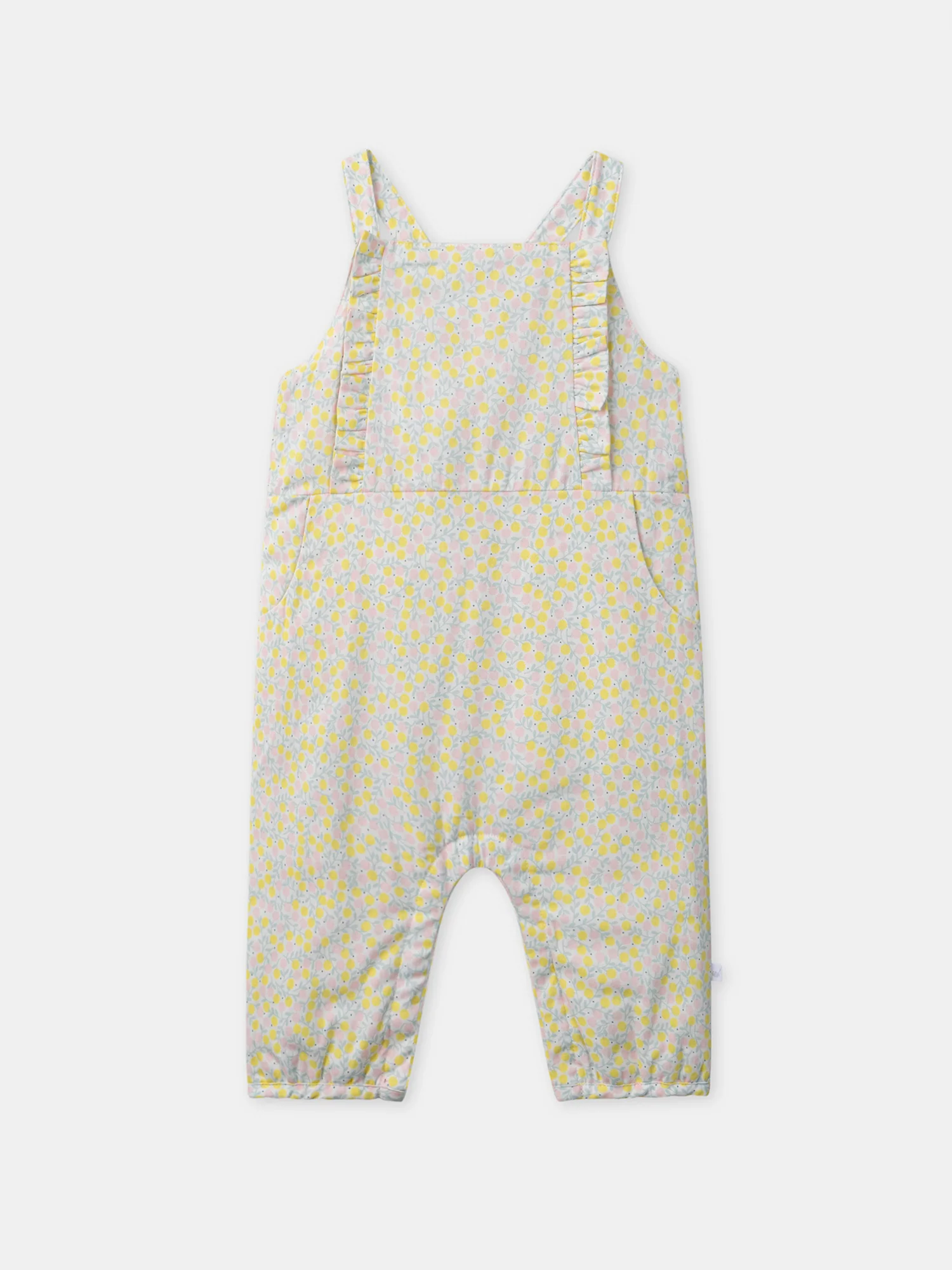 Pour les petites exploratrices, parfait pour le printemps. Combinaison en twill gratté et body à côtes, bretelles ajustables et boutons pression. Imprimés fleuris et ruban sur chaussettes, univers poétique et délicat.