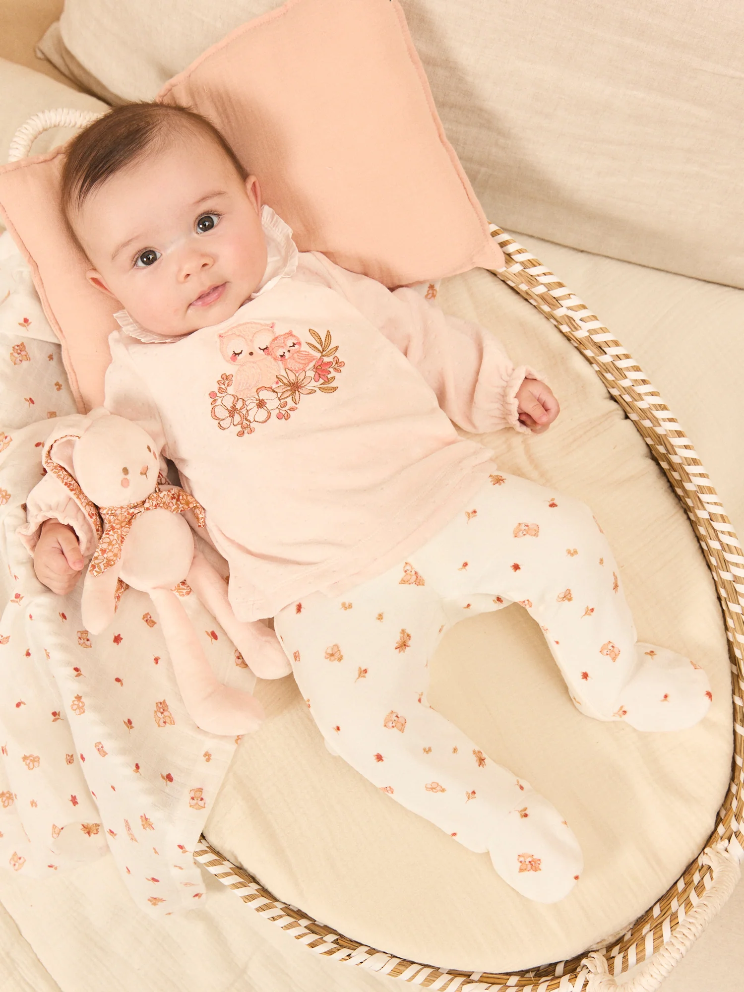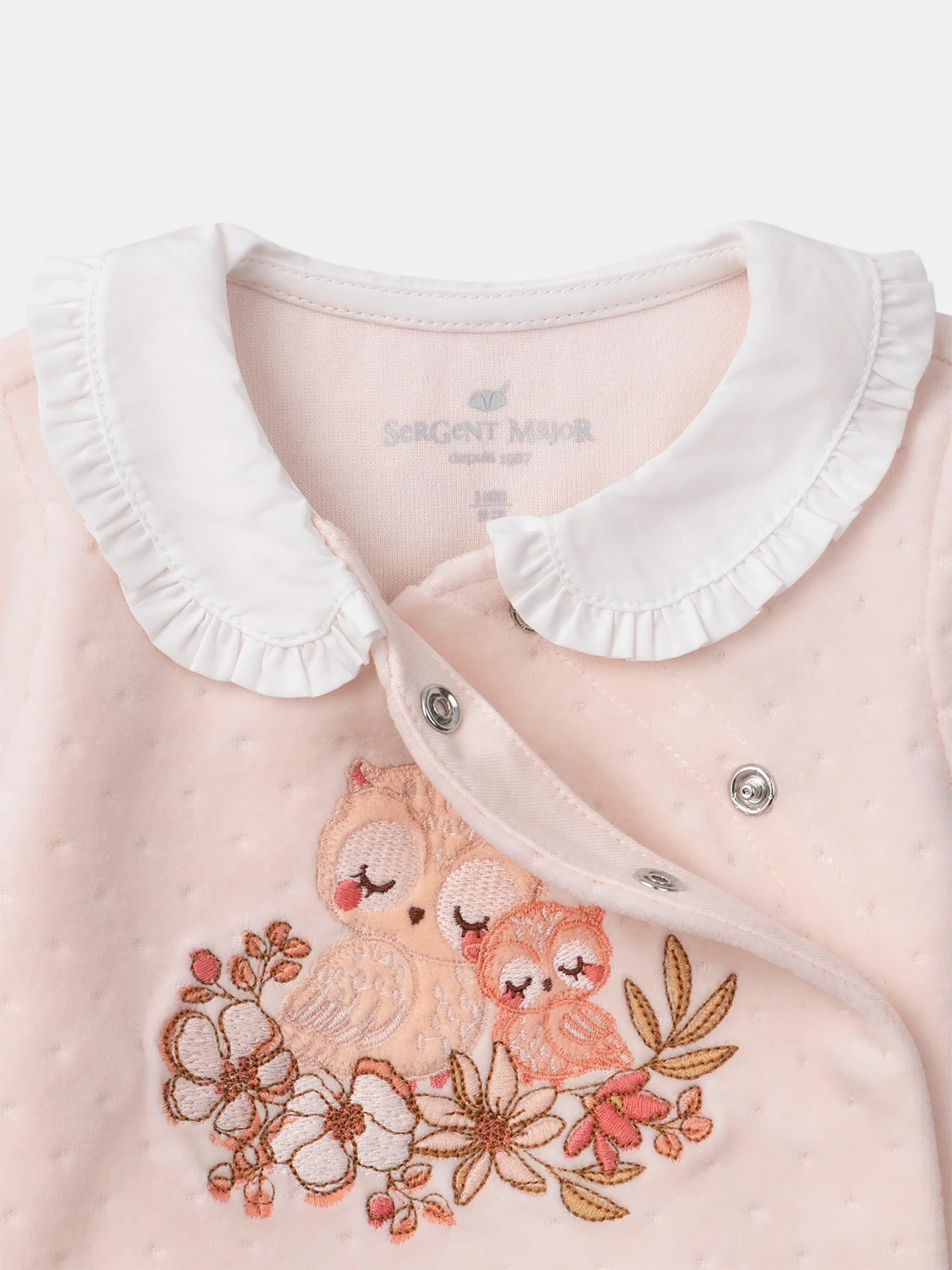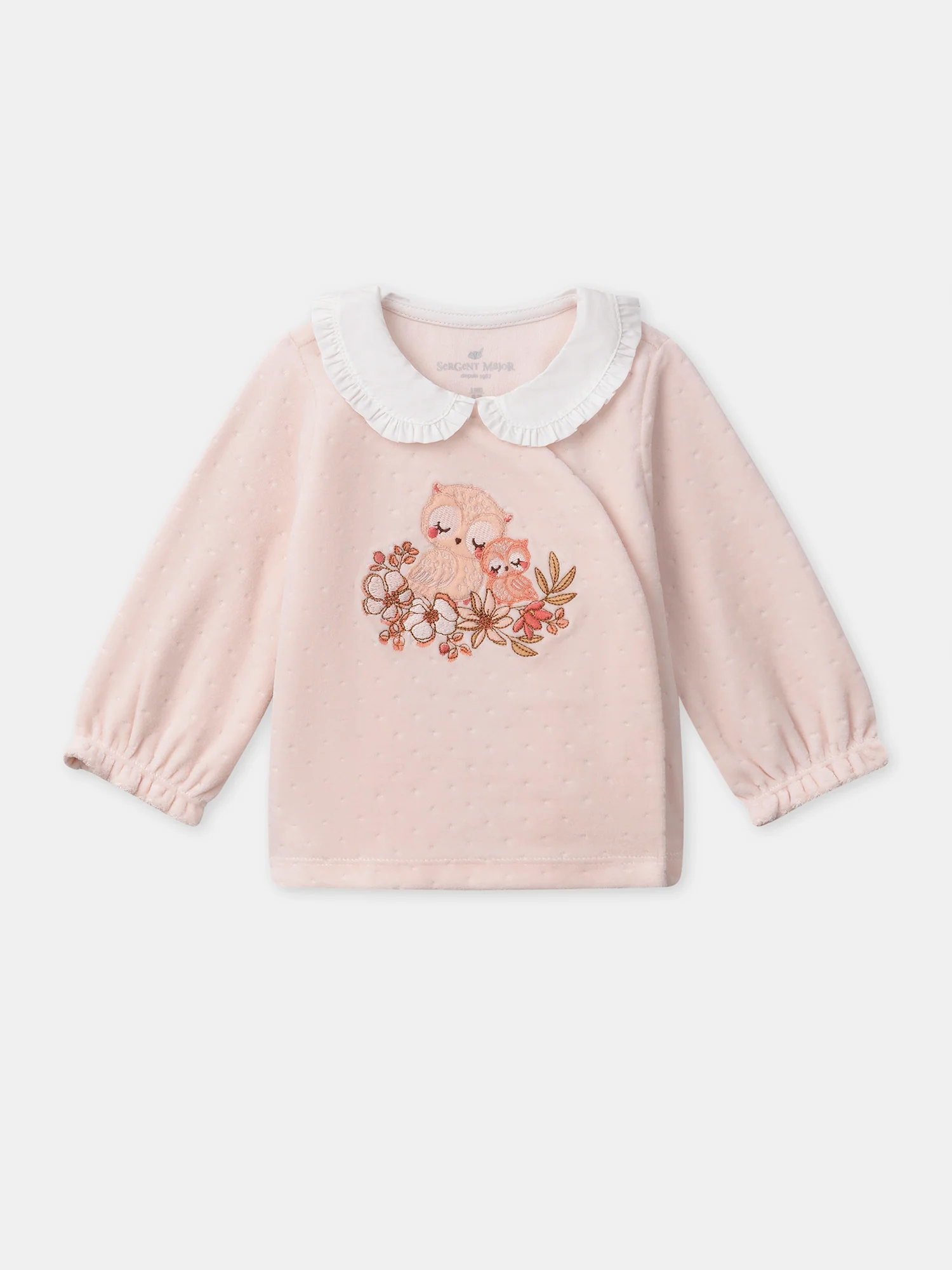- Patch en velours sur le buste représentant deux hiboux avec fleurs brodées dans les tons rose poudré, groseille, corail et brun doux