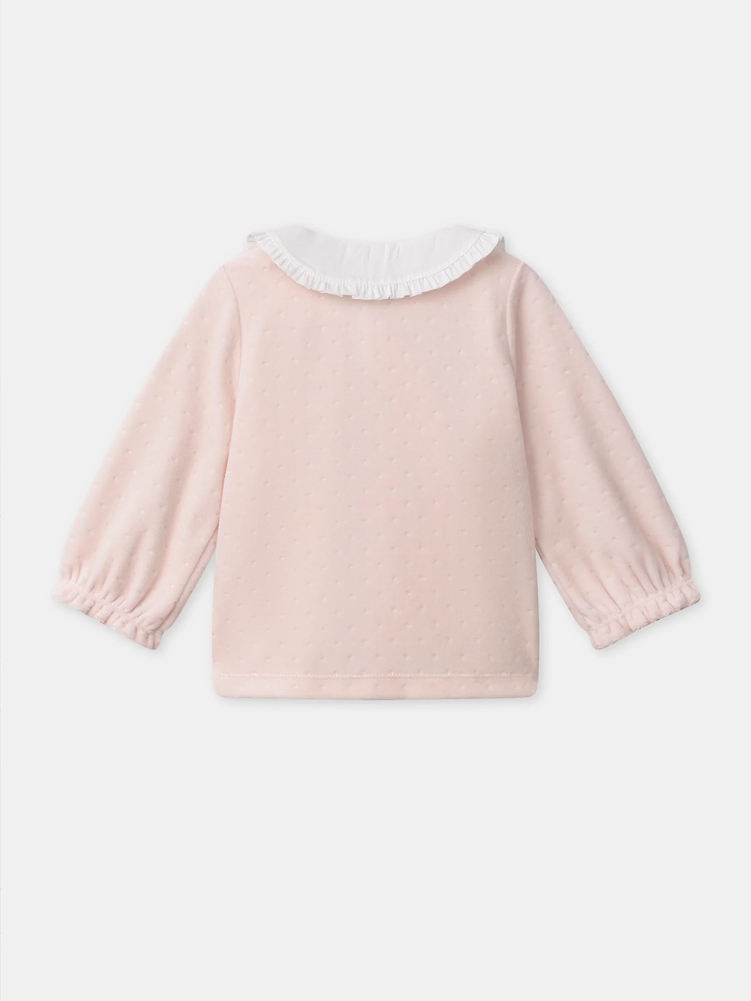 - Haut: Haut à manches longues en velours dévoré à pois rose pâle