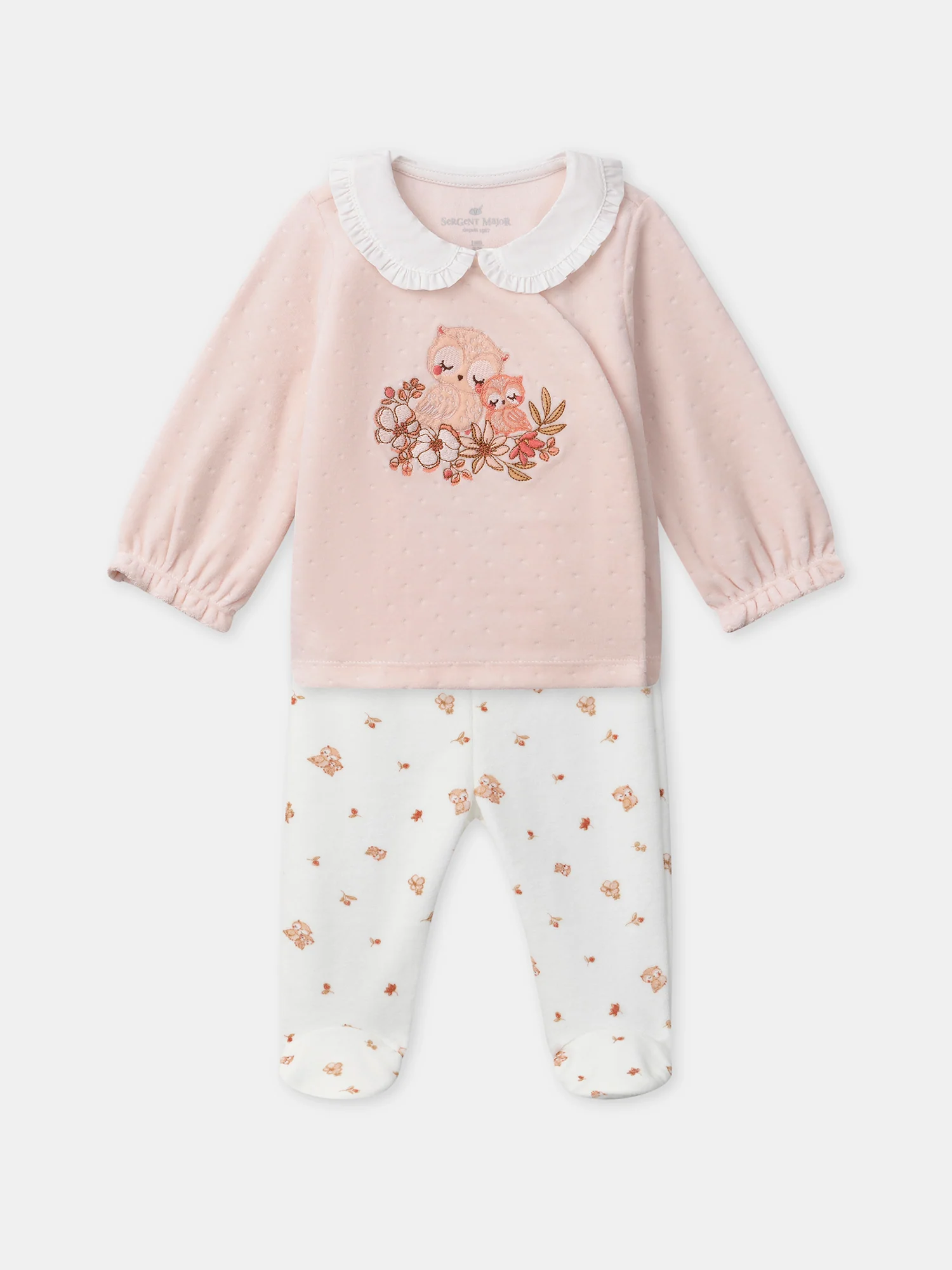Ensemble de nuit en velours composé de coton issue de l’égriculture biologique Haut: Haut à manches longues en velours dévoré à pois rose pâle Col volanté en popeline avec liseré volanté de couleur écru Patch en velours sur le buste représentant deux hiboux avec fleurs brodées dans les tons rose poudré, groseille, corail et brun […]
