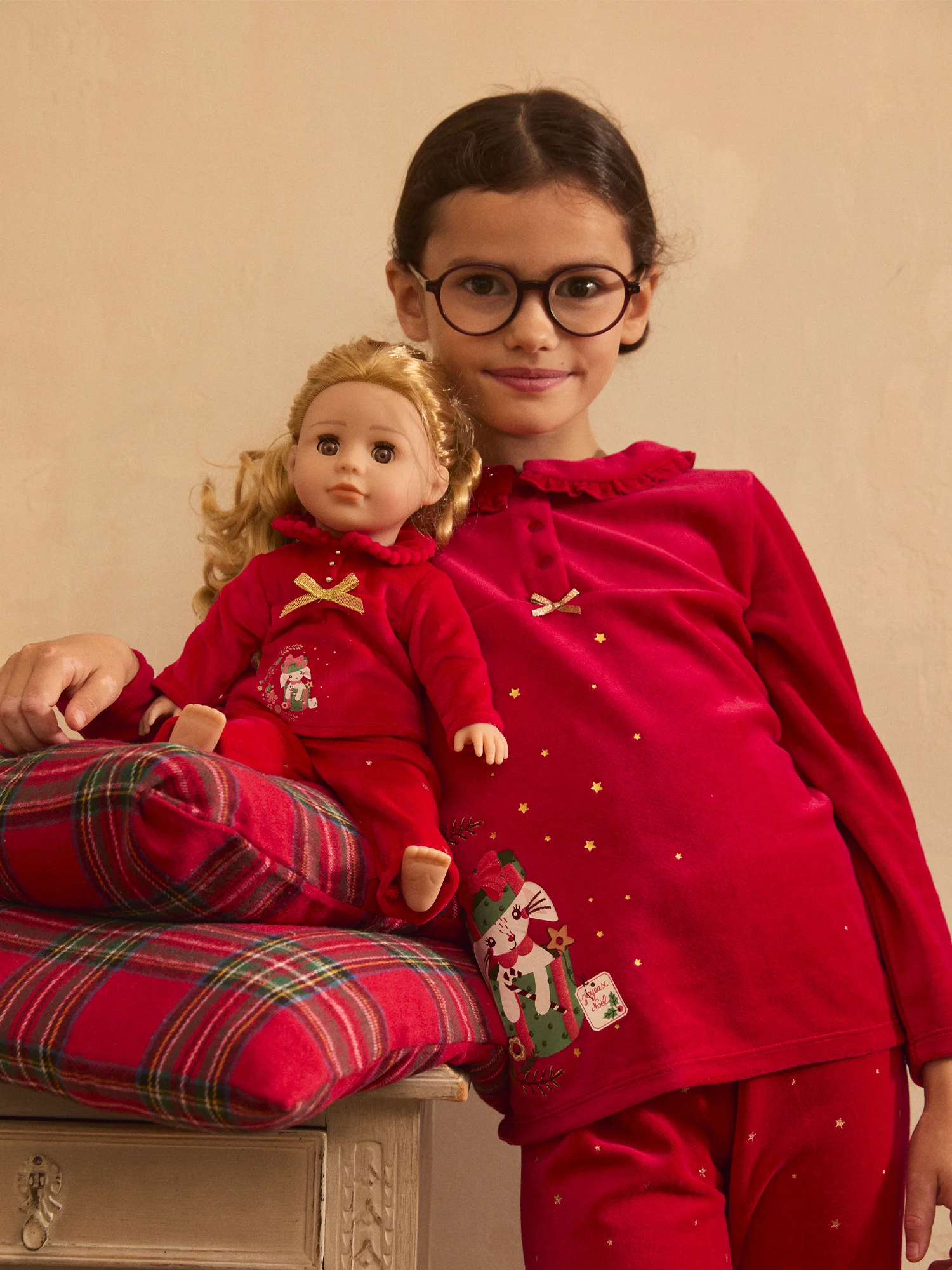 - Ensemble tenue de poupée composée d’un haut avec animation et d’un bas de pyjama sur le thème de Noel