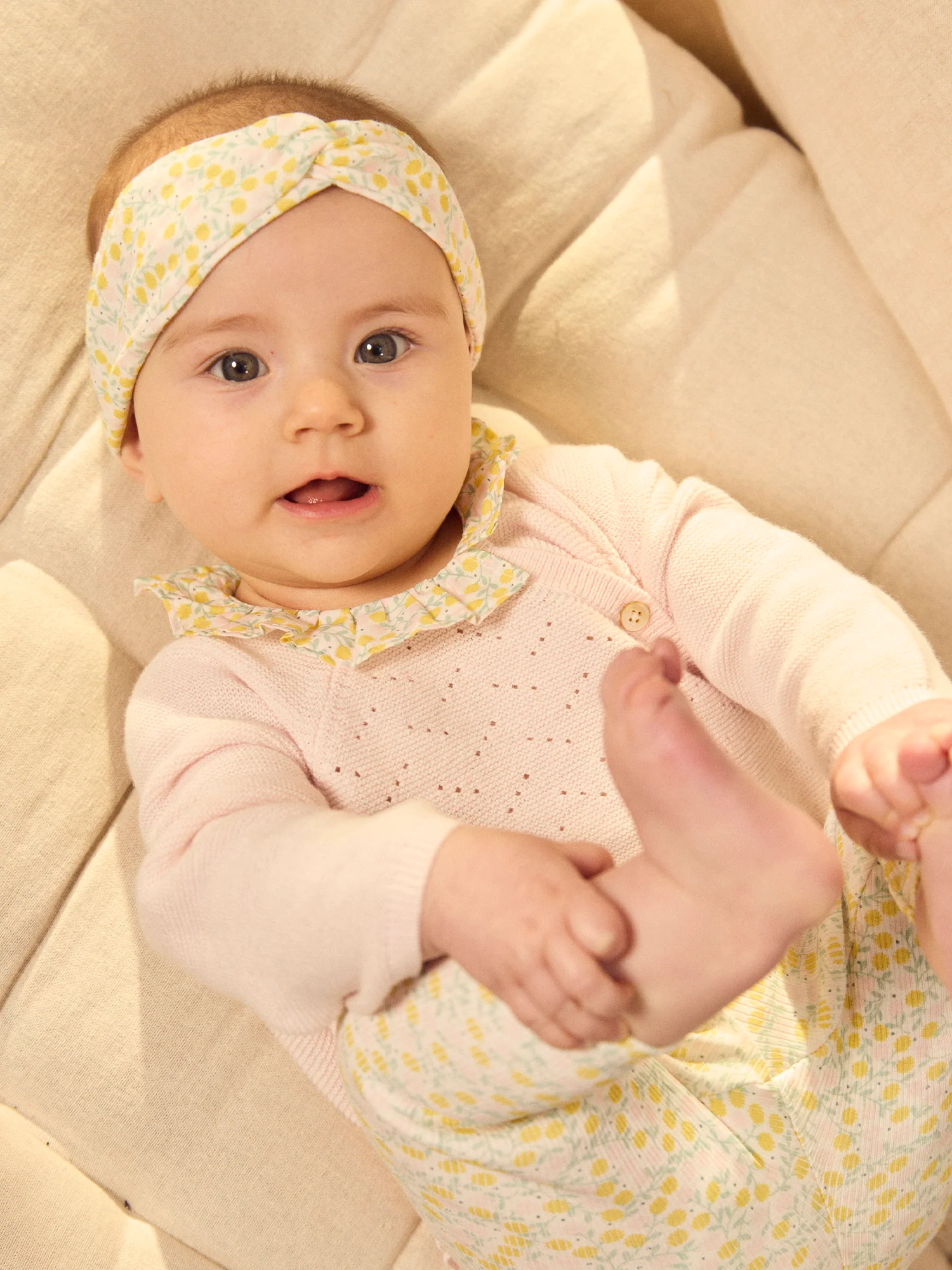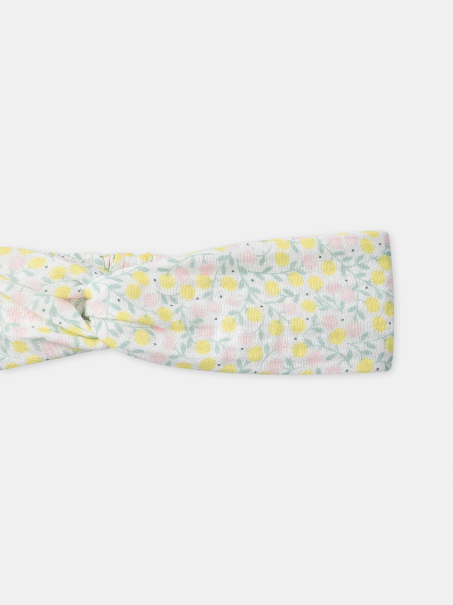- Bandeau en gaze de coton avec imprimé dans les tons rose pâle, jaune mimosa, et vert tendre sur fond écru