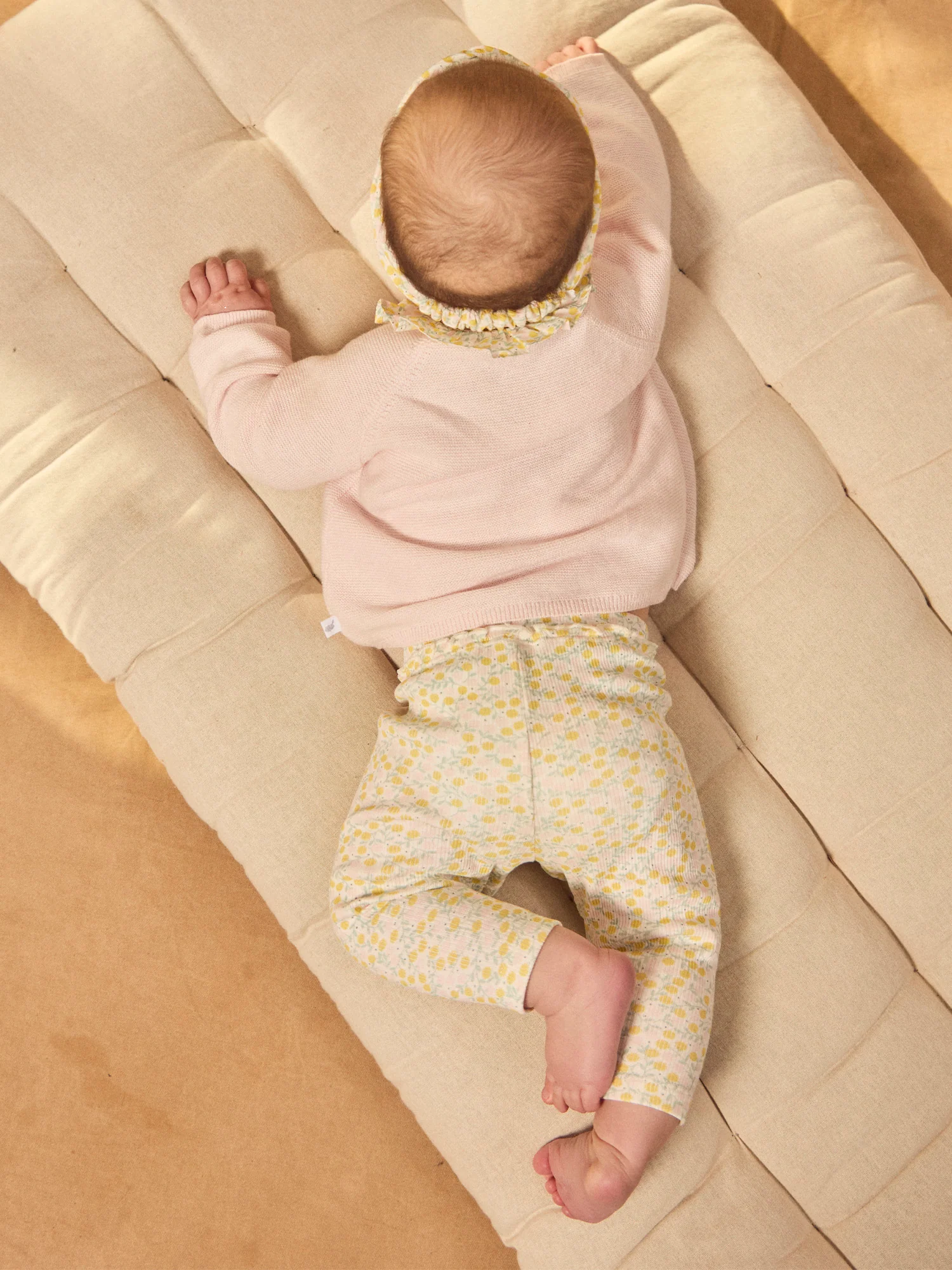 - Legging à côtes avec imprimé fleuri dans les tons rose pâle, jaune mimosa, et vert tendre sur fond écru