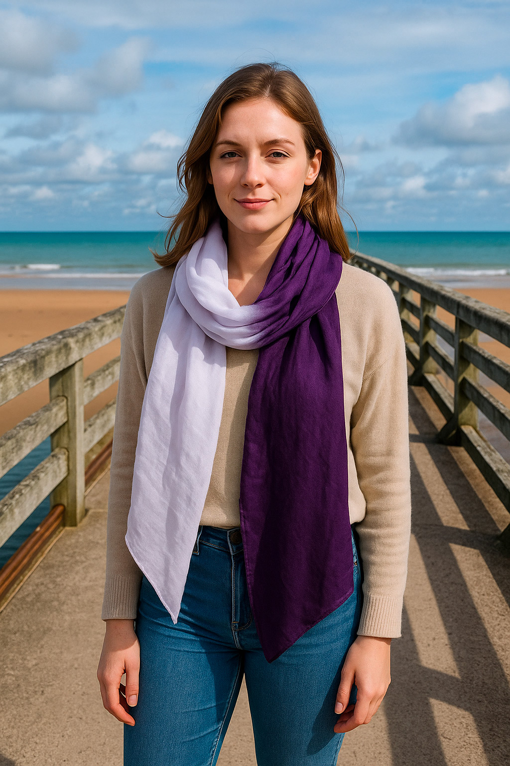 Élevez votre style avec notre foulard pour femme, présentant un mélange charmant de violet et blanc. Fabriqué en 100% soie naturelle, ce foulard offre une sensation de douceur inégalée et une qualité luxueuse.