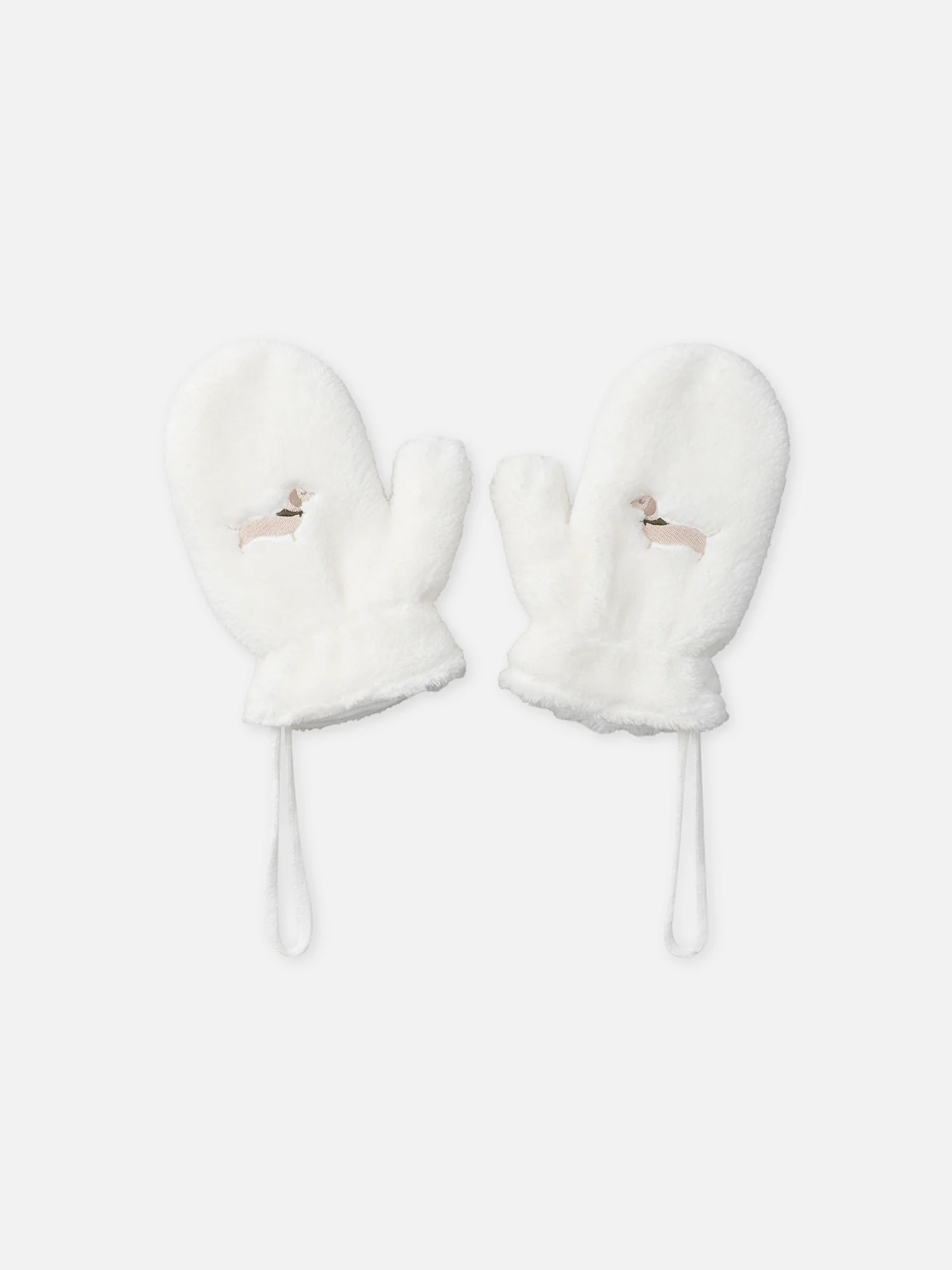 - Fourrure synthétique écrue, broderie chien sur le dessus de la main