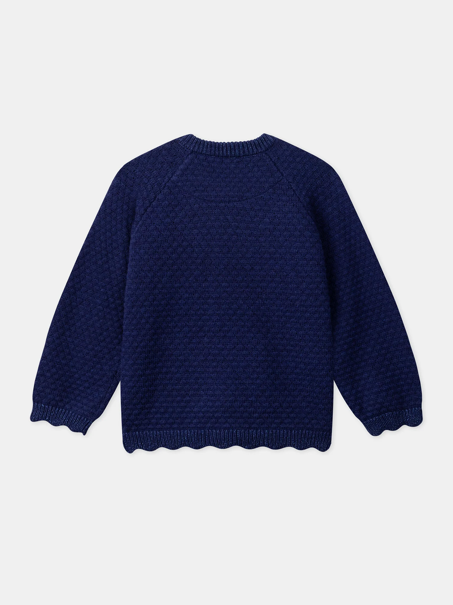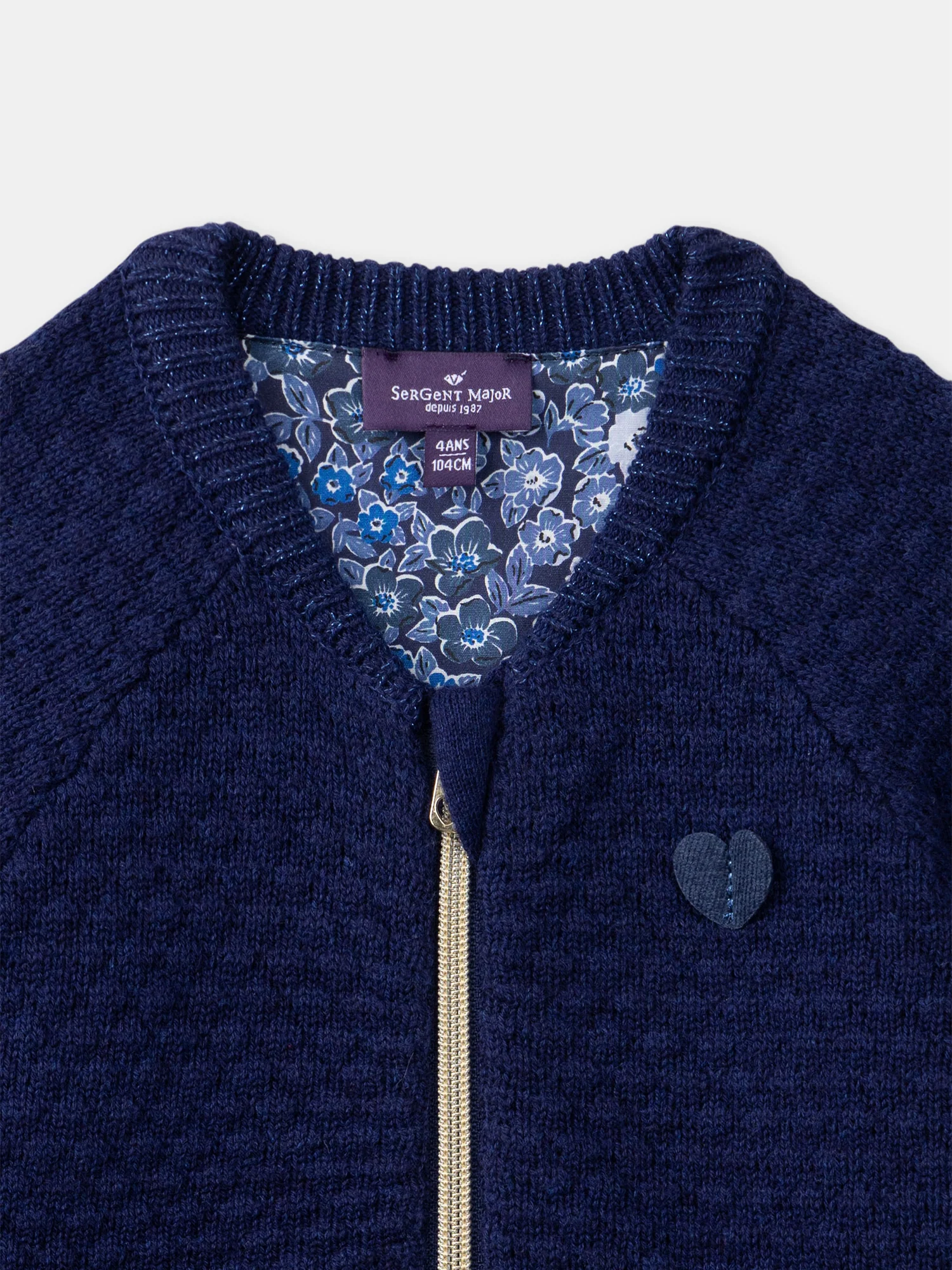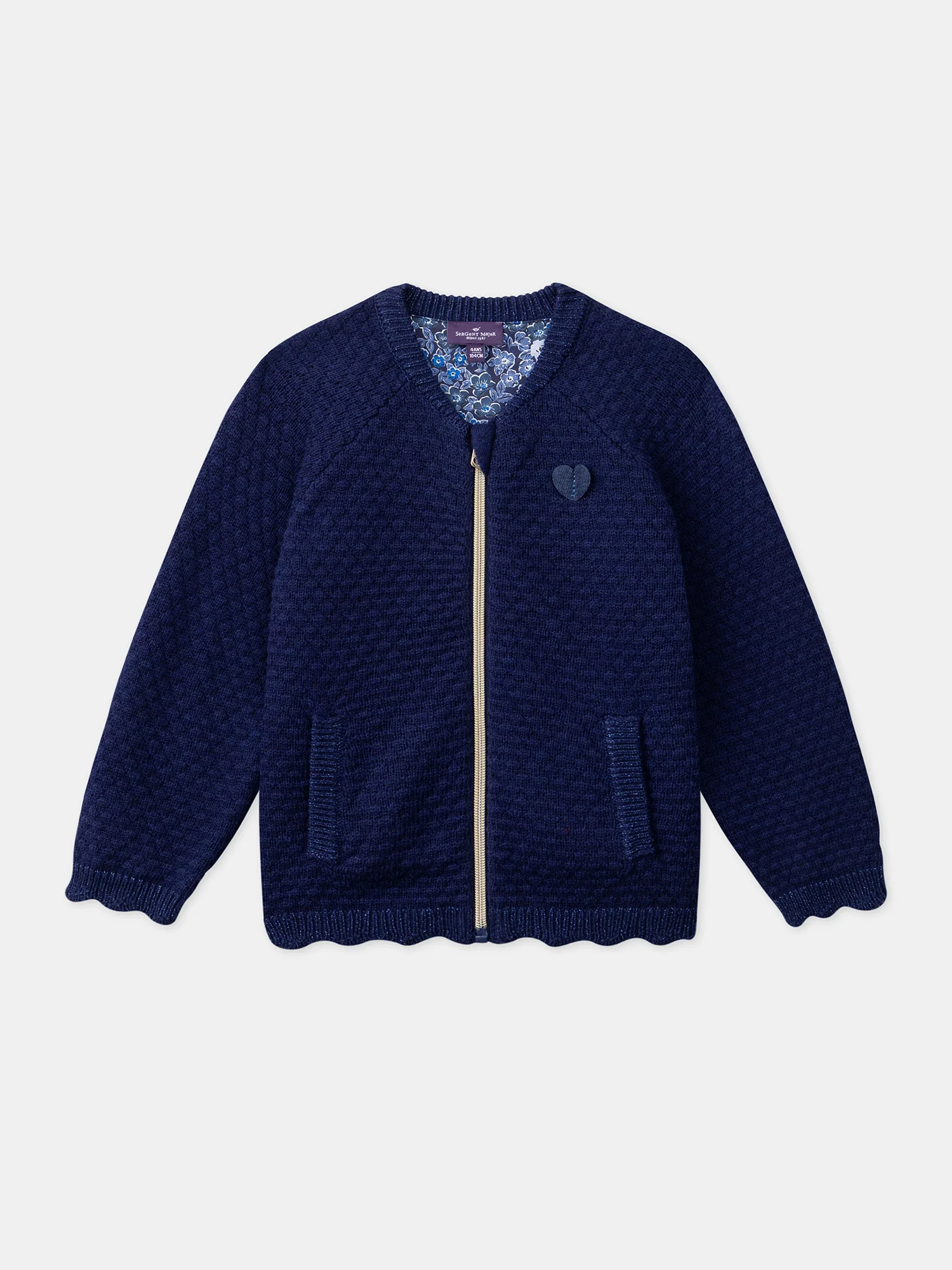 Ce gilet en maille bleu est un ajout charmant et pratique à la garde-robe de votre enfant. Il est doté de 2 poches et d’un coeur décoratif à la poitrine, combinant style et fonctionnalité. Les bord-côtes en fils métallisés violets ajoutent une touche de brillance, tandis que les finitions coquilles en bas de manches et du vêtement apportent une délicatesse supplémentaire. Parfait pour compléter toute tenue avec élégance et confort.