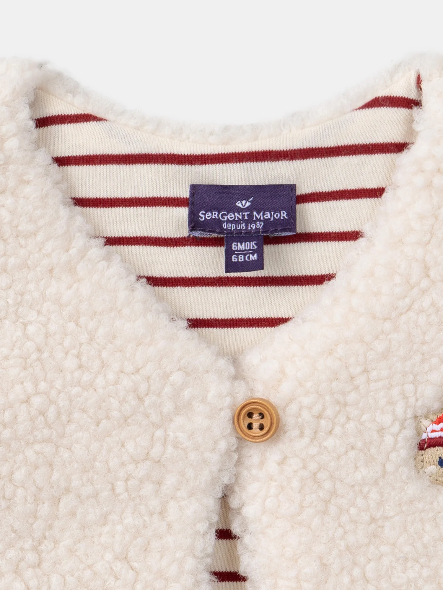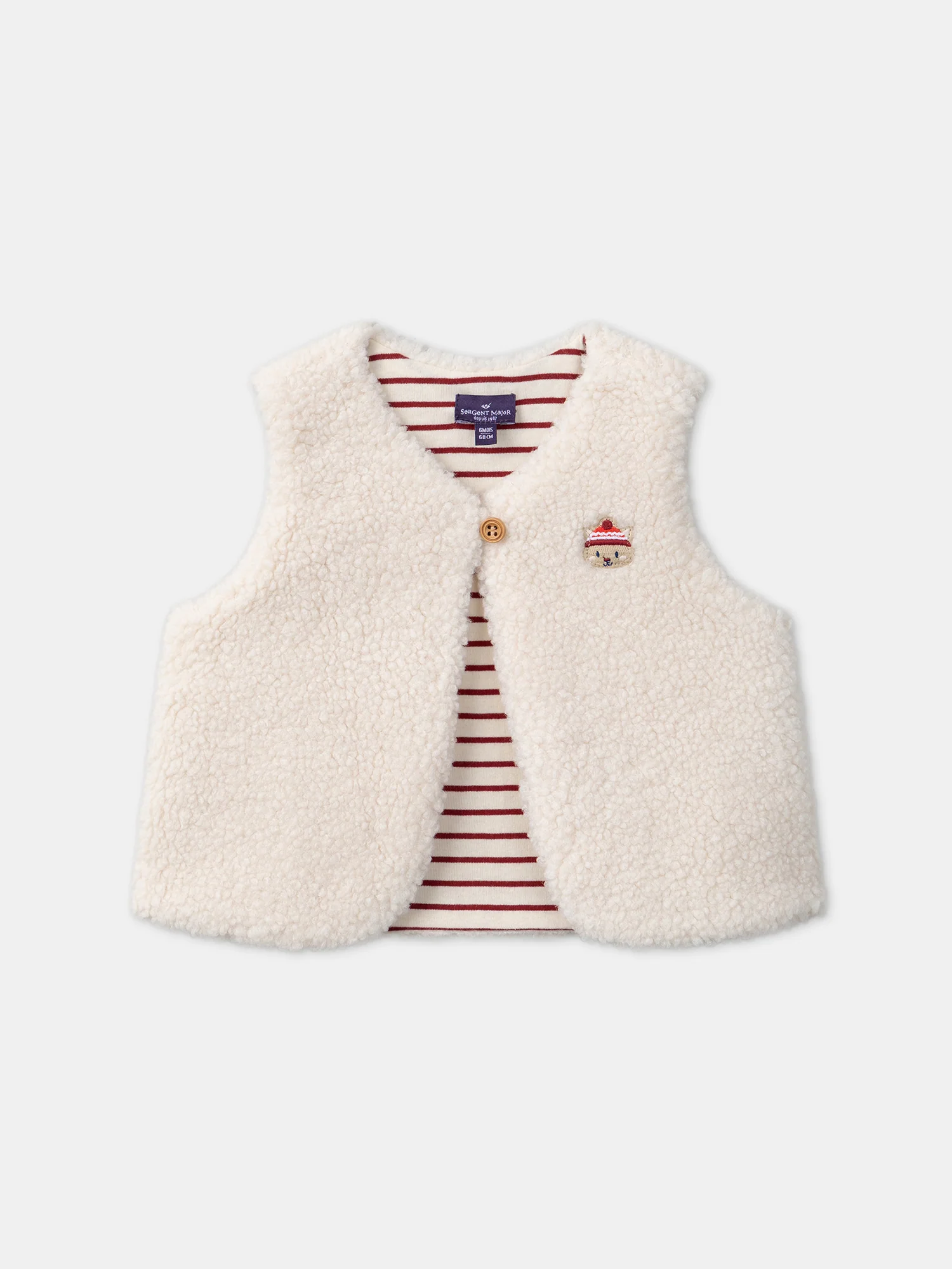 Pour les petits au style audacieux qui aiment se démarquer, ce gilet sans manches en fourrure synthétique est parfait pour la mi-saison. Avec un intérieur rayé rouge bourgogne et blanc cassé, il offre une touche originale tout en étant facile à porter, grâce à son ouverture avant par un bouton en bois. Le patch animal brodé sur le buste ajoute une touche ludique, rendant ce gilet à la fois chic et confortable.
