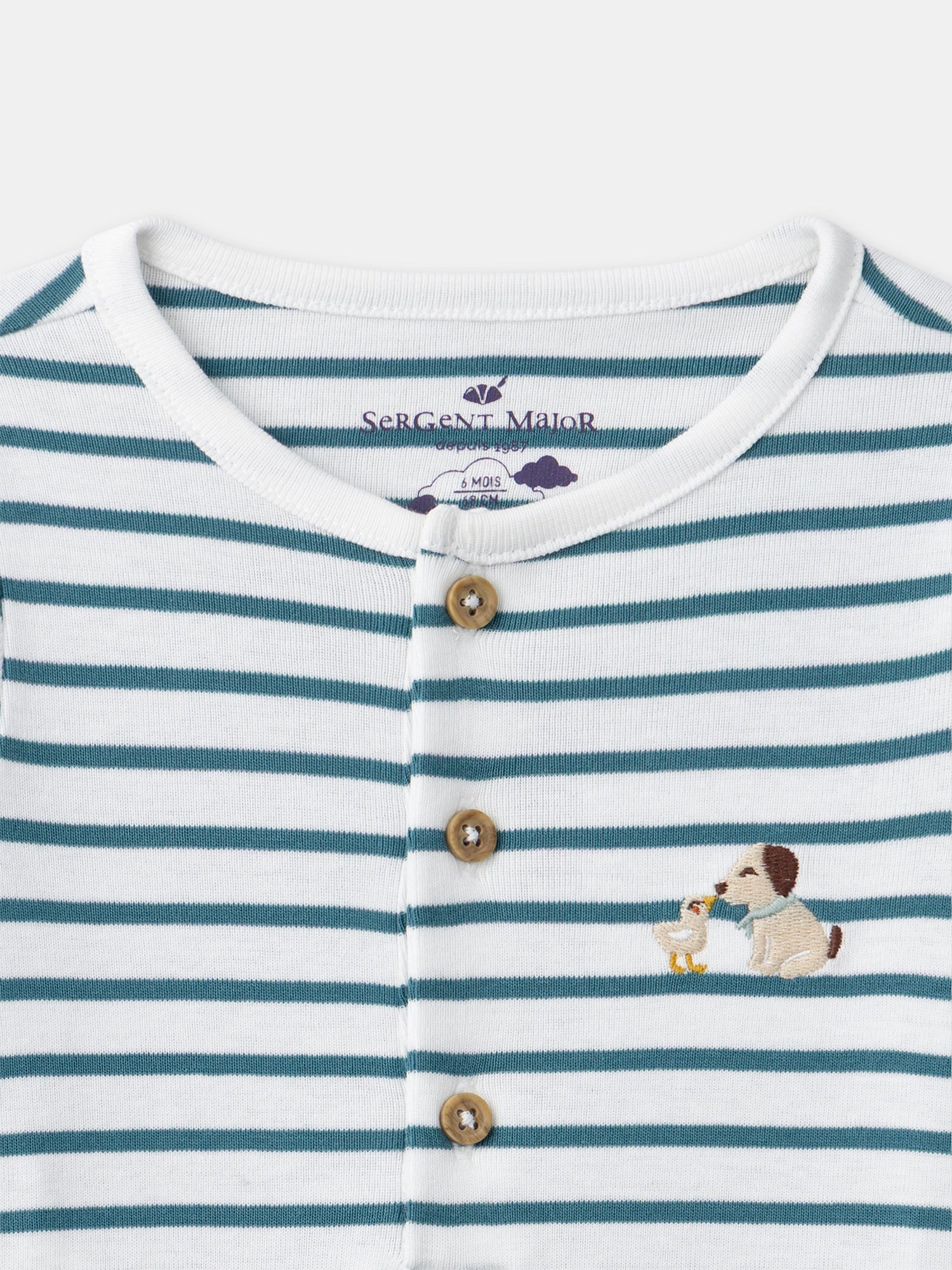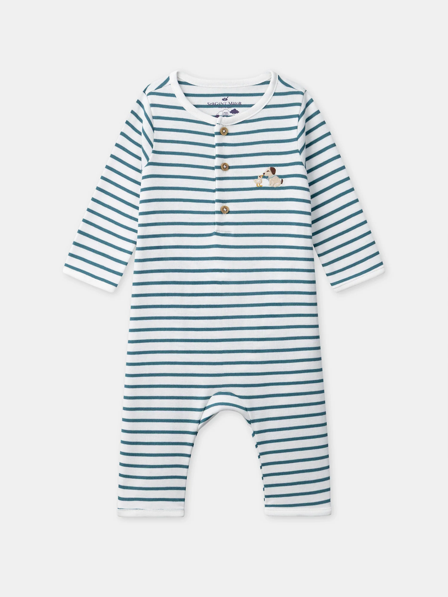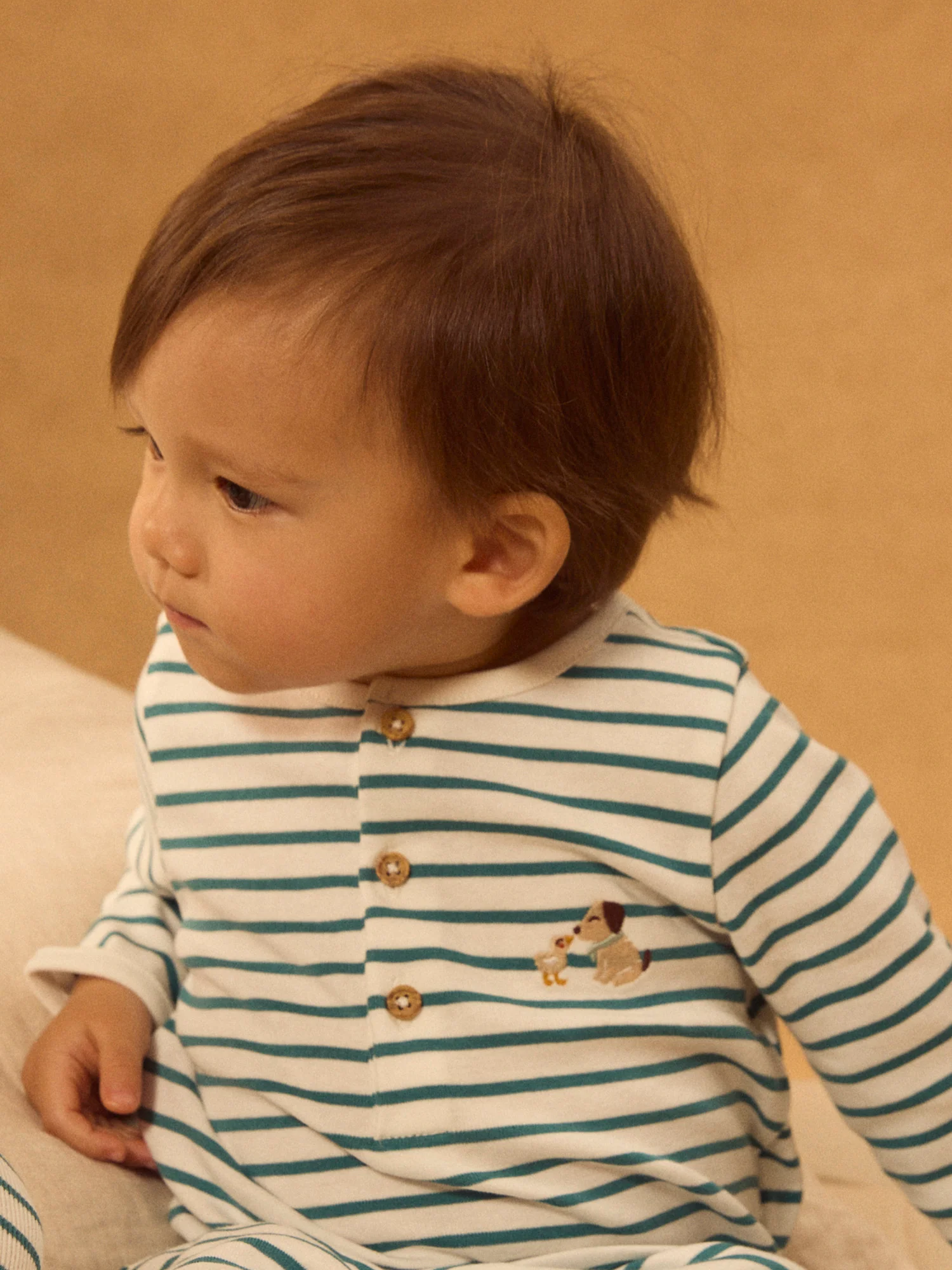 Pensé pour les bébés qui apprécient les vêtements faciles à enfiler au quotidien. Le coton biologique à rayures et la forme sans pression offrent un habillage fluide et confortable. Les petits chiens brodés, les finitions écrues et les boutons imitation bois composent un style doux et naturel.