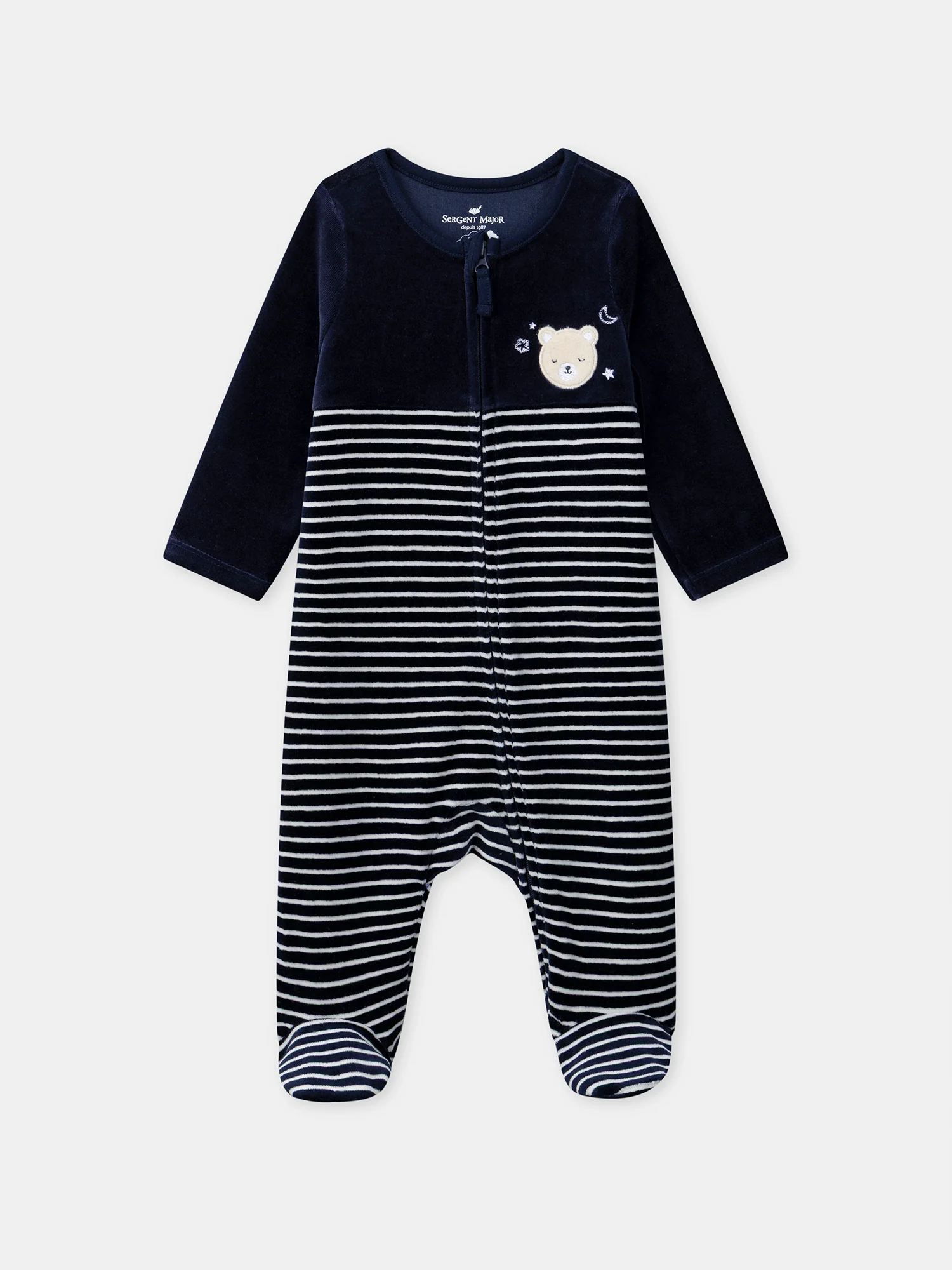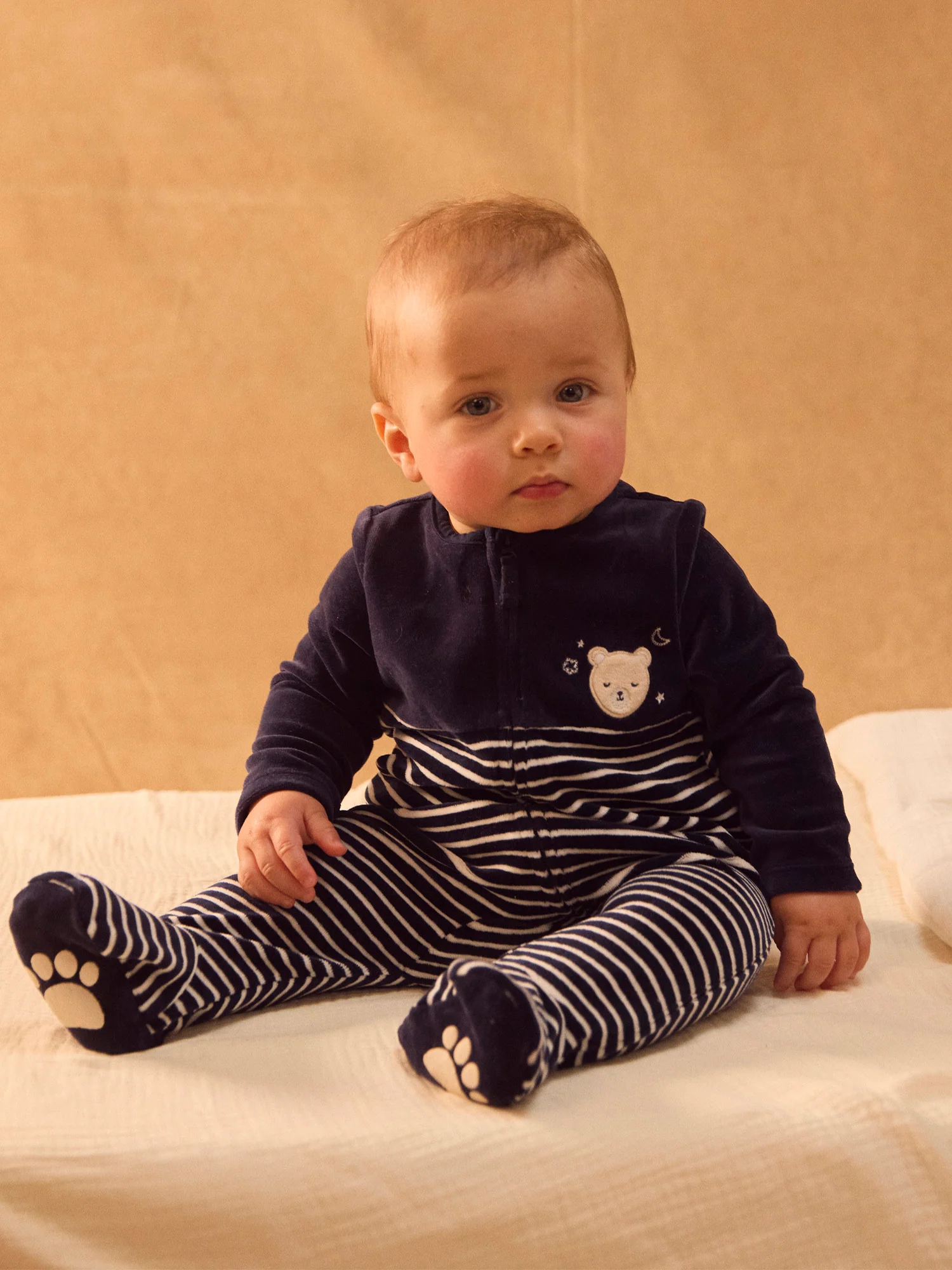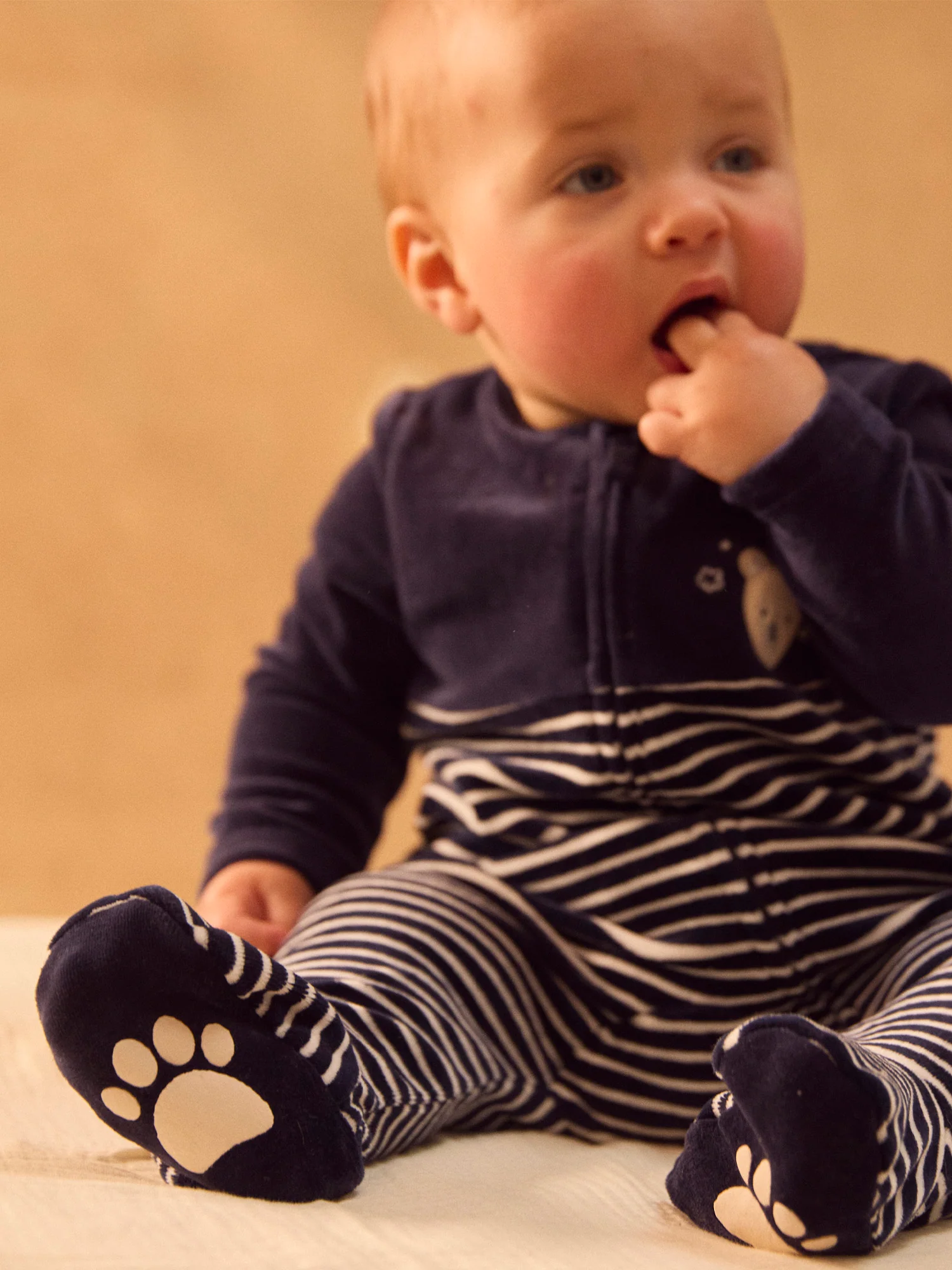 Conçu pour les enfants qui aiment être bien au chaud la nuit, il est parfait pour la saison froide. Sa coupe confortable en velours biologique et recyclé offre une ouverture simple et sécurisée. Les rayures marine, le patch ourson et l’empreinte animale sous les pieds créent un univers doux et rassurant.