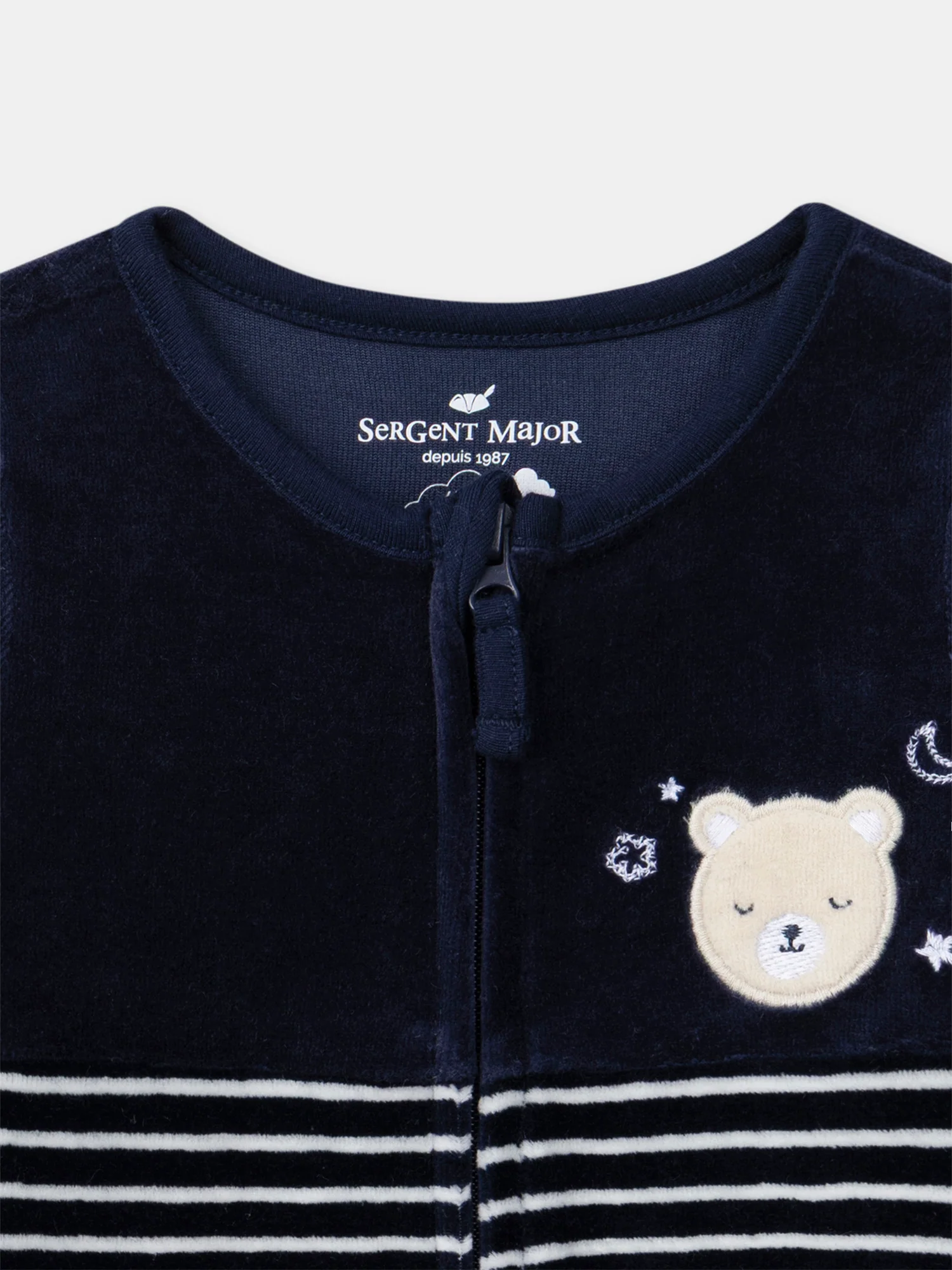 - Bas de la grenouillère en velours rayé écru et bleu marine