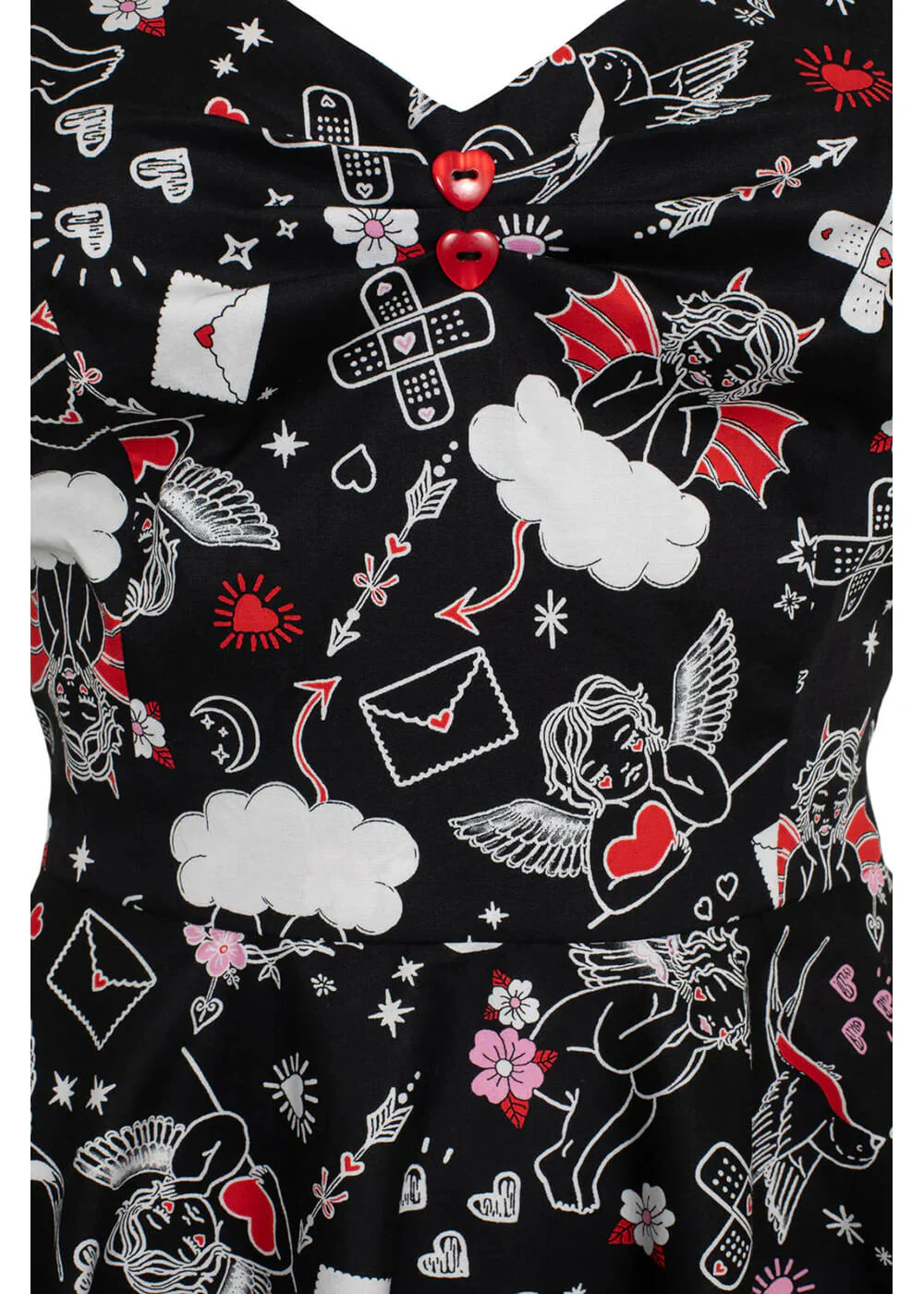 – Print featuring tattoo motifs like cherubs, hearts, swallows & flowers
