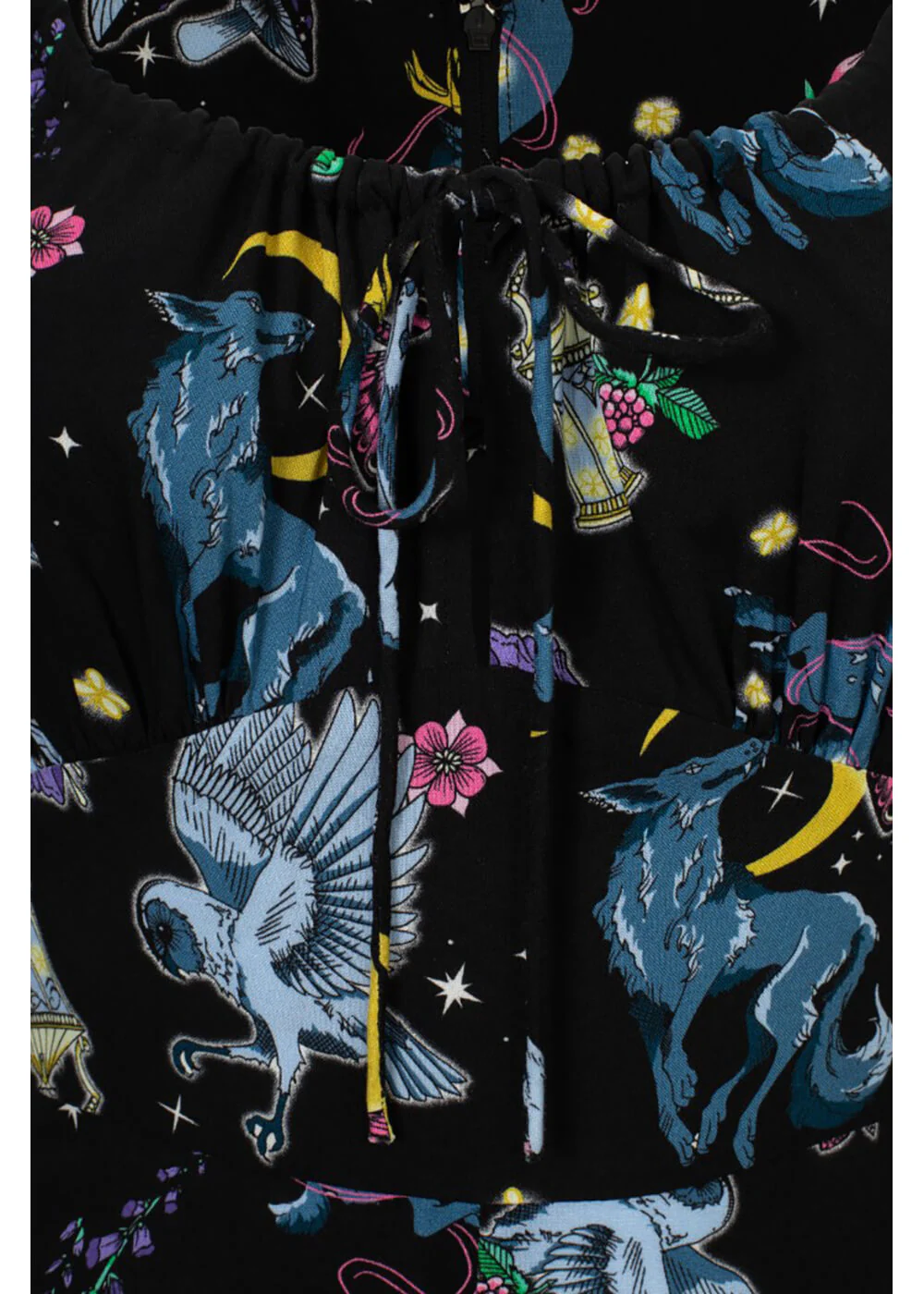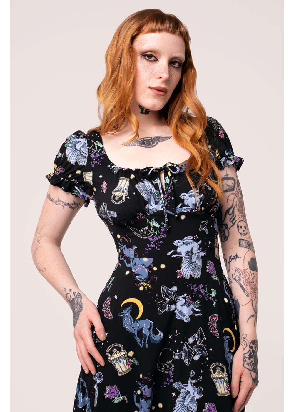 What you can encounter in the dead of night: majestic moons, mushrooms, wolves… All that magical nocturnal life dances with you on airy viscose that moves with every step. It’s time for a dark girl summer!