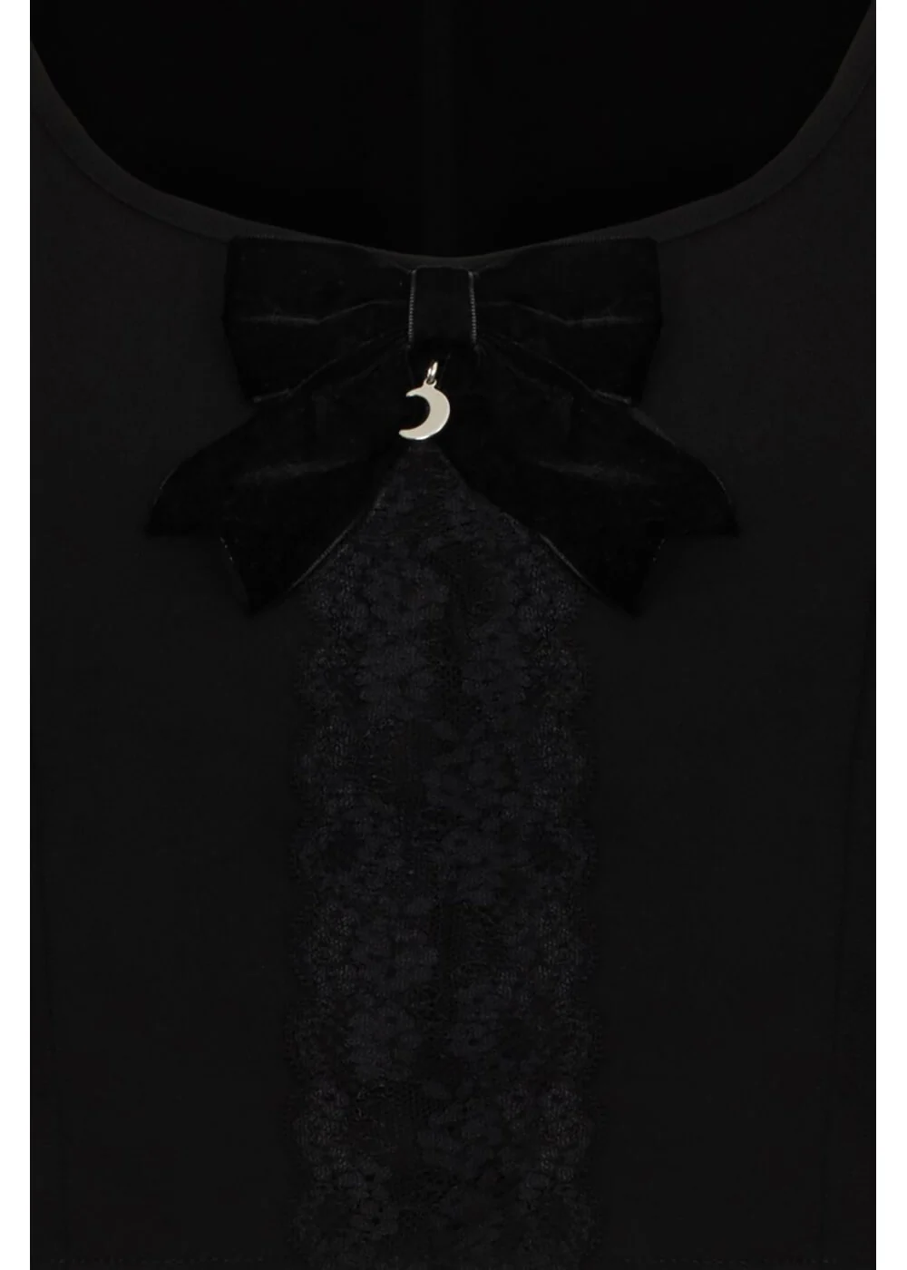 For your new favorite gothic look or classic 40s, cottagecore, or witchy-chic: this elegant black top with a velvet bow offers endless styling possibilities! Its sheer black floral sleeves dance around you whether you are in the woods or at the office. No matter what captures your heart, Nocturnal fits in perfectly. ♥