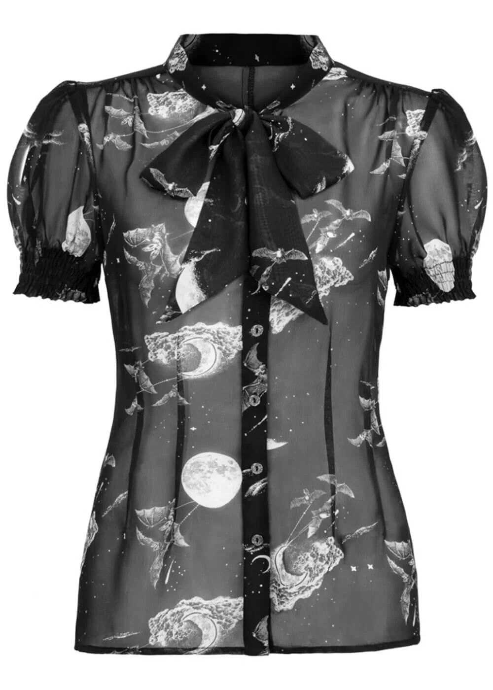 She is smooth, light and mysterious; she is your favourite new item of clothing! Meet this daring semi-transparent blouse from Hell Bunny, featuring an exciting print with moons, clouds and bats. This darling might just flutter straight into your shopping basket!