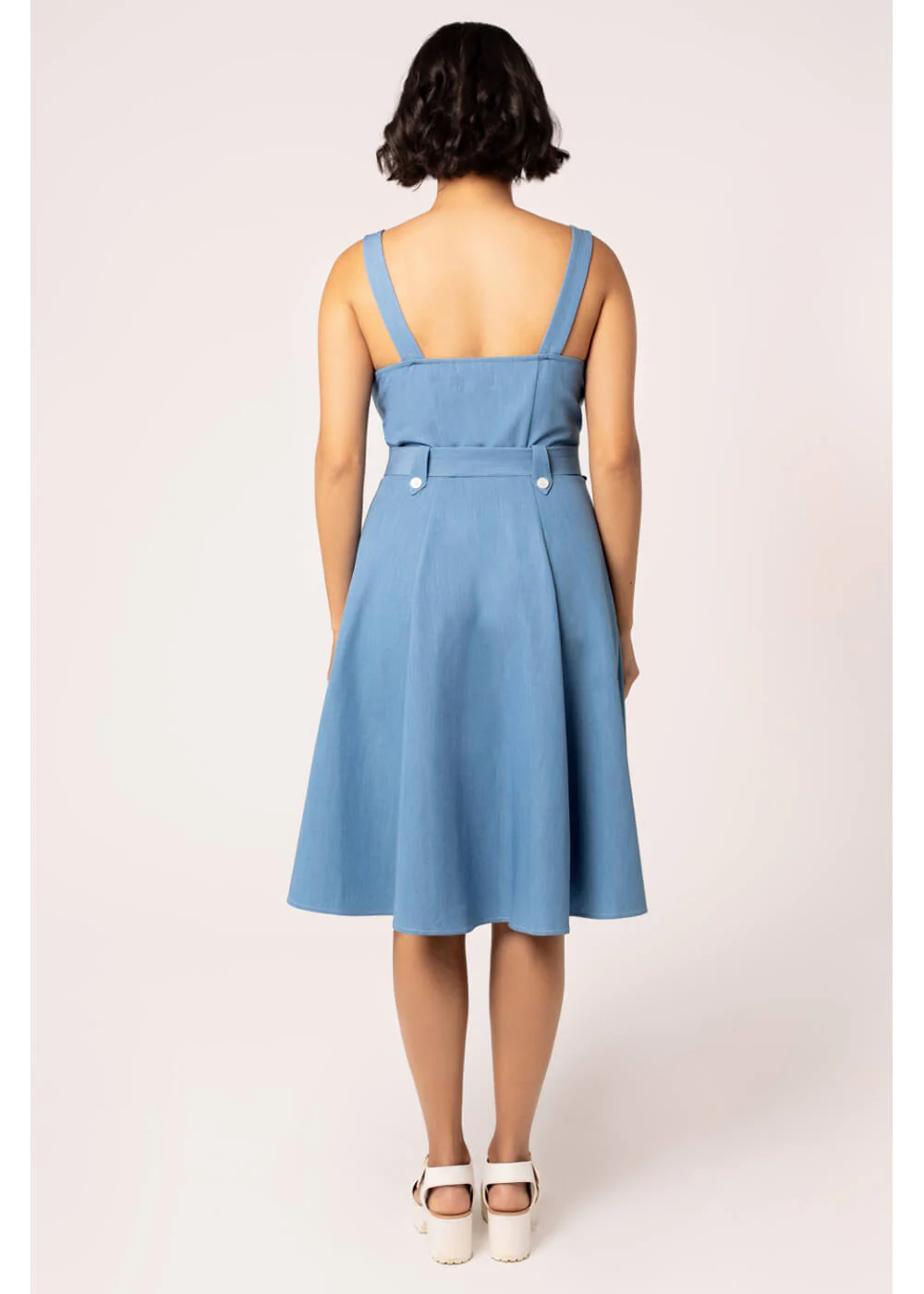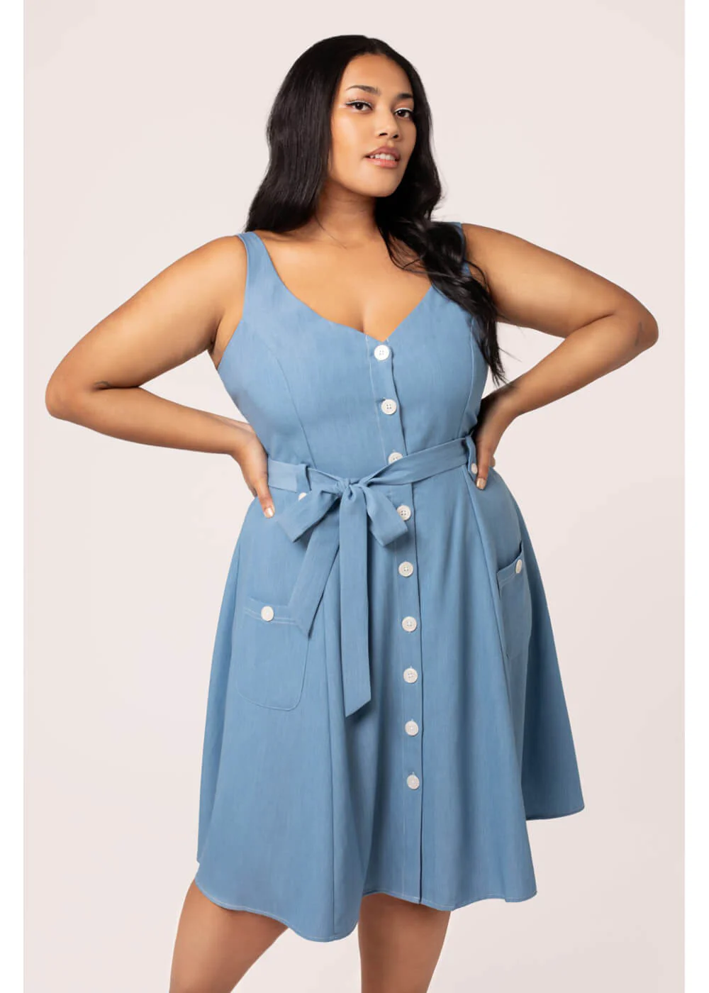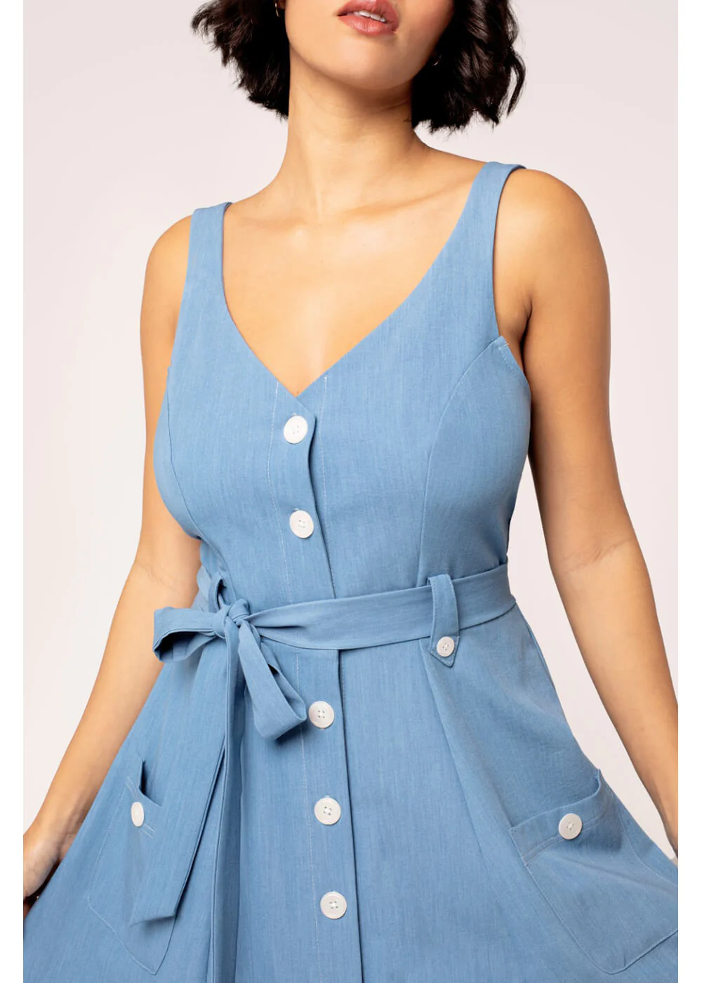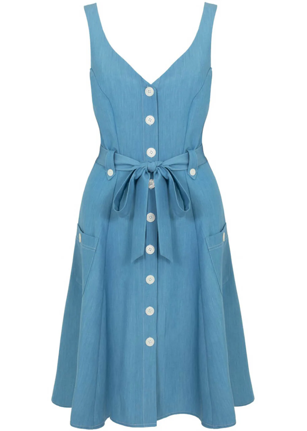 For a delightful summer look, this swing dress is a must-have! The lightweight, flowing fabric dances happily in the refreshing summer breeze, while the white buttons, tie belt, and sultry v-neckline provide the carefree retro vibe you crave in warm weather. Off to the sun!