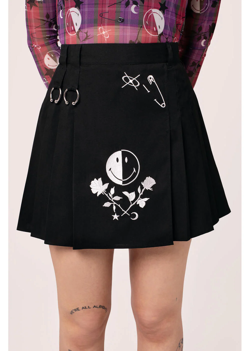 Hell Bunny and Smiley together create the perfect balance between cheerful and dark! Naturally, a good dose of playfulness cannot be missing, so you’re going to thoroughly enjoy this pleated skirt that not only features your favorite color but is also adorned with cheerful smiley details. Let everyone around you laugh along!