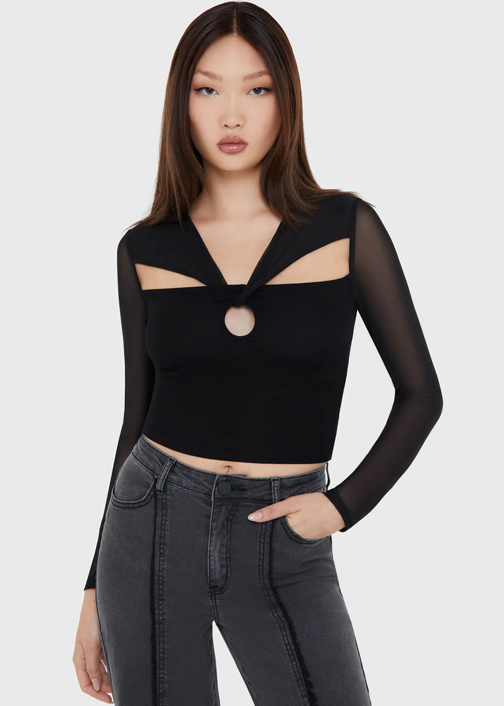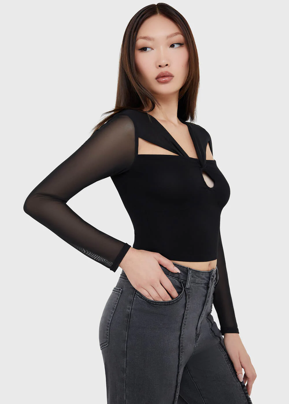 Ink Of Night is the perfect ‘I don’t care, and I know I look good’ top, featuring its mesh sleeves! The twist of the keyhole neckline to the shoulders creates a stunning appearance, and let’s be honest: you deserve it!