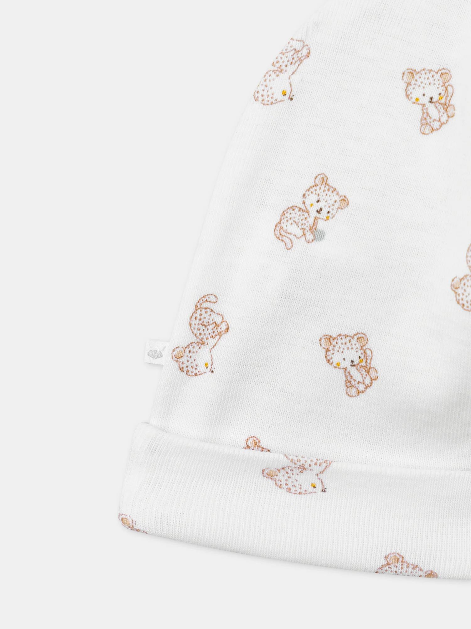 - Bonnet à côtes avec imprimé léopards dans les tons noisette et vert amande sur fond écru