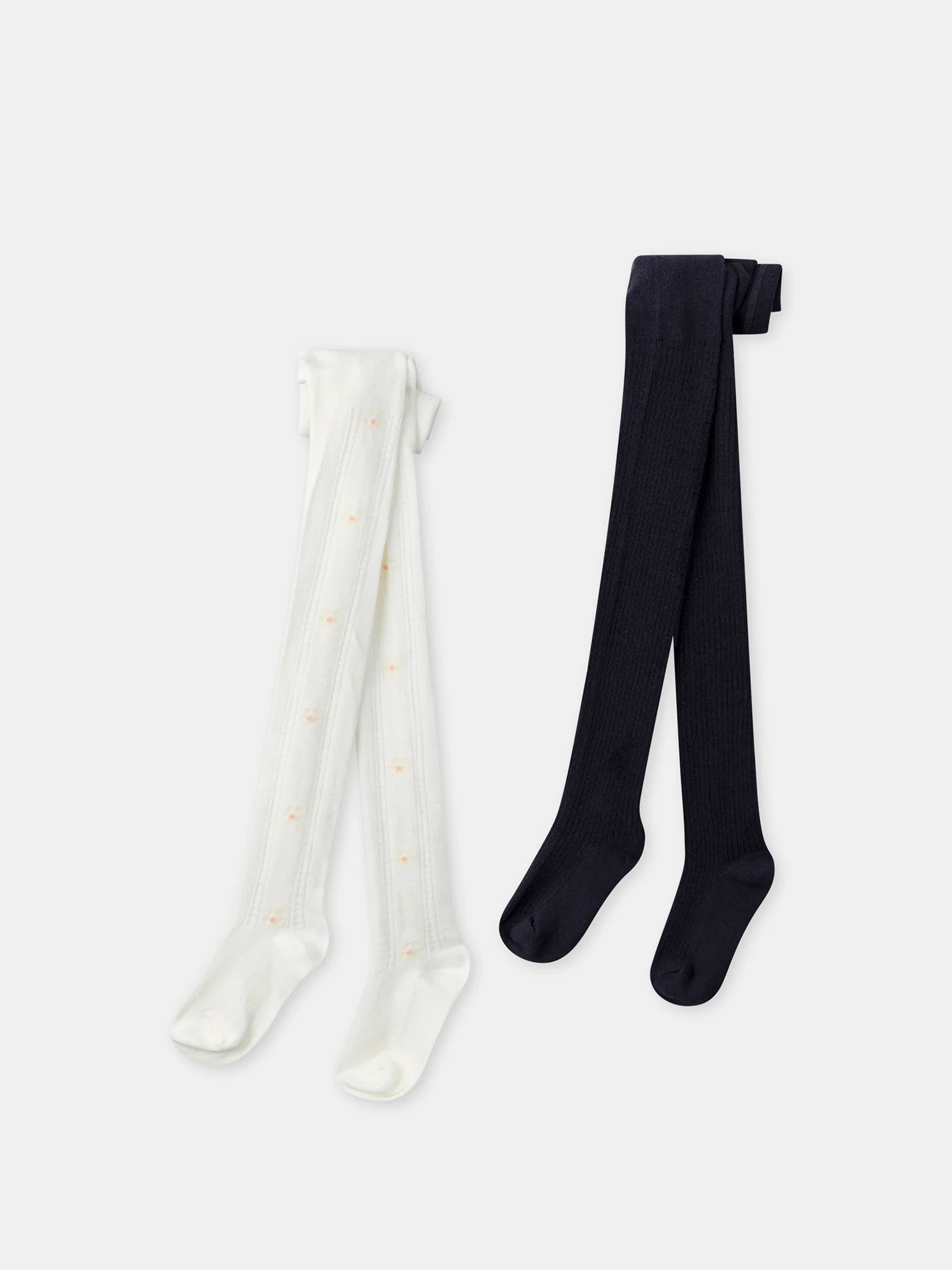 Pour compléter les tenues hivernales. Les deux mailles assurent confort et variété. Les motifs fleurs et les teintes sobres s’adaptent à toutes les robes. Collant 1 : Ecru tresse fantaisie avec fleurs Collant 2 : Côte uni marron foncé Ce produit appartient à l’Histoire N°3 : Exploration Lointaine.