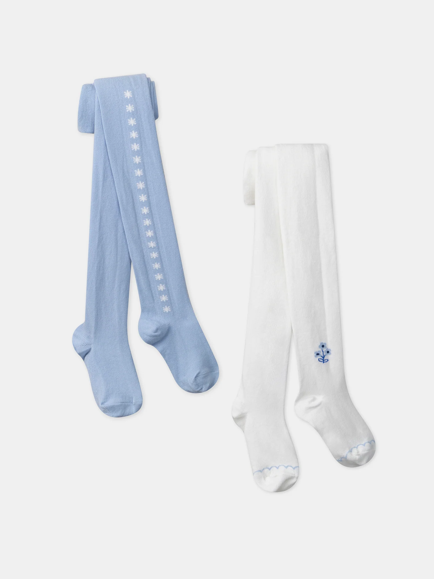Ce lot de 2 collants fantaisie ajoutera une touche délicate aux tenues de votre enfant. Le premier collant est de couleur bleu ciel avec une tresse de fleurs sur le côté, tandis que le second est écru avec un jacquard fleur au niveau de la cheville et un détail coquille sur le pied. Un duo élégant et original pour chaque occasion.