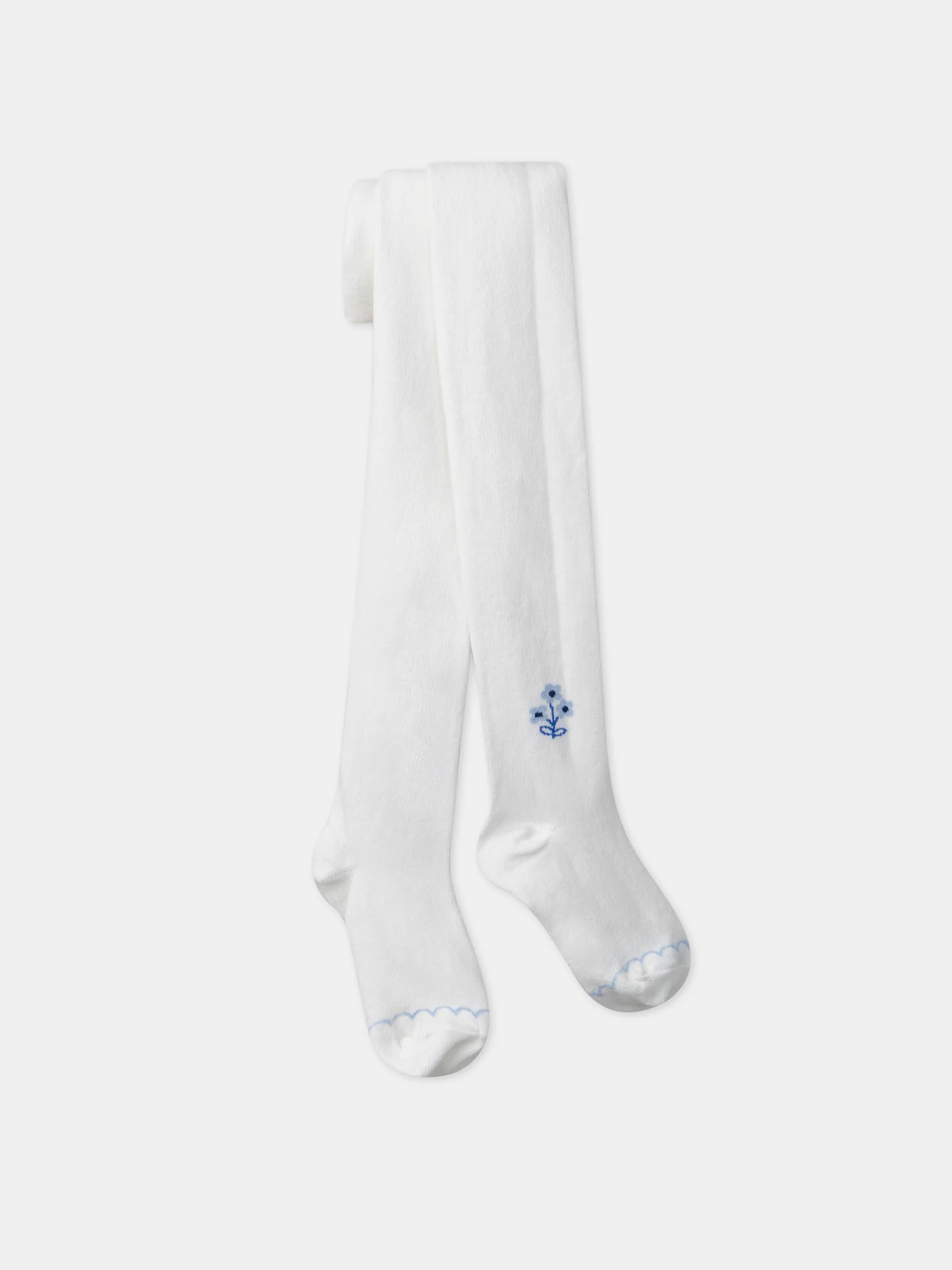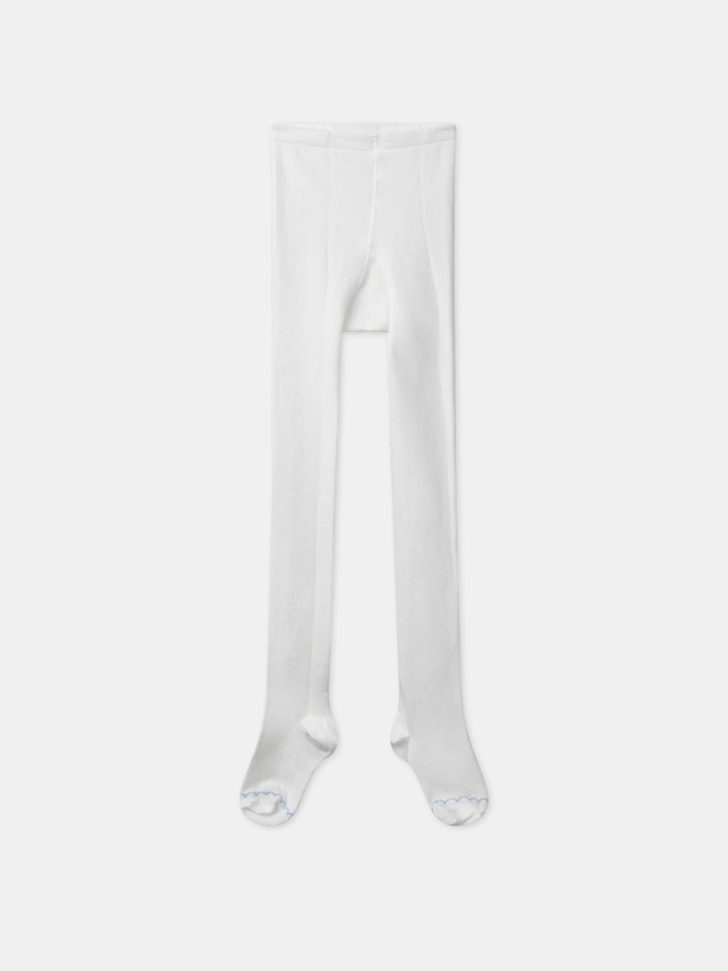 • Un collant écru, jacquard fleur au niveau de la cheville, détail coquille sur le pied