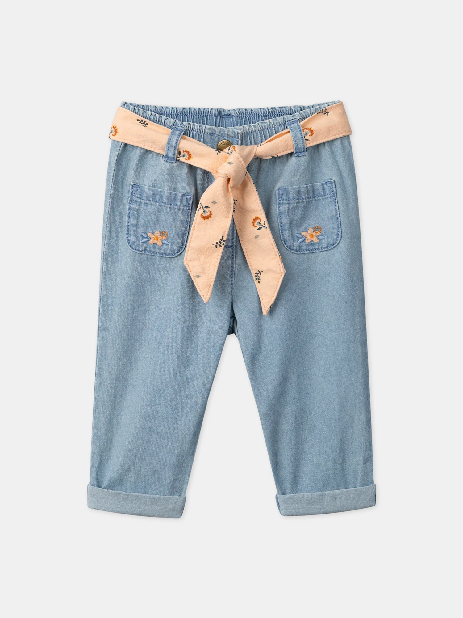 Ce pantalon en denim est idéal pour un enfant dynamique et plein de vie, à porter durant la saison printanière. Composé d’un denim léger et confortable, il présente une taille élastiquée avec un bouton à pression pour un ajustement facile. Avec ses poches plaquées ornées de broderies florales orange et bleu foncé, ainsi que sa ceinture amovible à imprimé fleuri, il apporte une touche colorée et originale à la garde-robe.