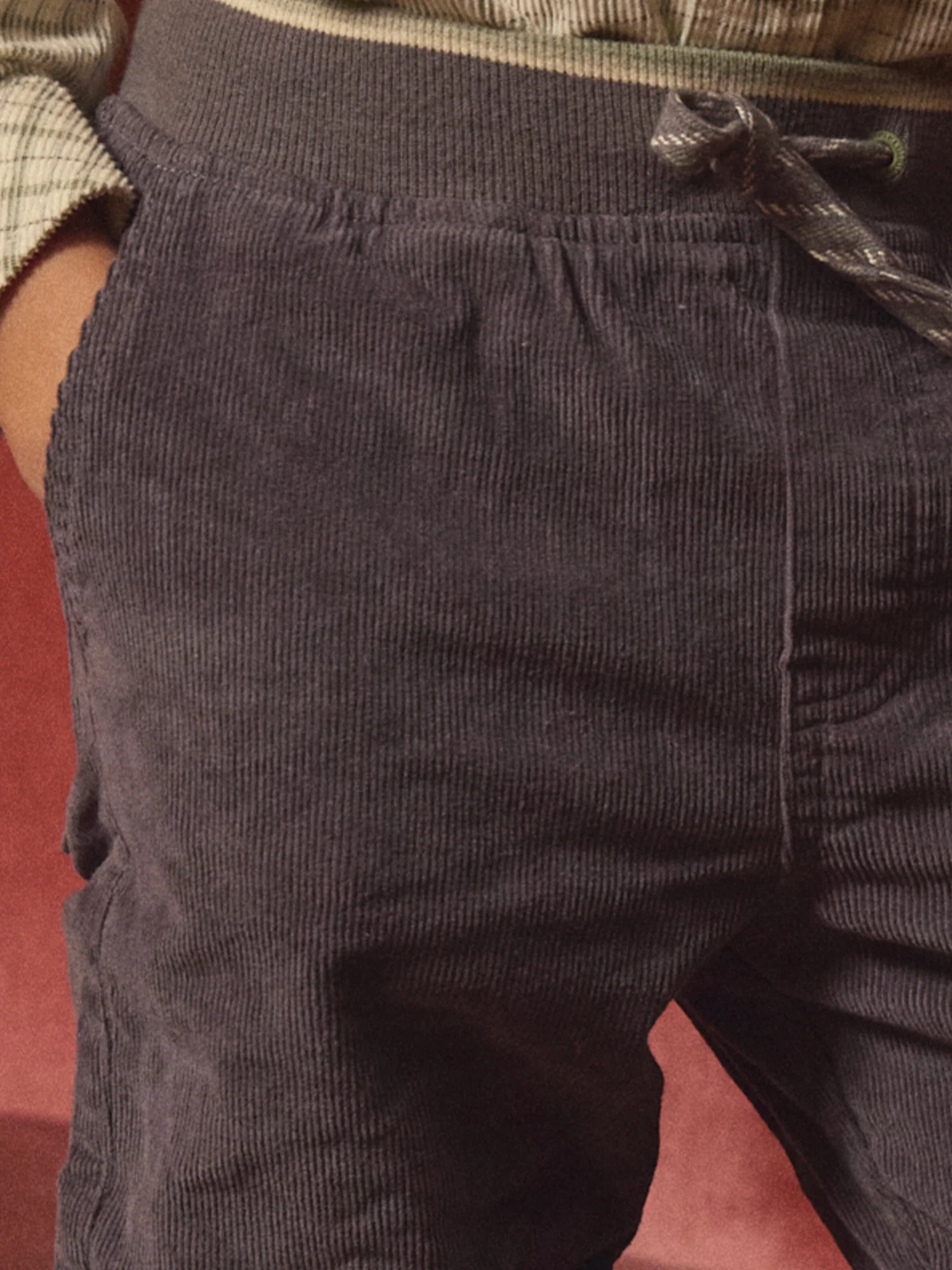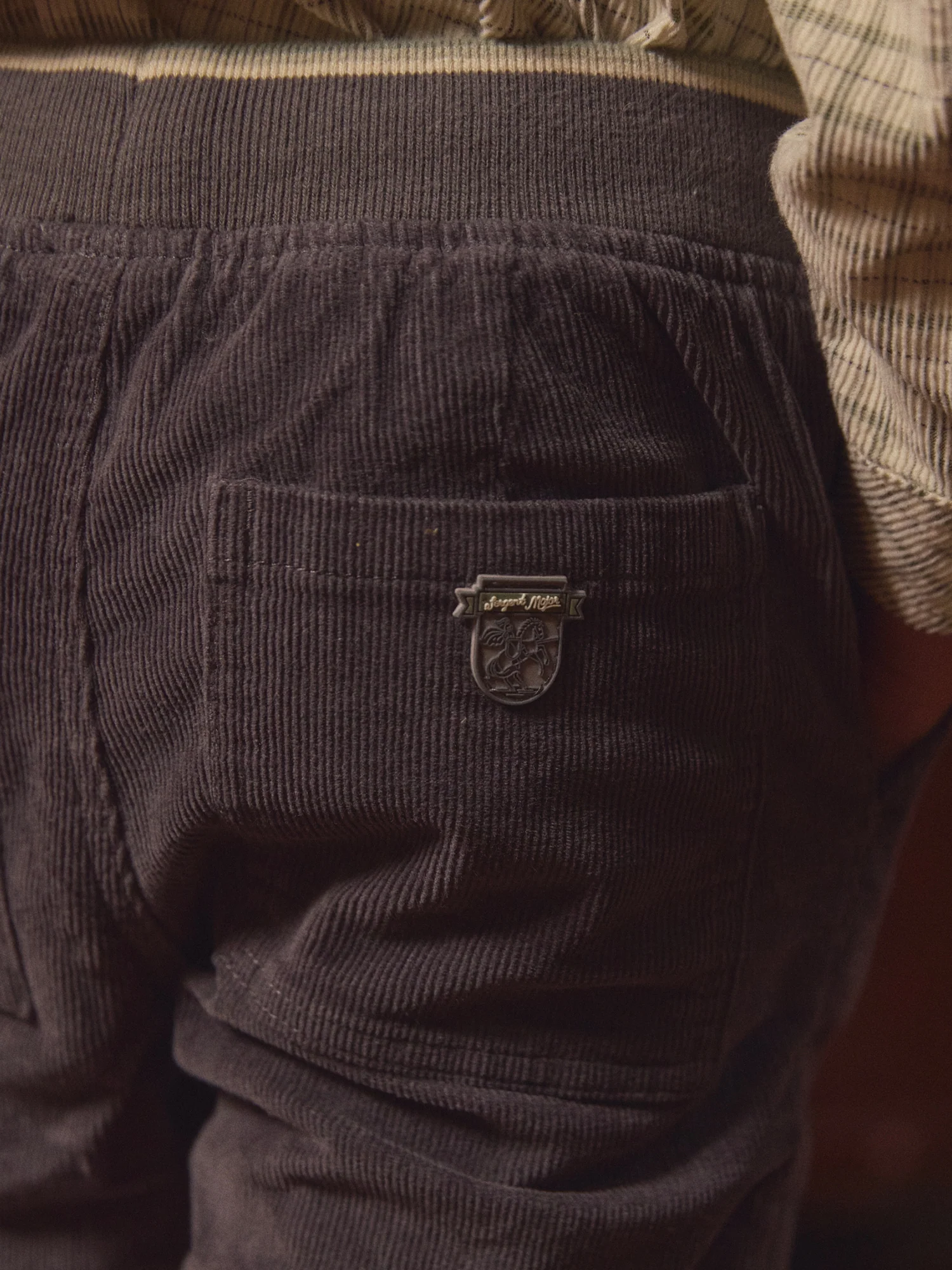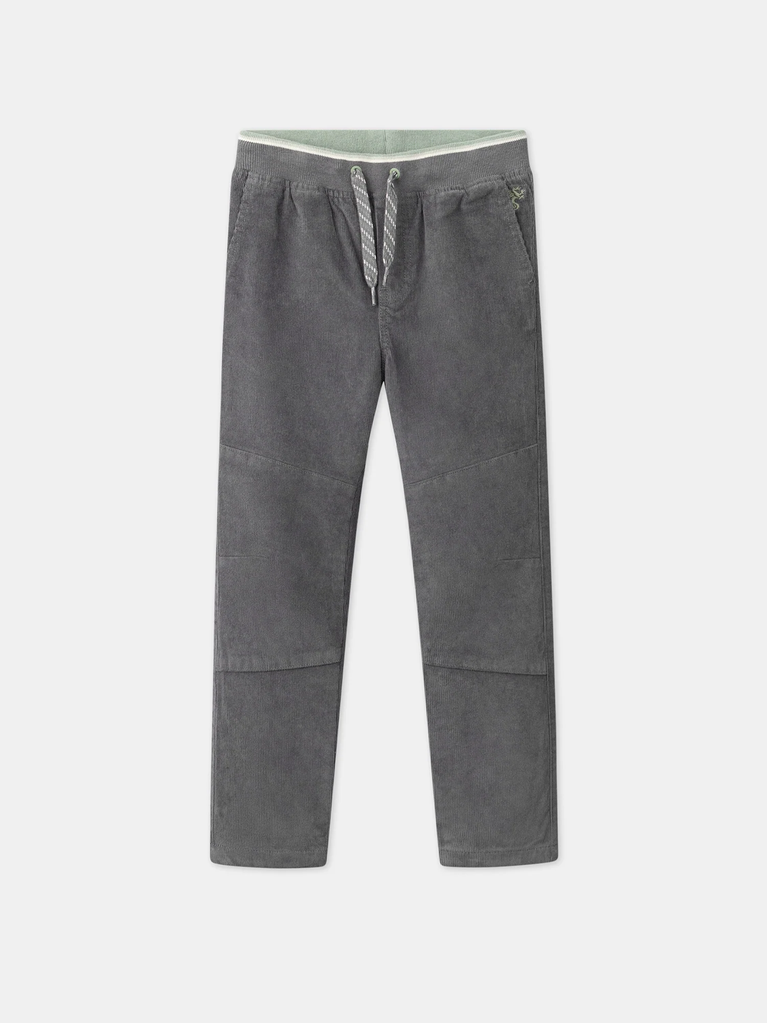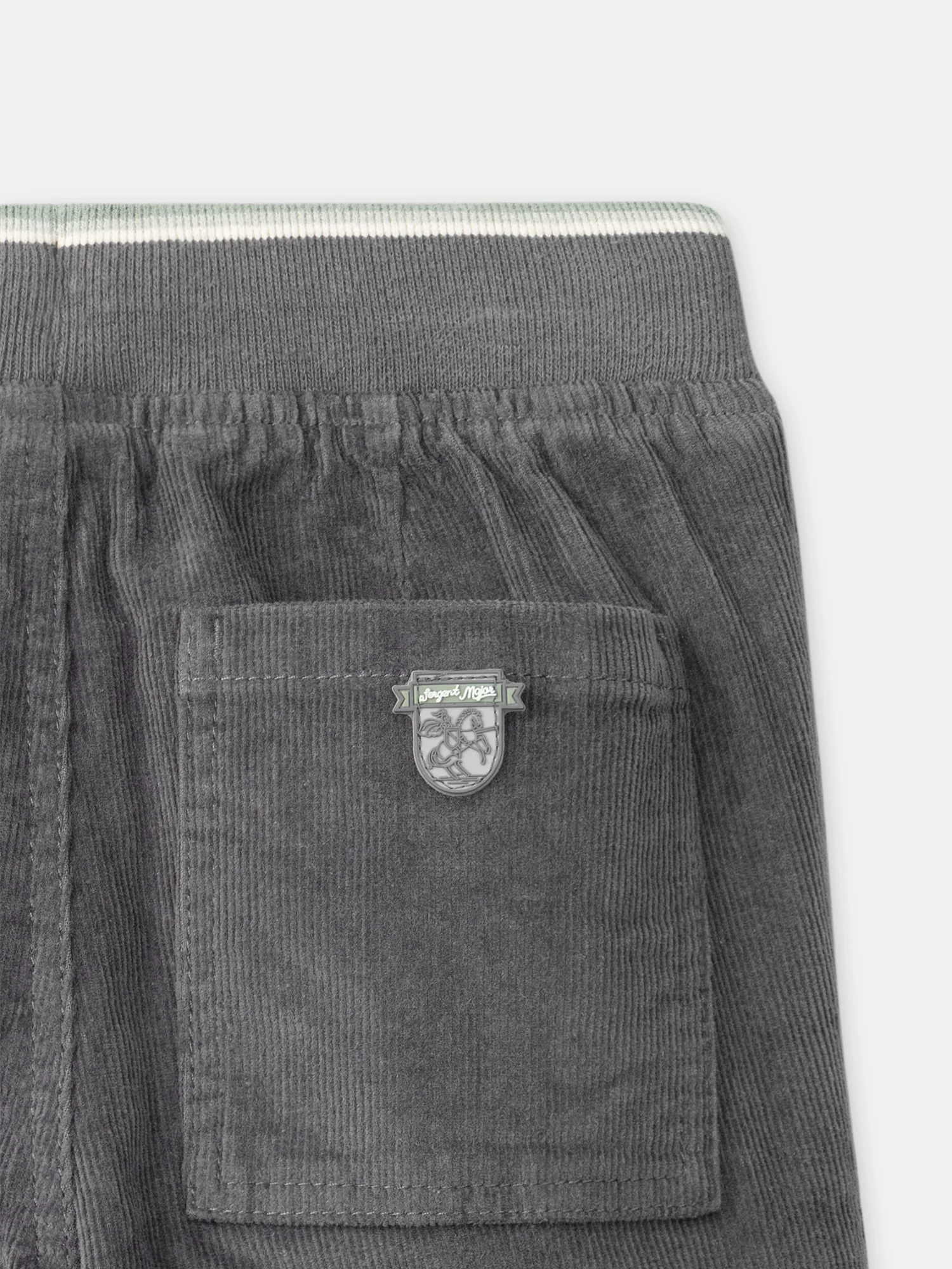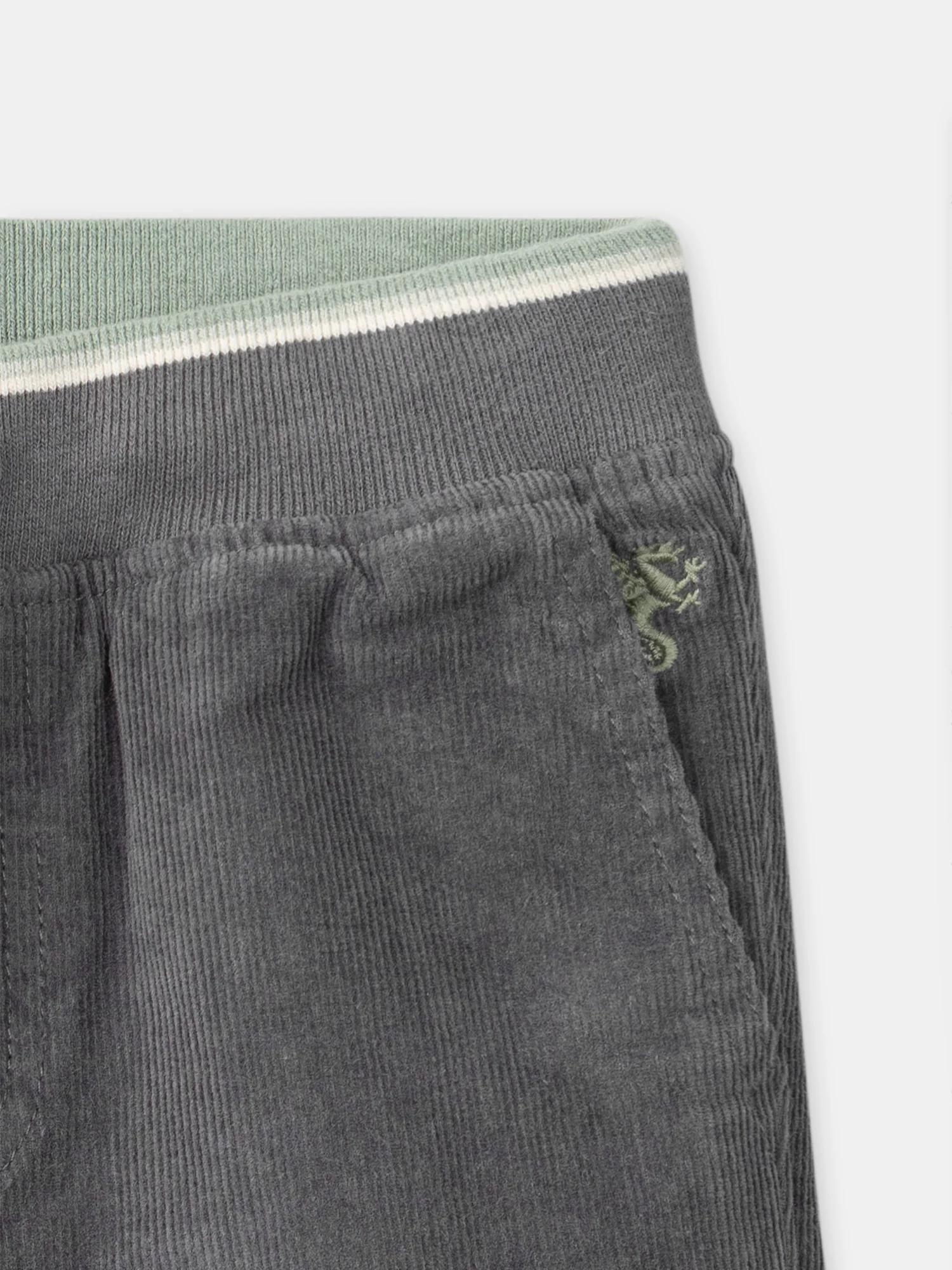 Ce pantalon gris en velours est à la fois confortable et stylé. Il est doublé en jersey pour un port agréable et présente une fausse fermeture sur l’avant. Avec quatre poches deux sur les côtés et deux à l’arrière il est pratique, tandis que la broderie dragon sur l’avant et le patch sur la poche arrière ajoutent une touche de personnalité.