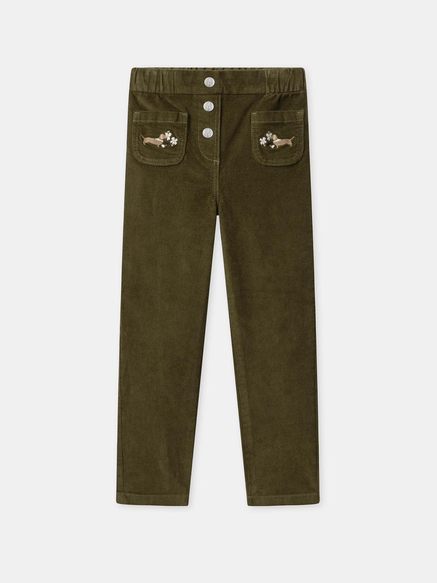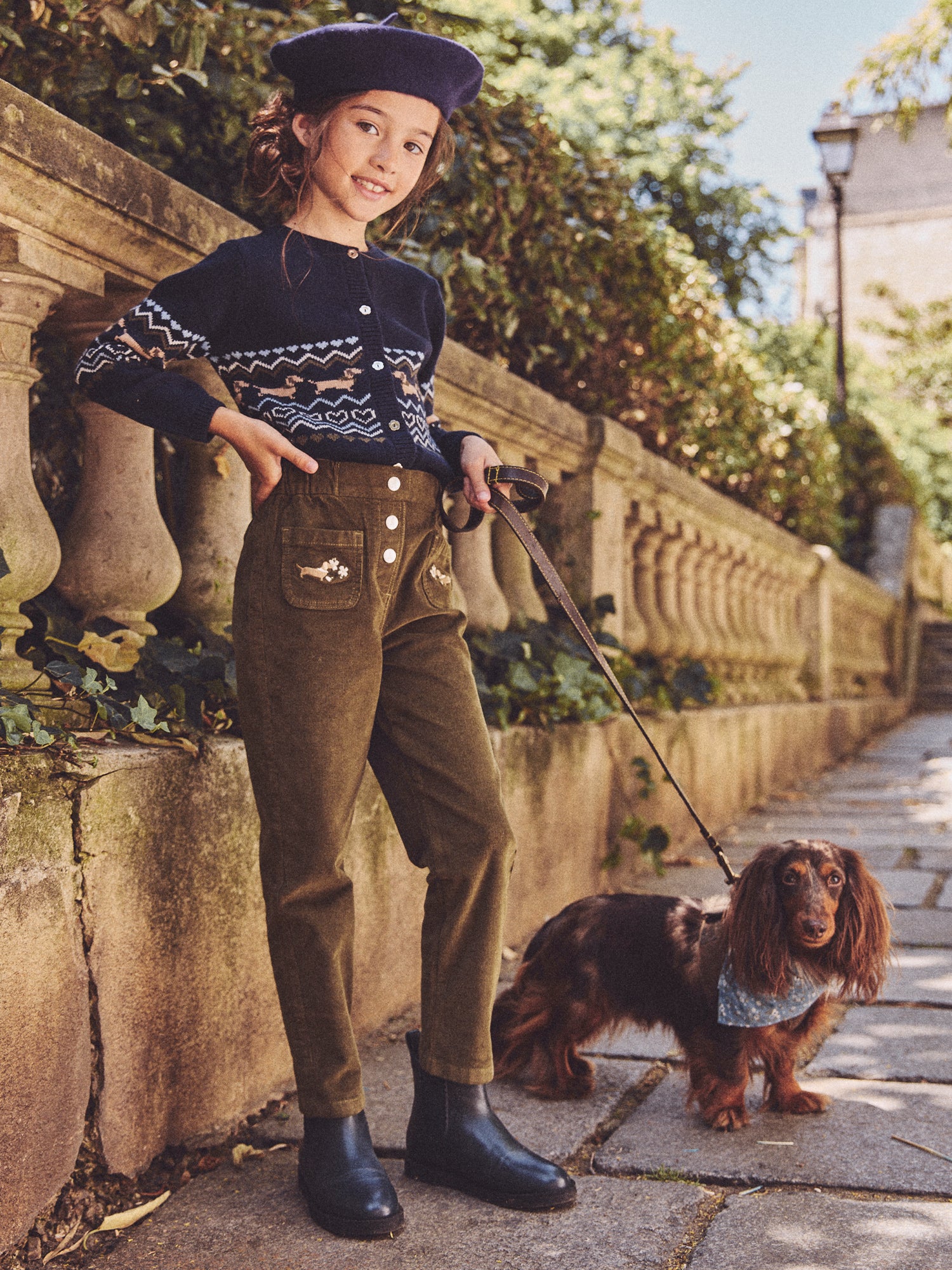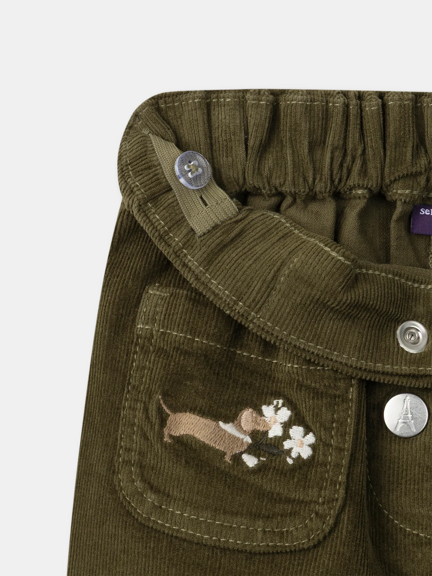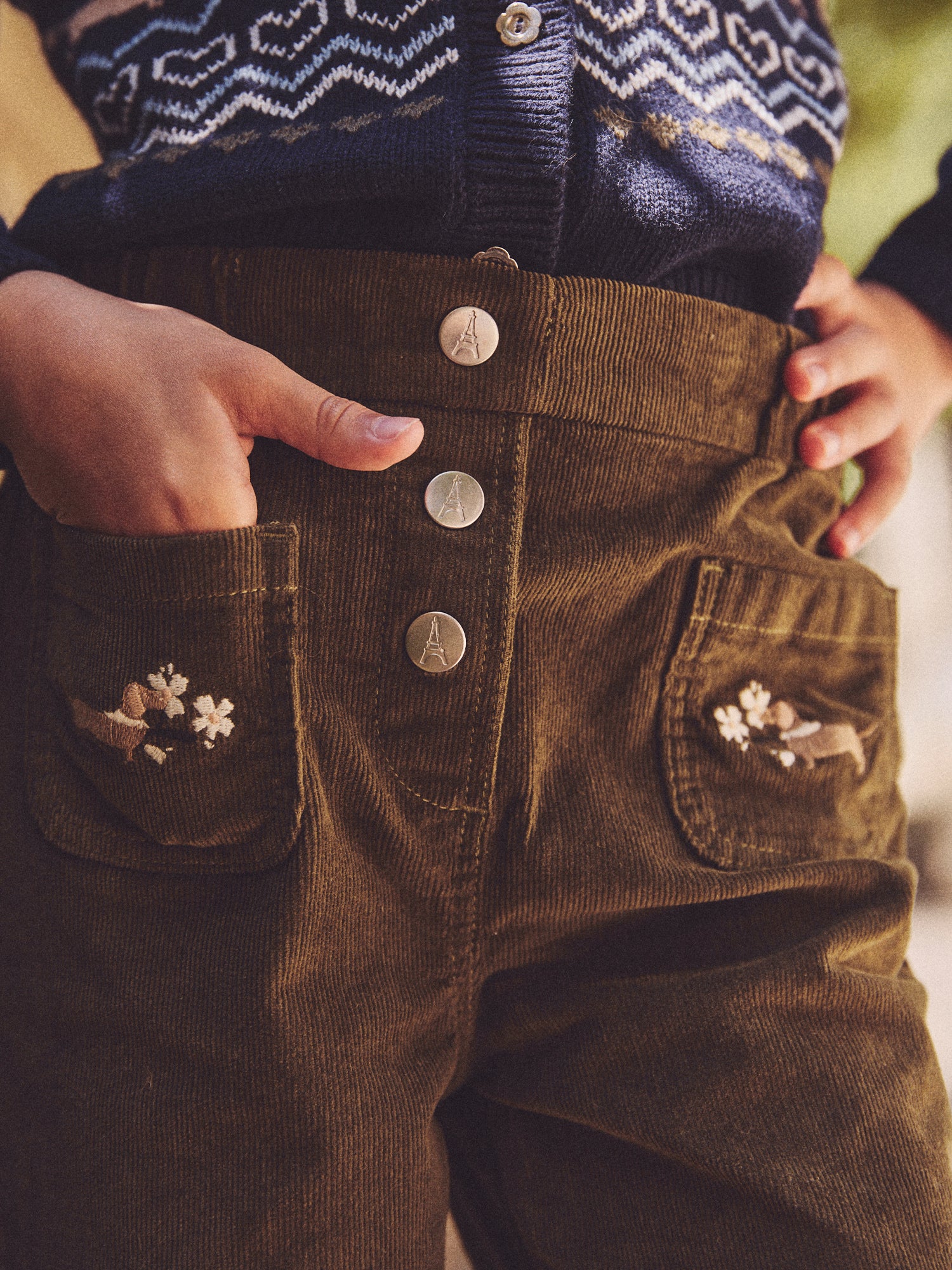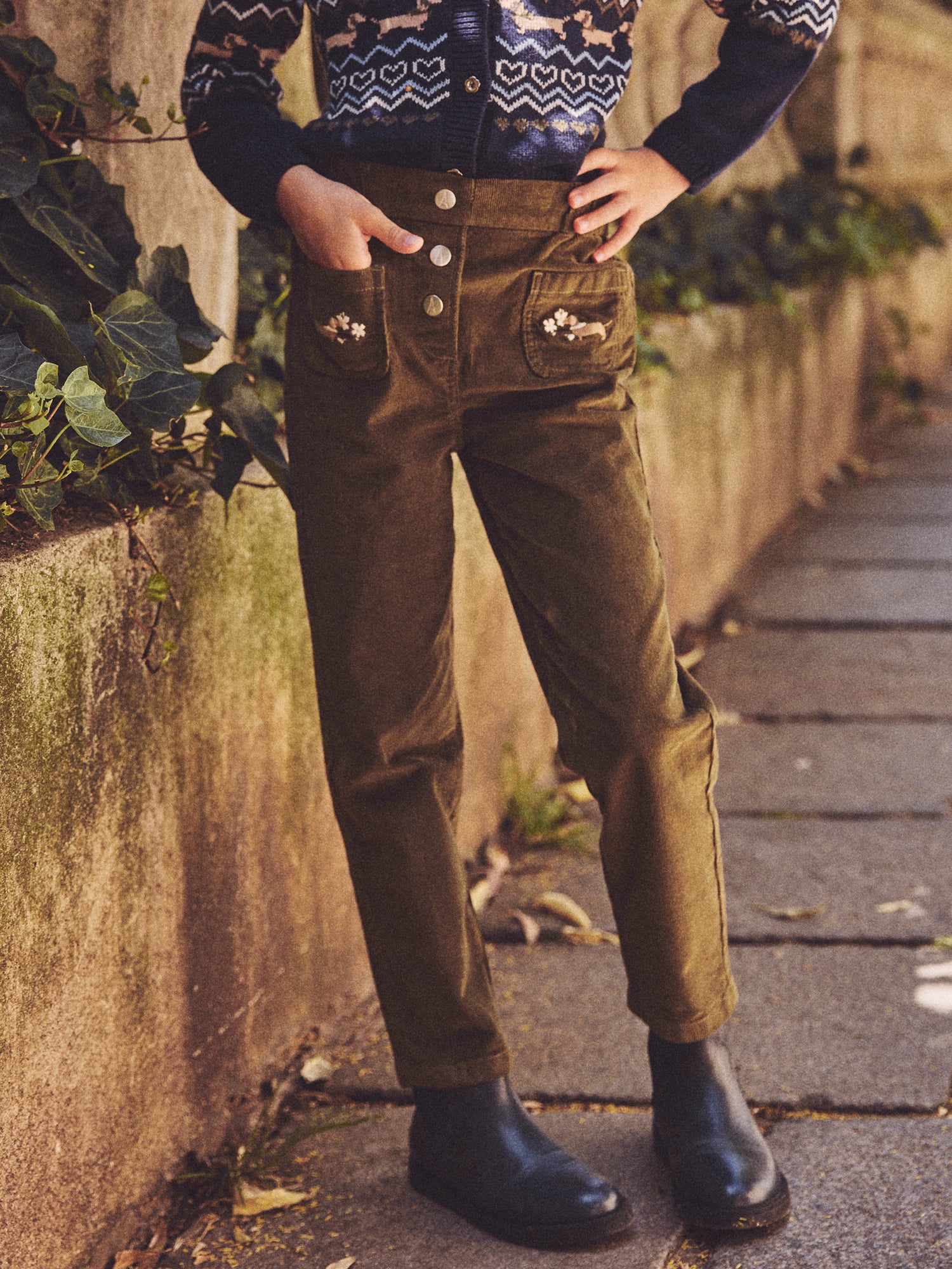 Pensé pour les petites aventurières des saisons fraîches, ce pantalon vert kaki en velours offre confort et style avec sa coupe carotte. Il est équipé de deux poches côtés brodées et d’une taille élastiquée avec élastiques ajustables pour un ajustement parfait. Sa fermeture zippée à partir de 8 ans facilite l’habillage tout en conservant une grande liberté de mouvement.