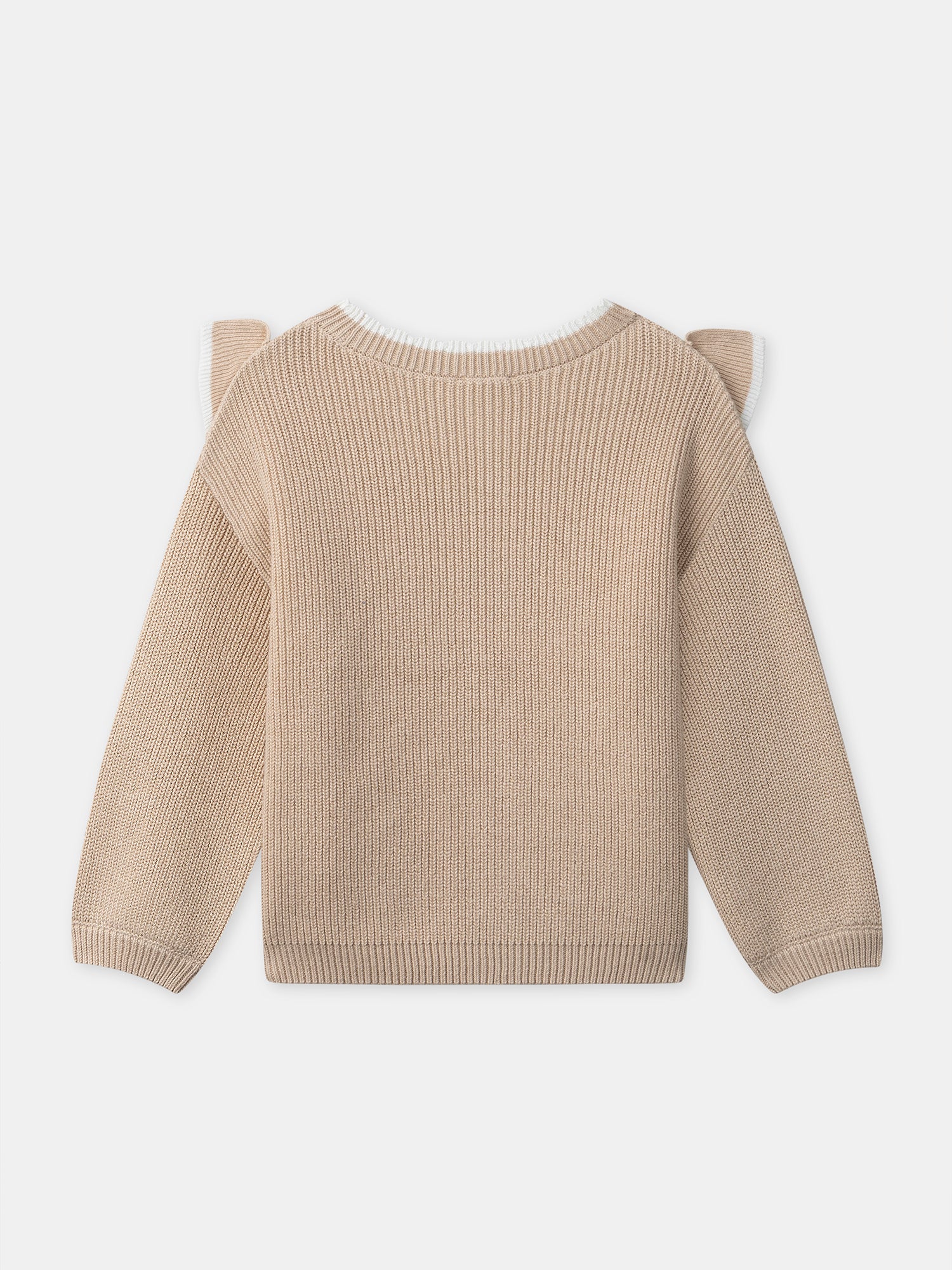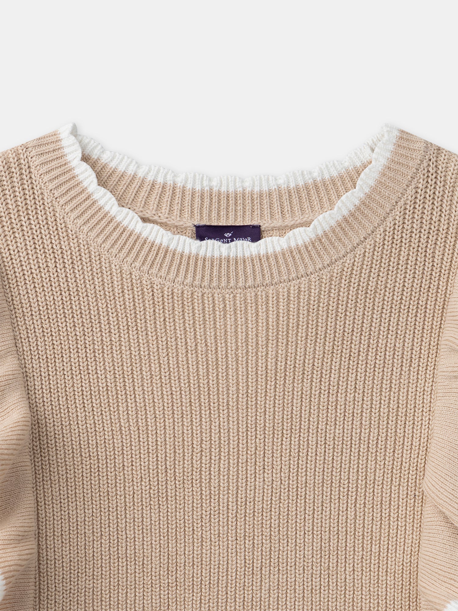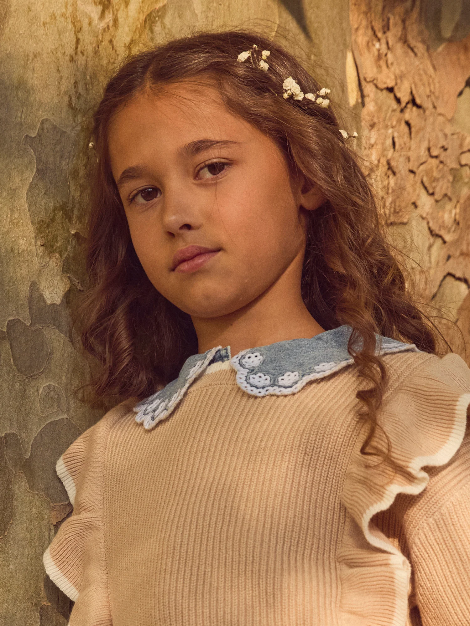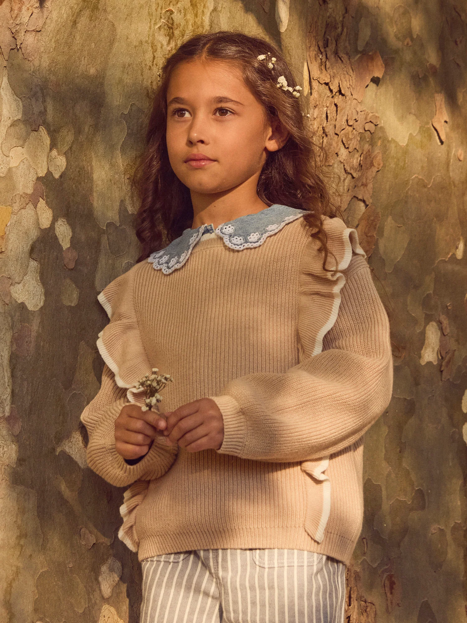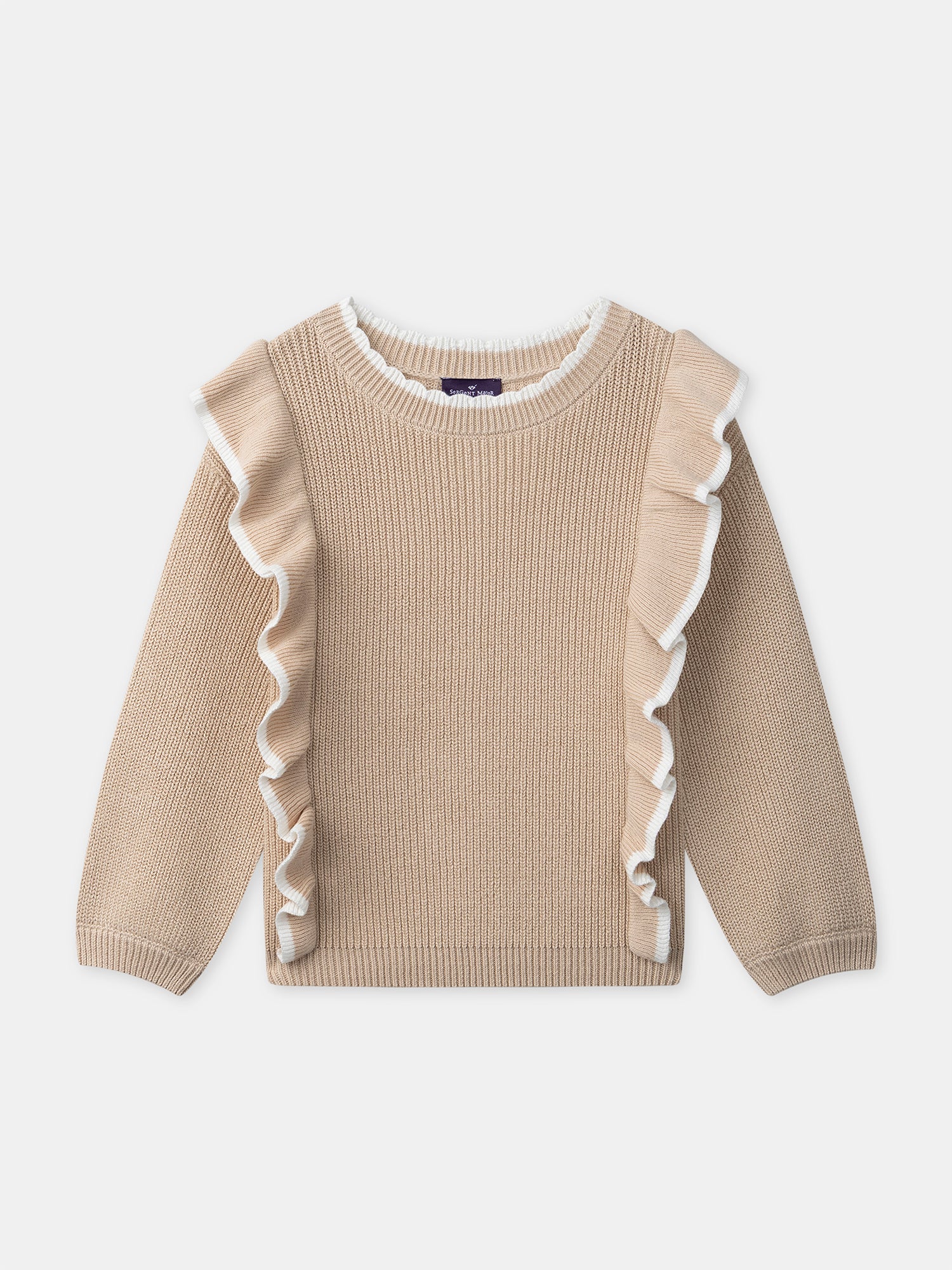 Pensé pour les petites rêveuses du printemps, ce pull accompagne les journées douces avec confort. Sa maille sable et sa coupe droite assurent une tenue agréable. Les volants le long du corps et le col finition coquille ajoutent une touche délicate à ses tenues.