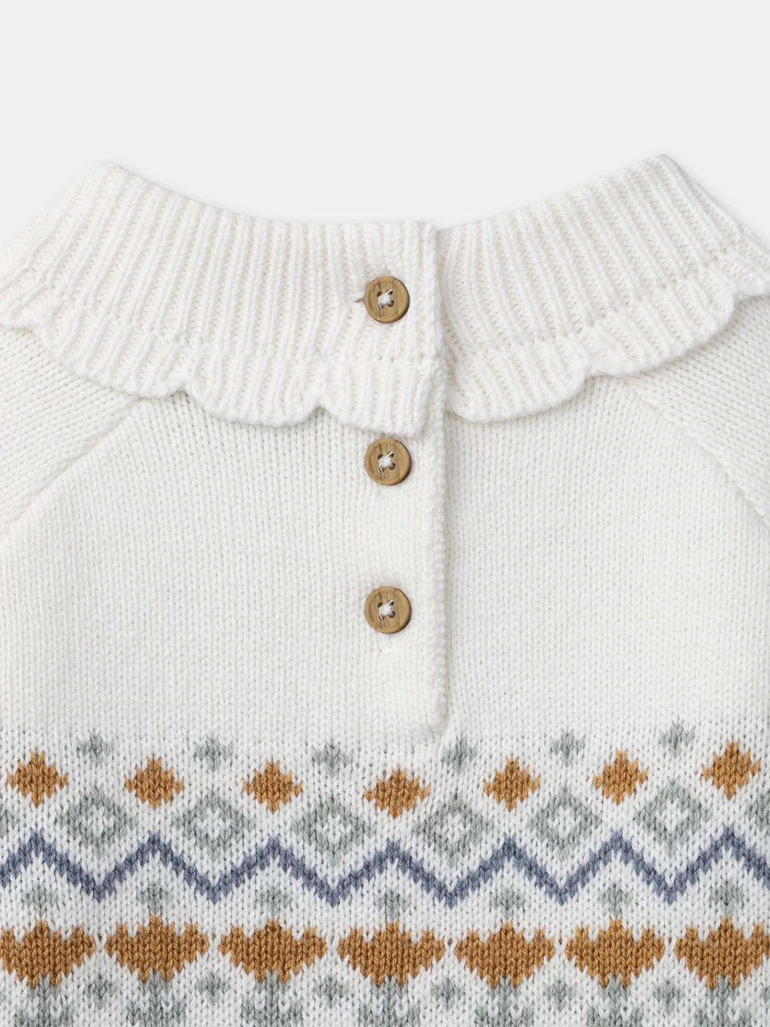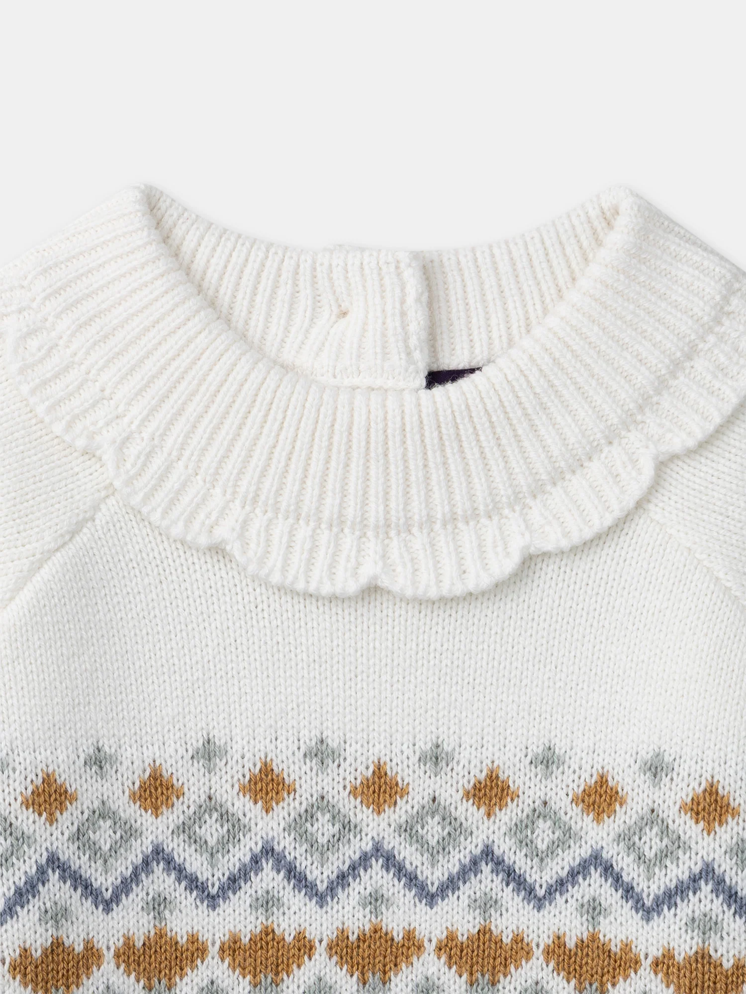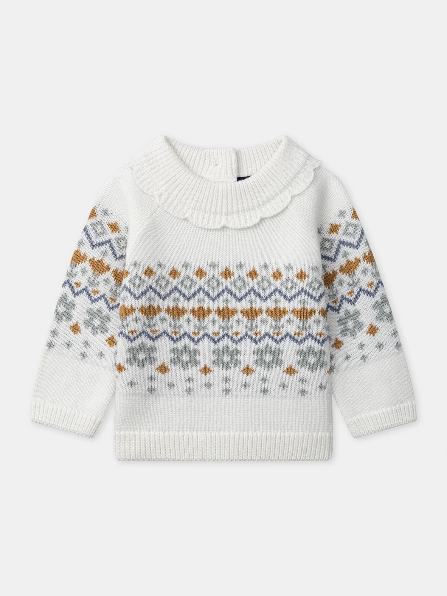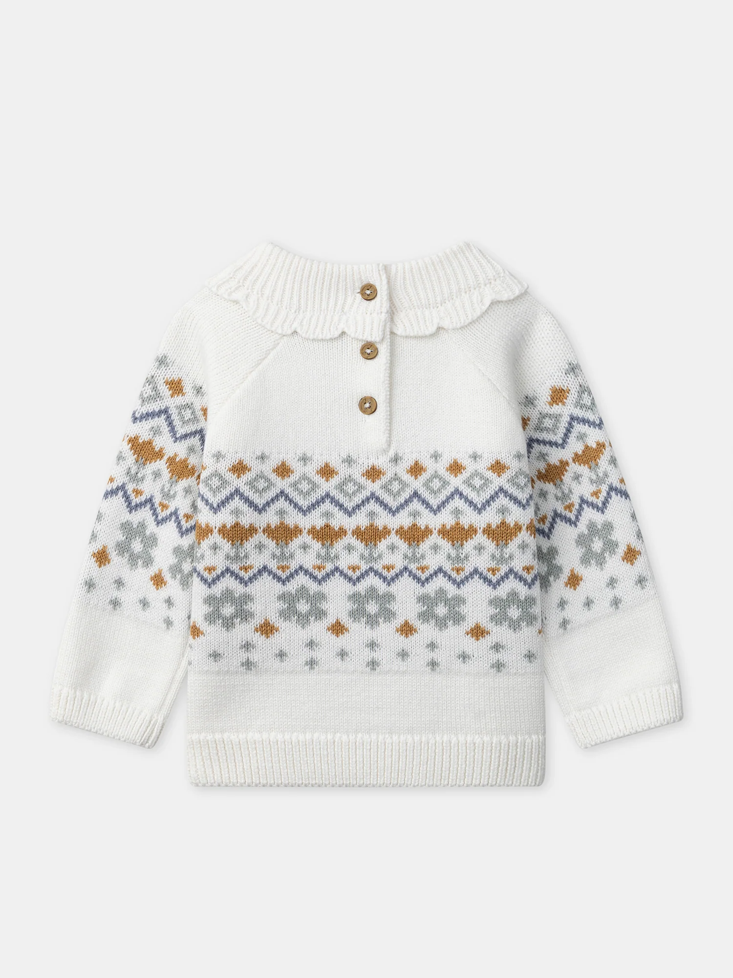 Parfait pour la saison froide, ce pull écru en jacquard fleurs garde l’enfant au chaud avec élégance. Sa coupe est rehaussée d’un volant au col et d’une ouverture au dos par boutons. Les motifs fleuris dans les tons marron et bleu lui donnent un style raffiné.