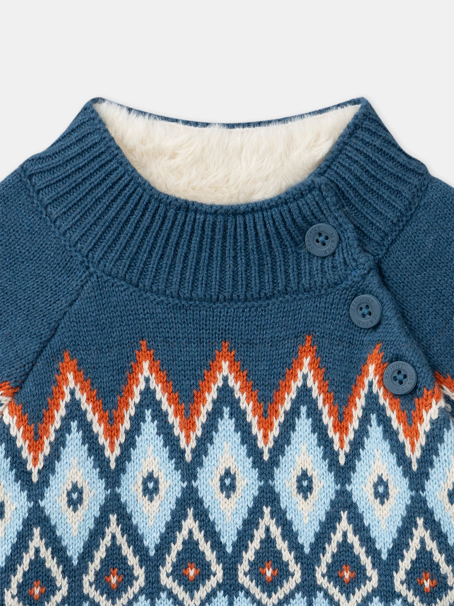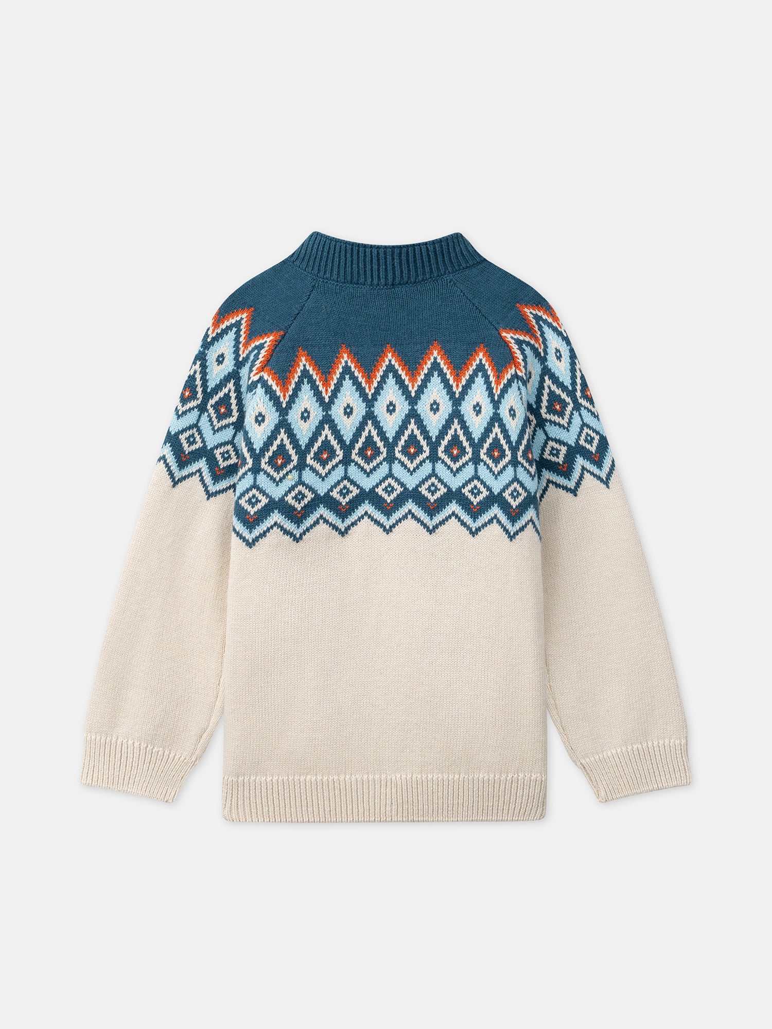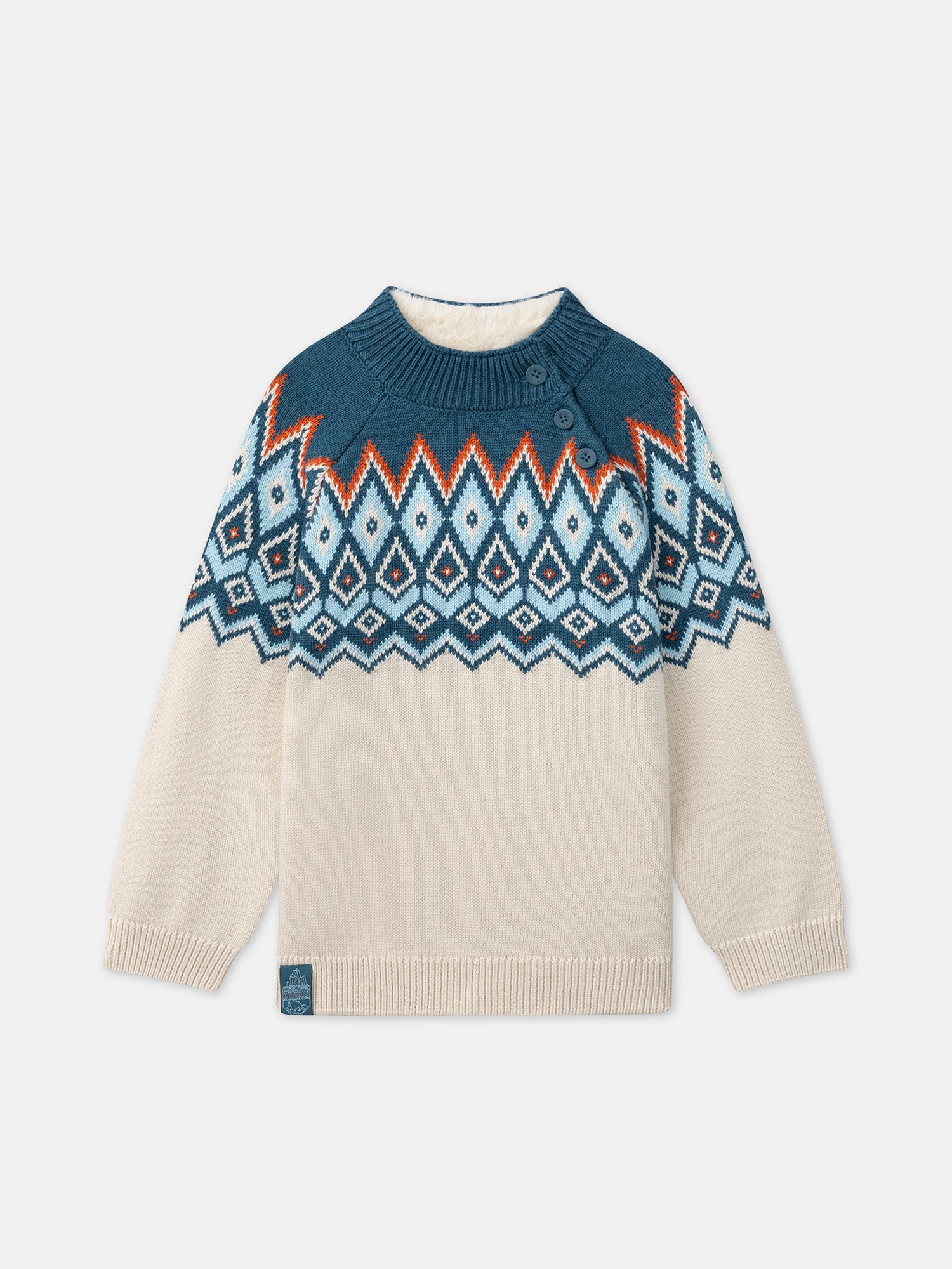 Ce pull jacquard écru au motif graphique est parfait pour un look hivernal chic et confortable. Son col montant doublé en fourrure synthétique offre chaleur et élégance, tandis que les bords-côtes au col, poignets et à la taille assurent un ajustement parfait. Idéal pour les journées fraîches, ce pull allie style et confort avec brio.