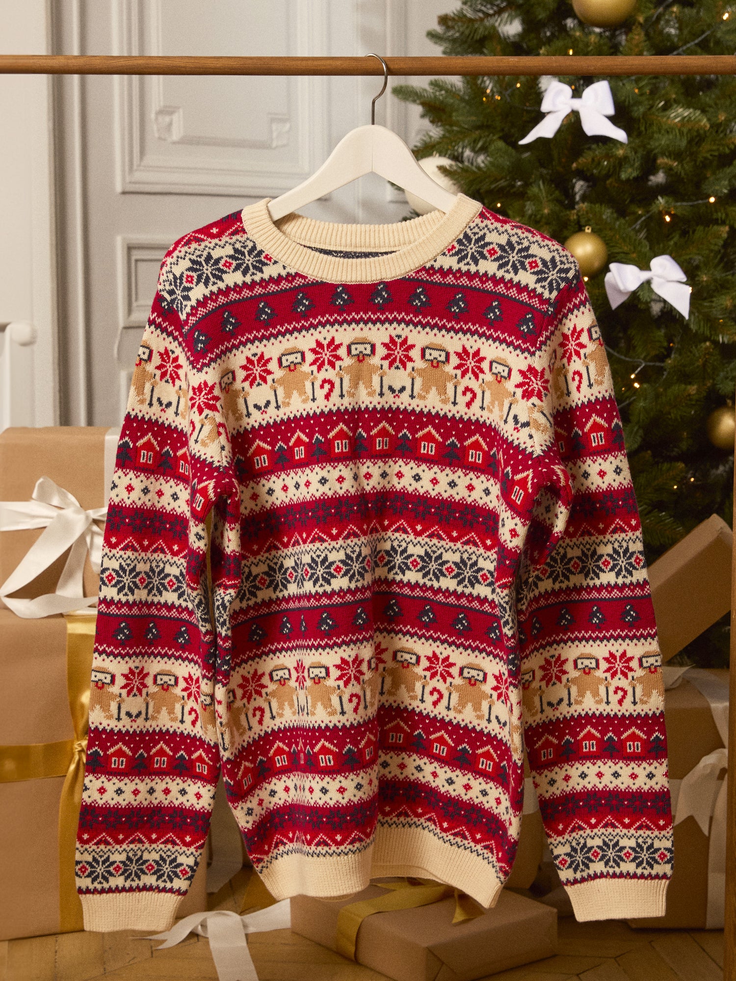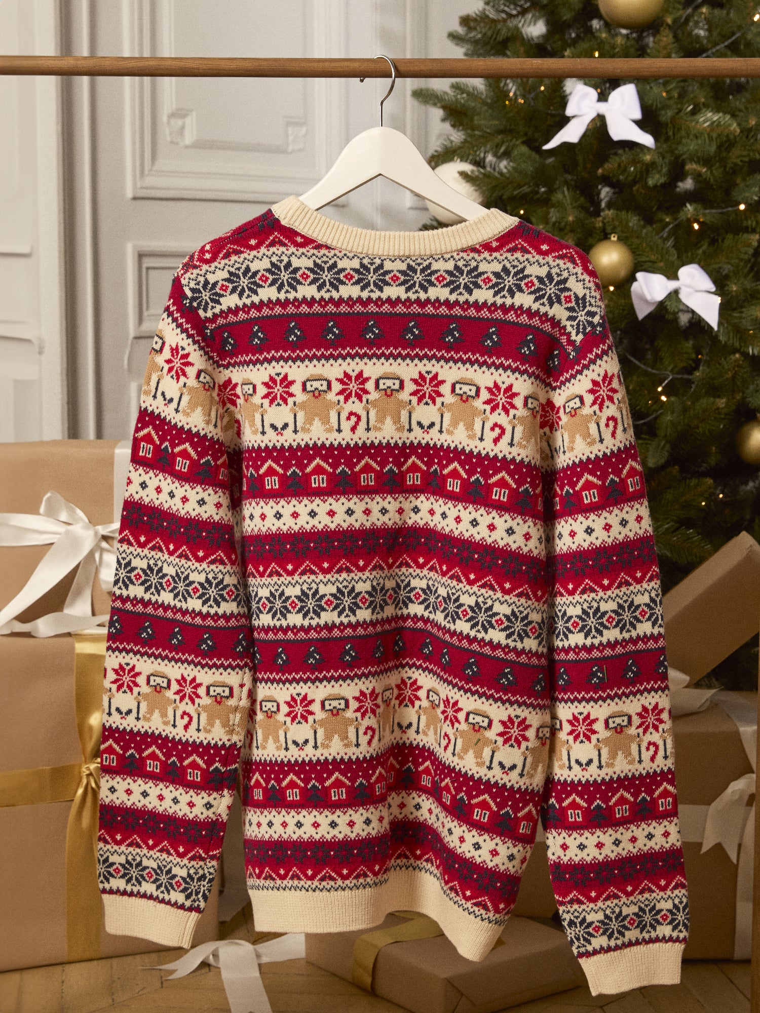 • Motif de Noël en jacquard : pain d’épice, flocon, sapin, chalet