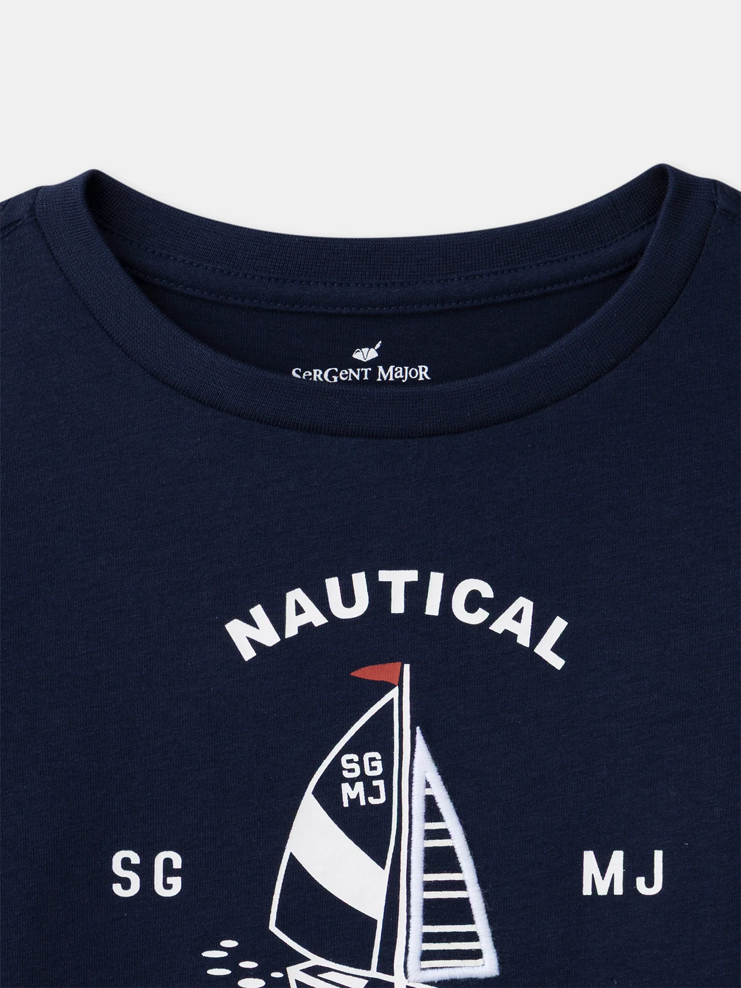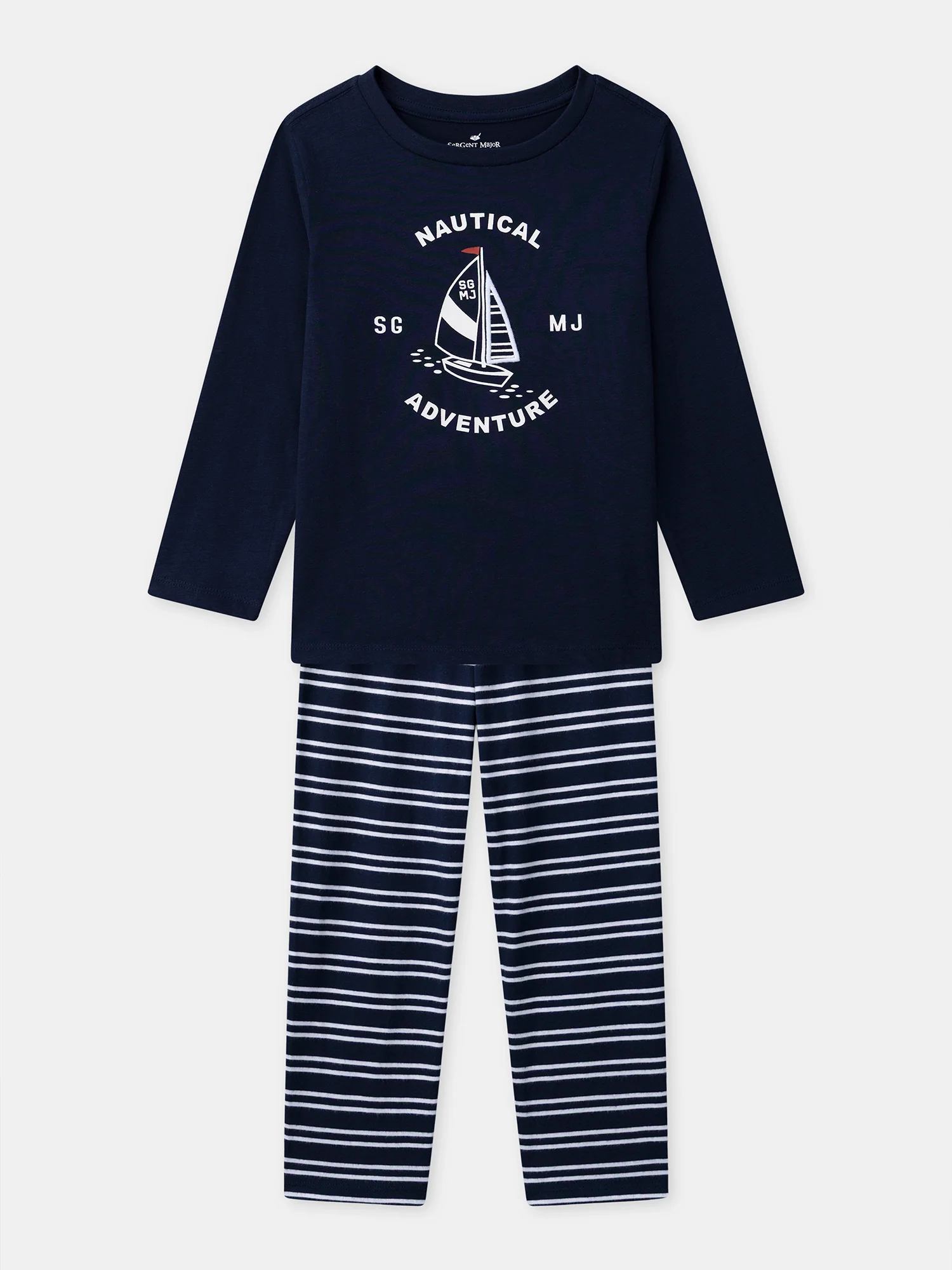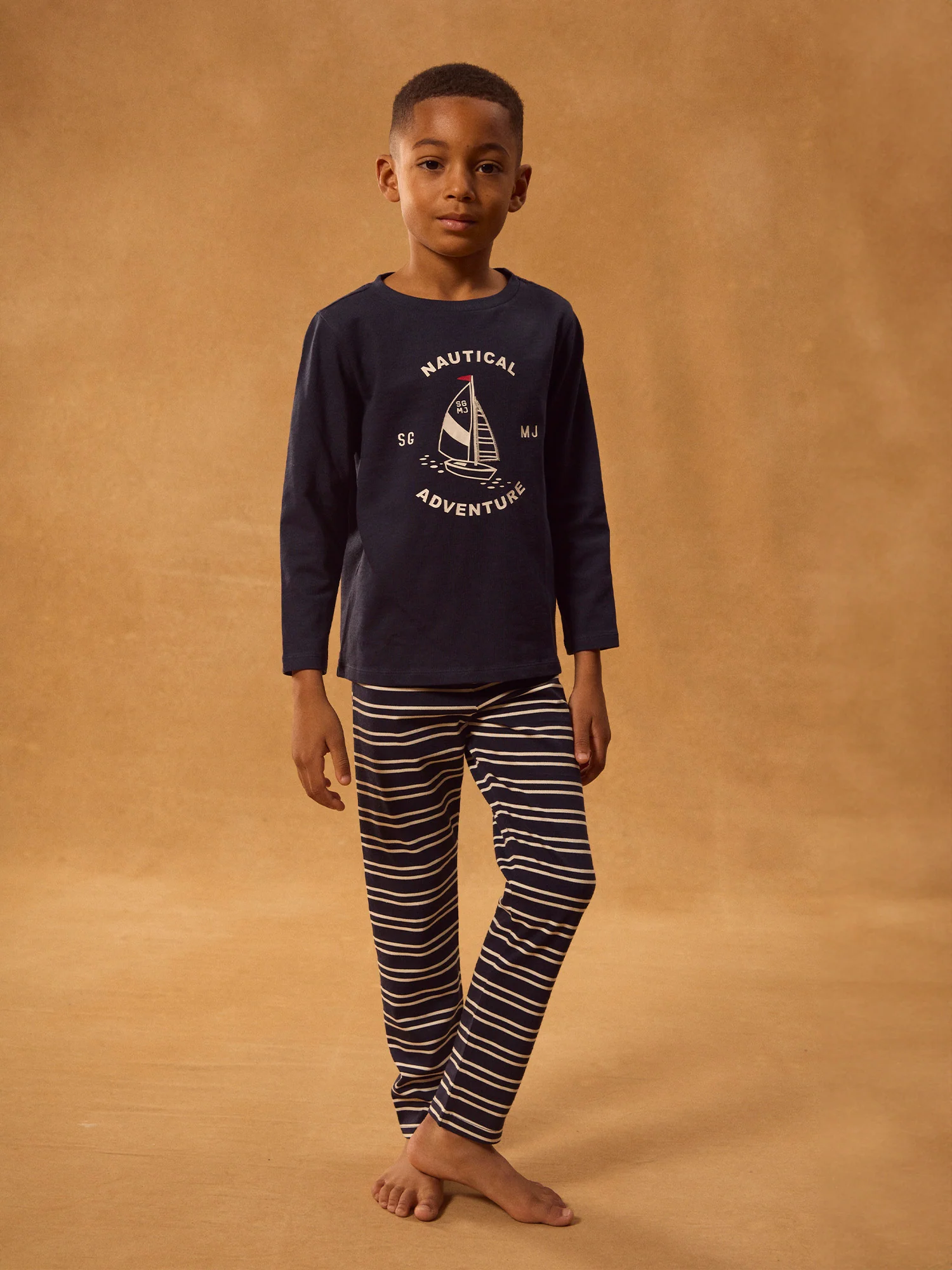 Idéal pour les enfants qui rêvent d’aventure, ce pyjama bleu marine accompagne les nuits d’automne et d’hiver. Son jersey lourd gratté dedans/dehors offre une sensation de chaleur et de confort durable. Le patch voilier et le bas rayé créent un univers marin doux et rassurant.