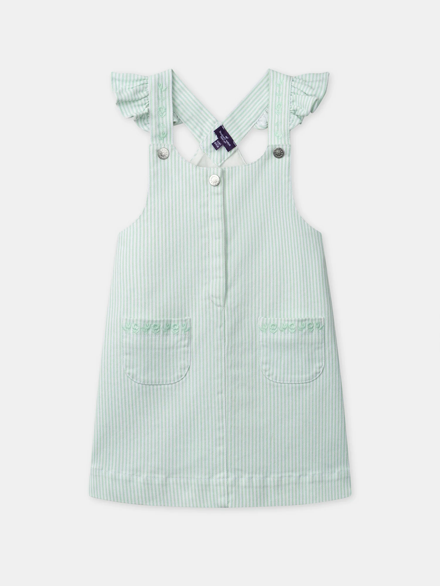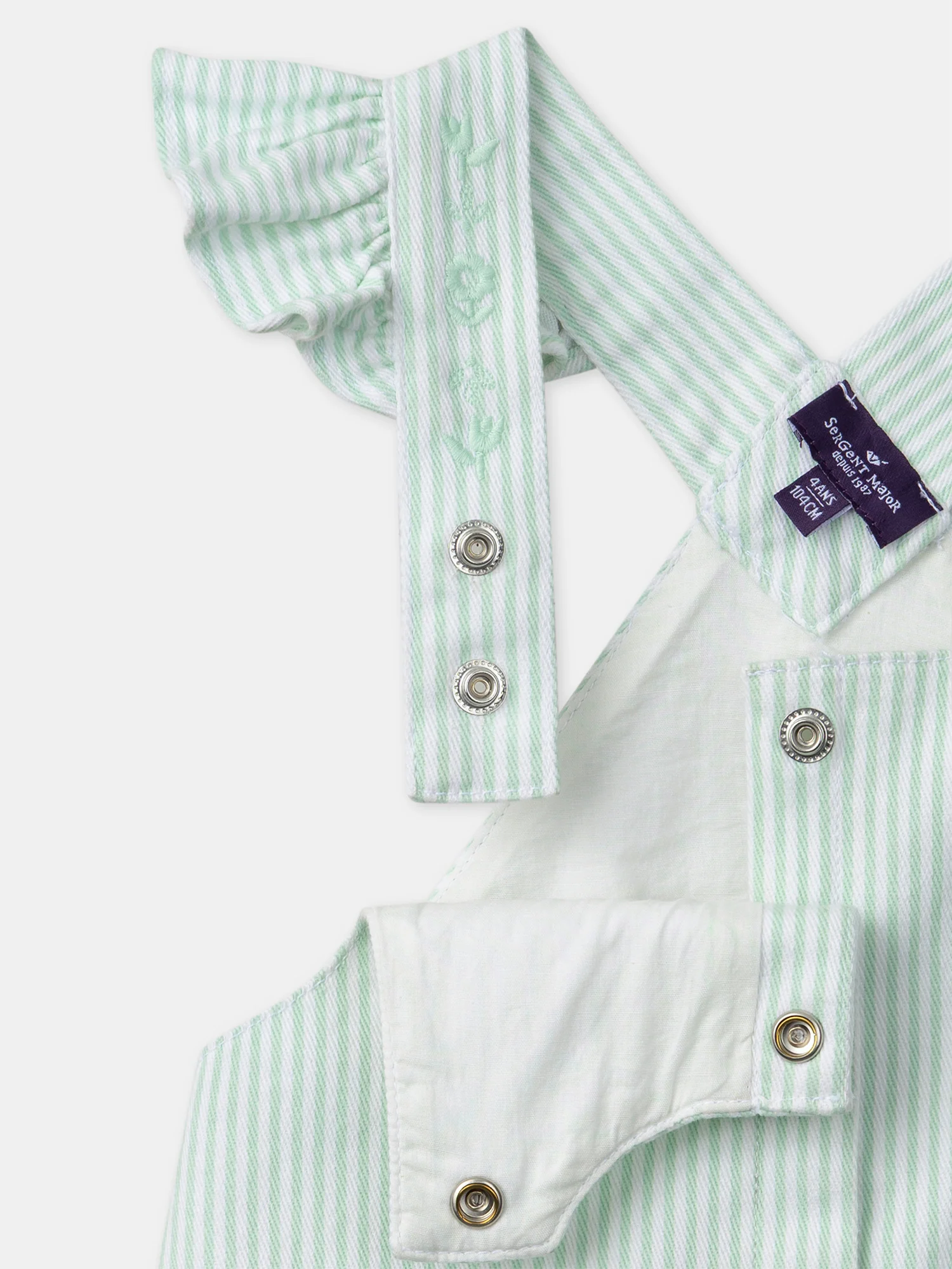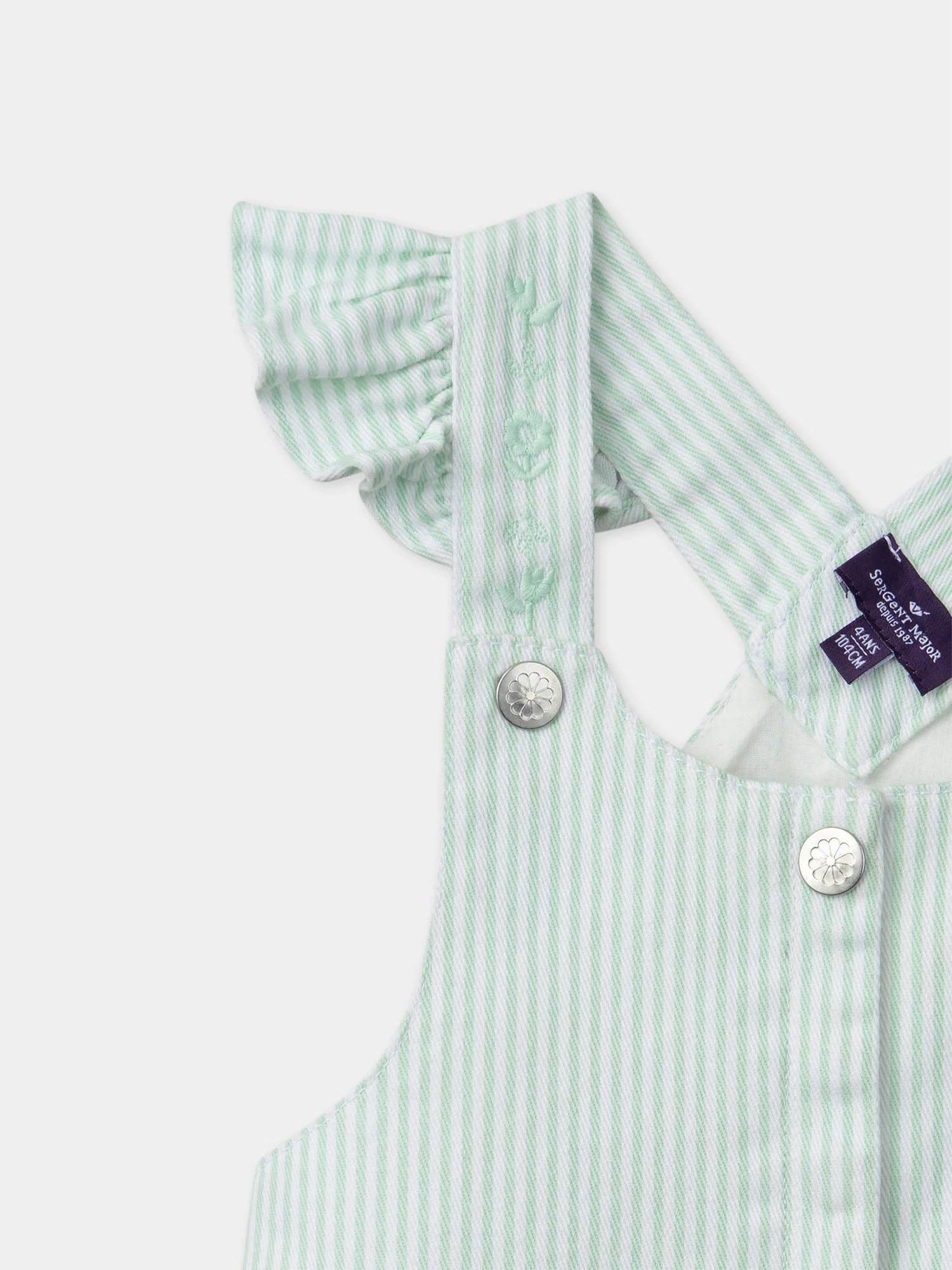 Volants aux bretelles 2 poches avant brodées Doublure en coton pour la poitrine Contient de l’élasthane pour plus de confort Ouverture boutons pressions sur les bretelles et au milieu