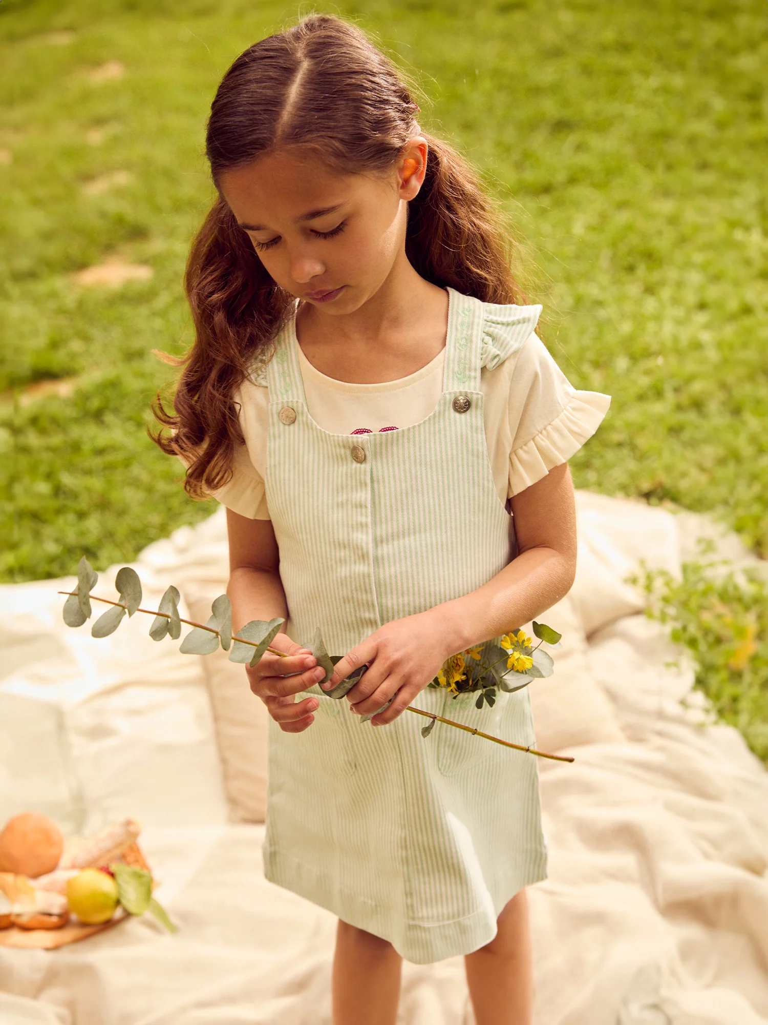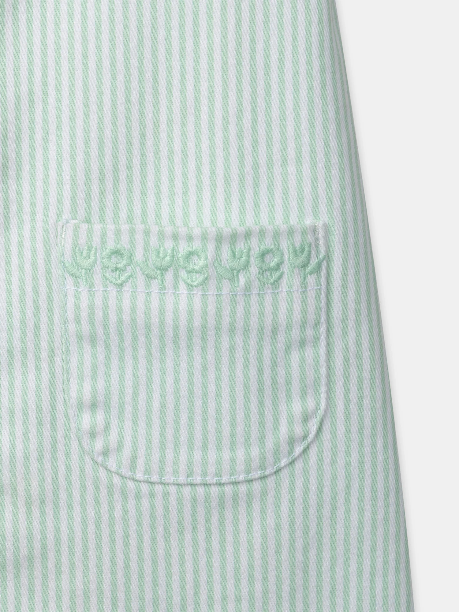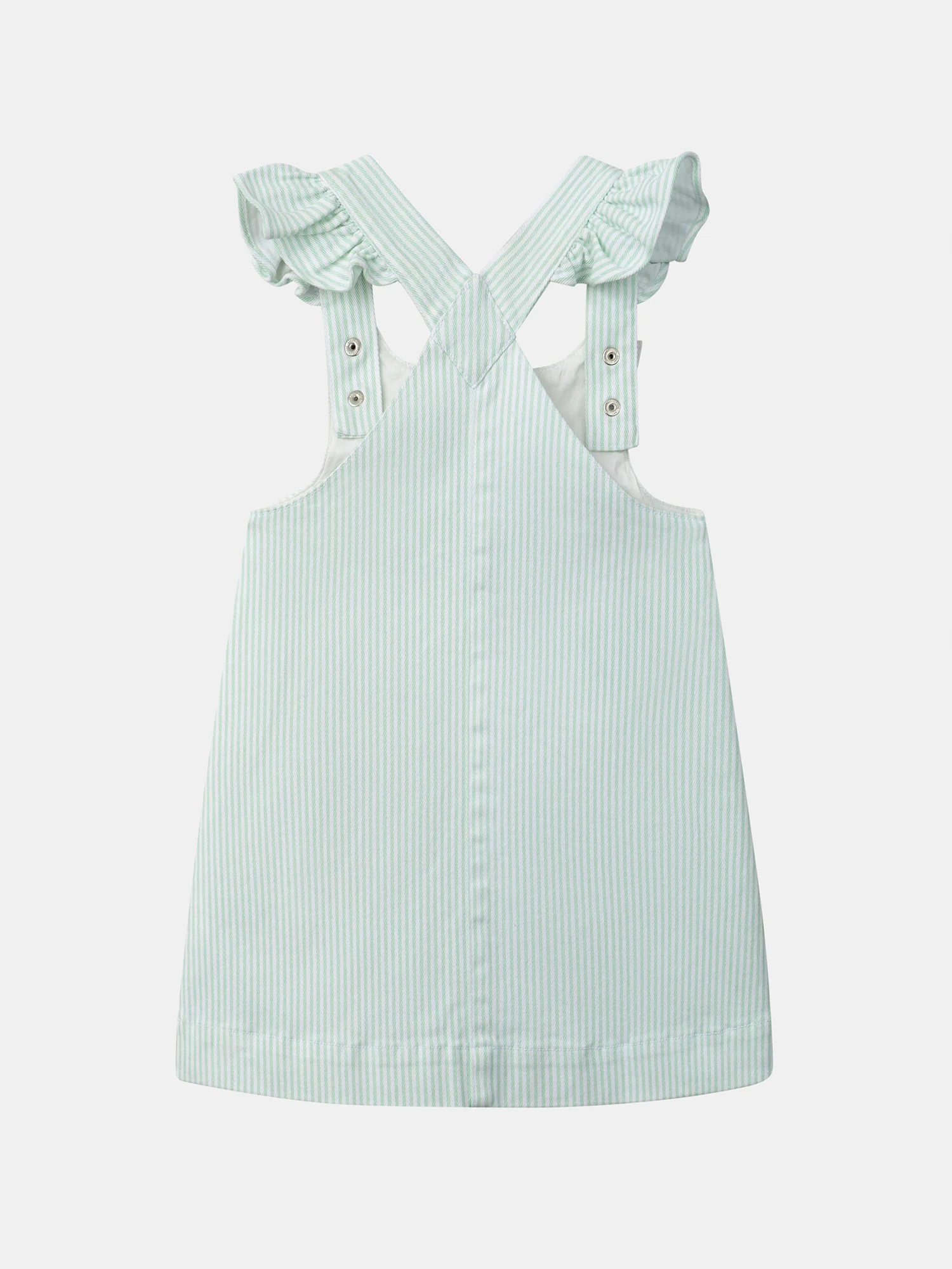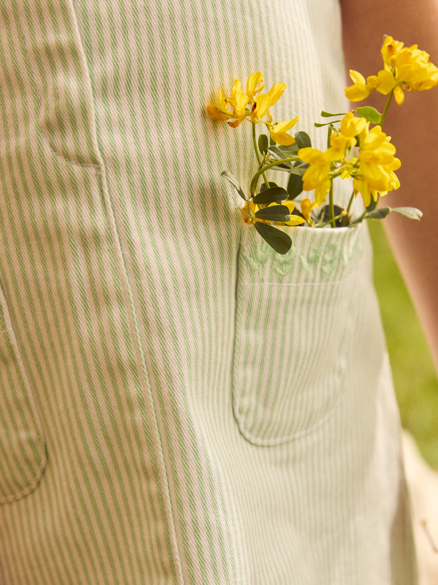 Volants aux bretelles 2 poches avant brodées Doublure en coton pour la poitrine Contient de l’élasthane pour plus de confort Ouverture boutons pressions sur les bretelles et au milieu