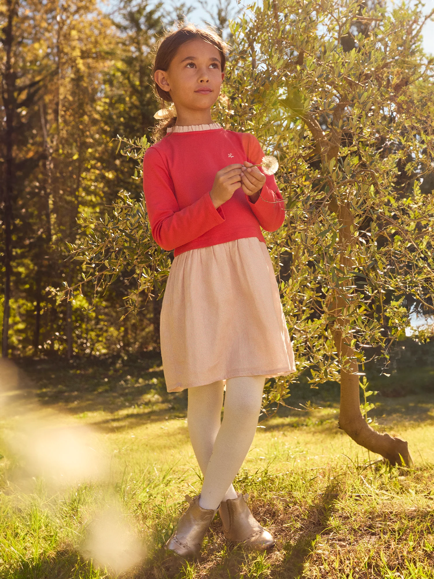 Pour une enfant pétillante, idéale toute l’année. Le haut sweat et la jupe en gaze doublée créent une coupe mixte confortable. Le col froncé et les carreaux apportent caractère et féminité.