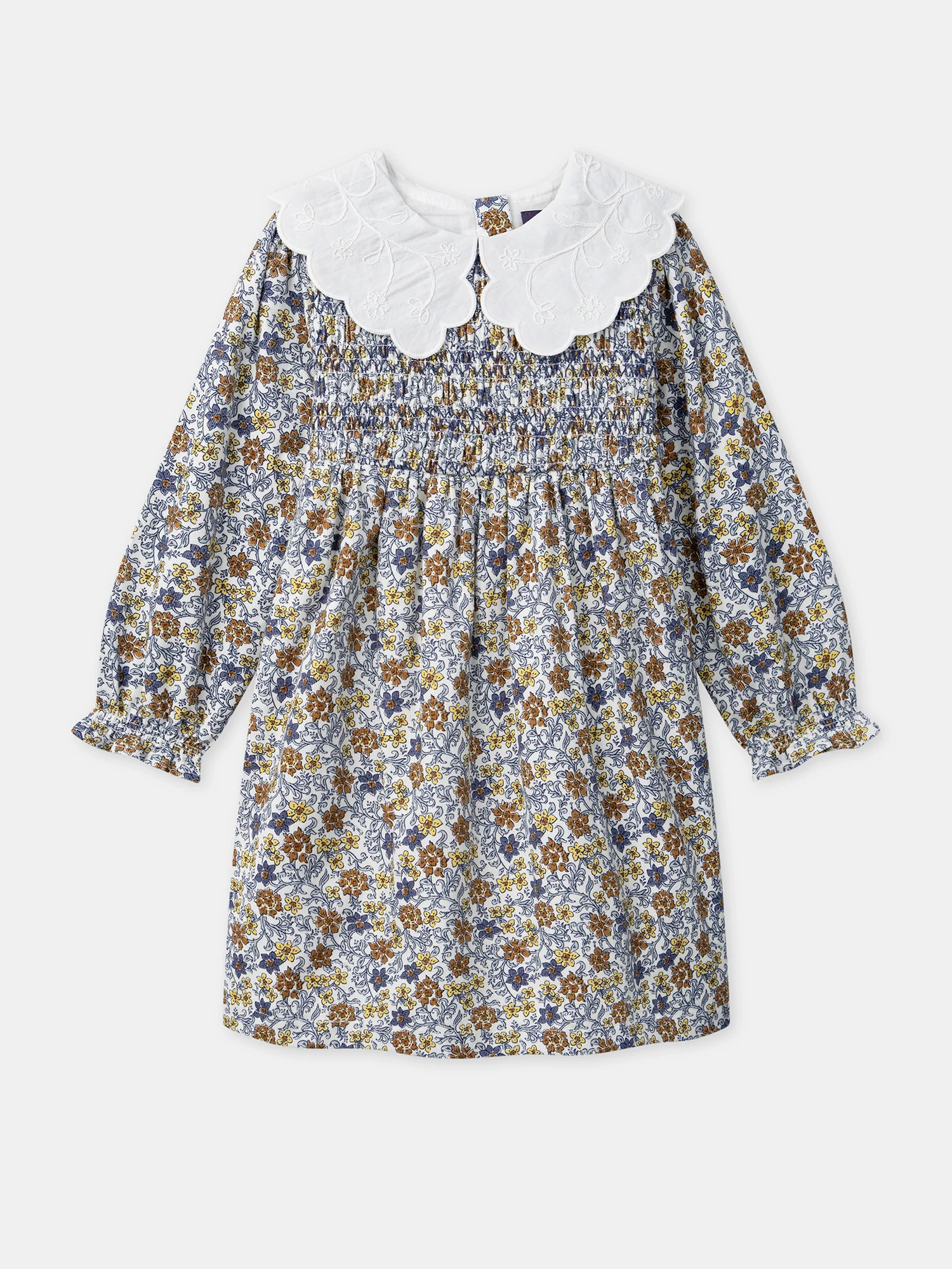 Conçue pour les petites rêveuses de saison fraîche, cette robe en velours côtelé est à la fois confortable et raffinée. Elle est doublée en coton et rehaussée d’un col claudine brodé avec smocks bleus. Son ouverture zippée au dos et ses fleurs délicates l’accompagnent dans un univers poétique.