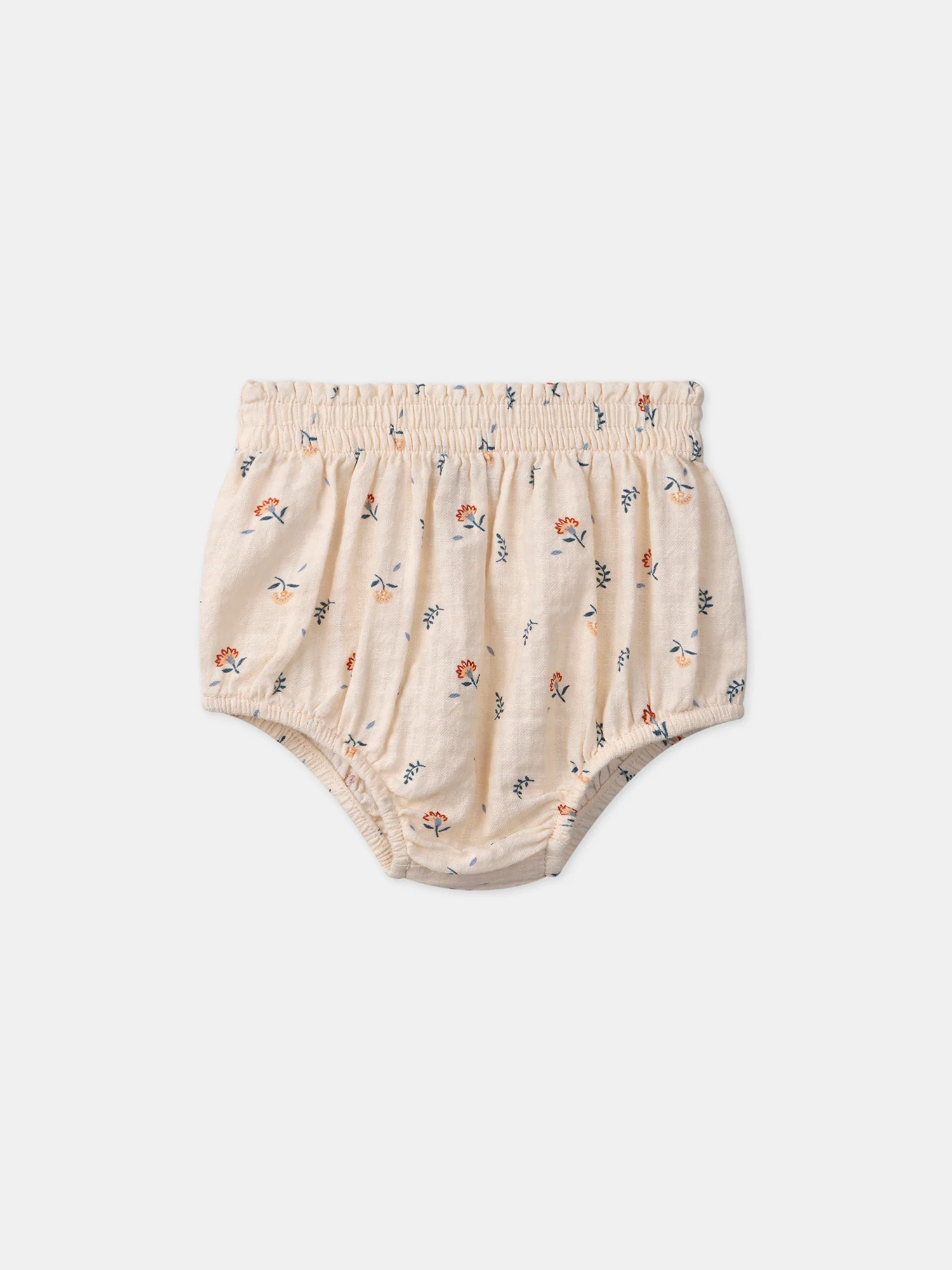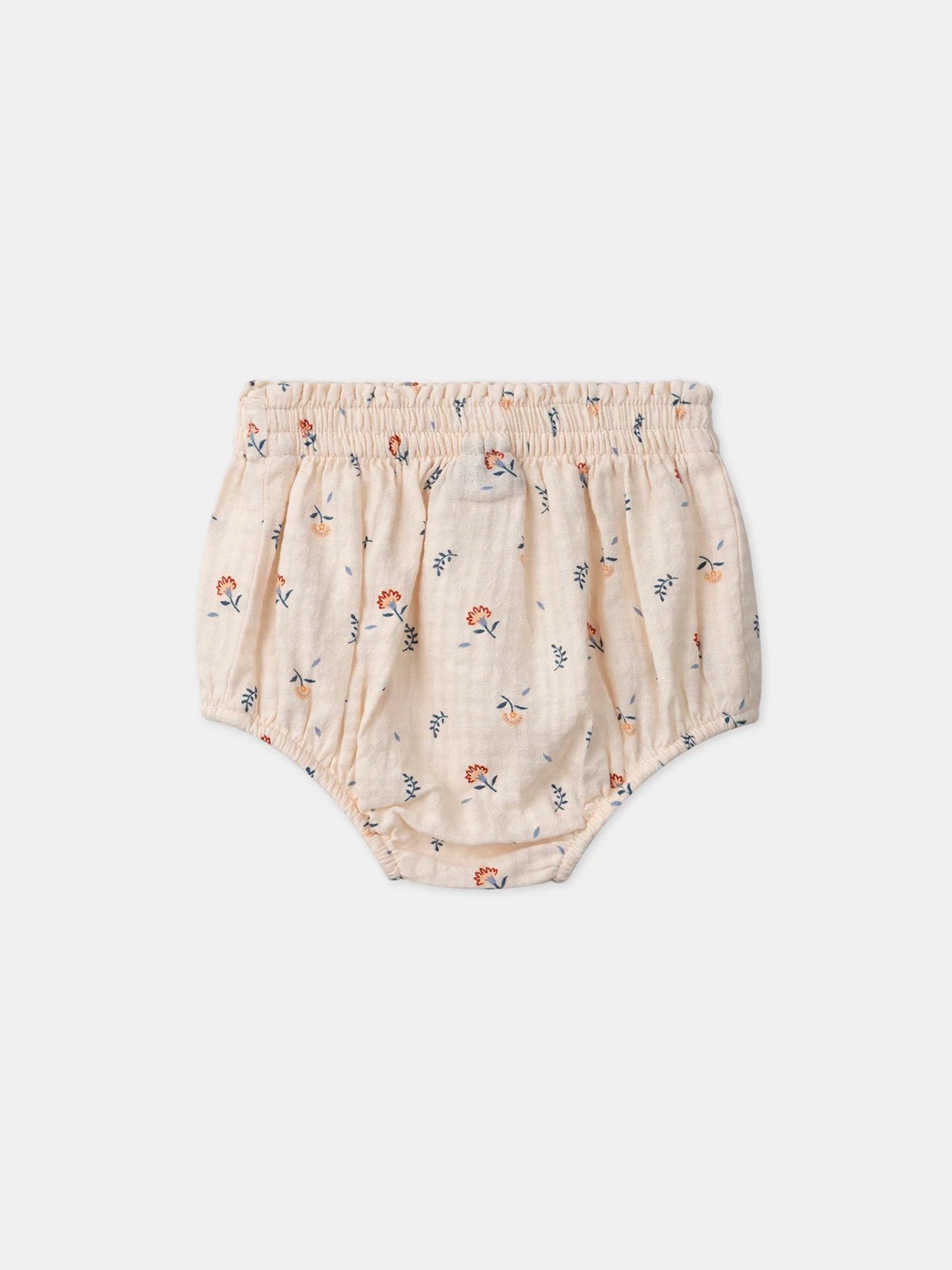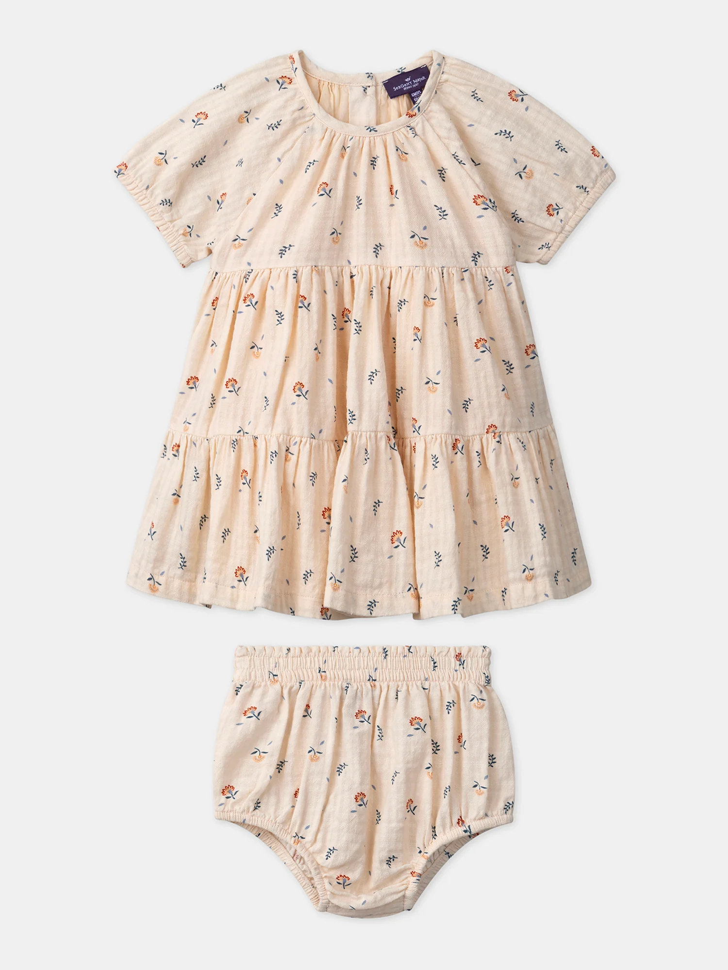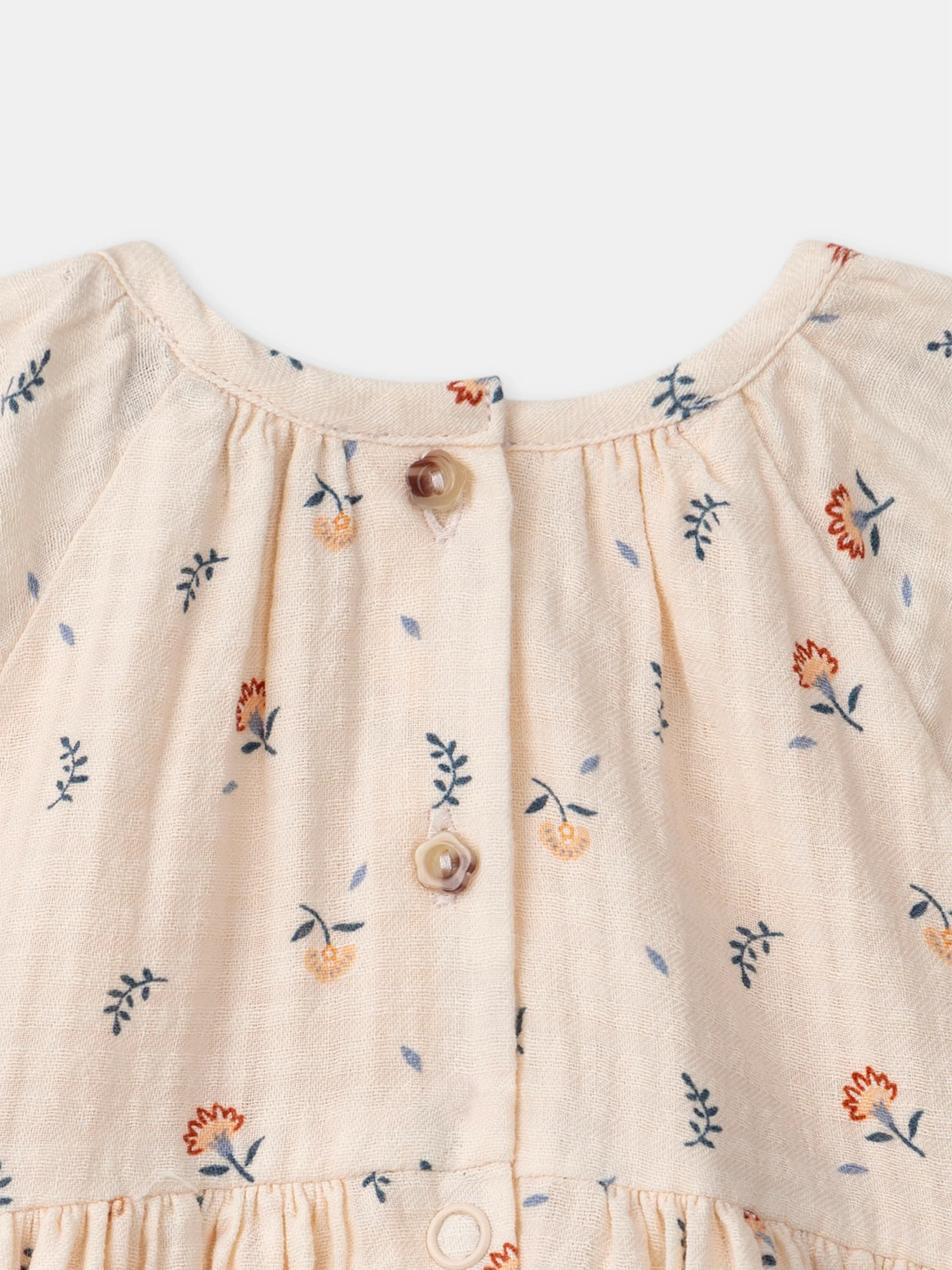 Cette robe imprimée est idéale pour une petite fille pleine de douceur, parfaite pour les journées d’été. Confectionnée dans un tissu léger, elle présente des manches courtes ballon et une ouverture dos avec des boutons fantaisie. Avec son imprimé fleuri bleu foncé et orange sur fond rose pâle, accompagnée de son bloomer assorti, elle allie confort et élégance pour un look printanier.
