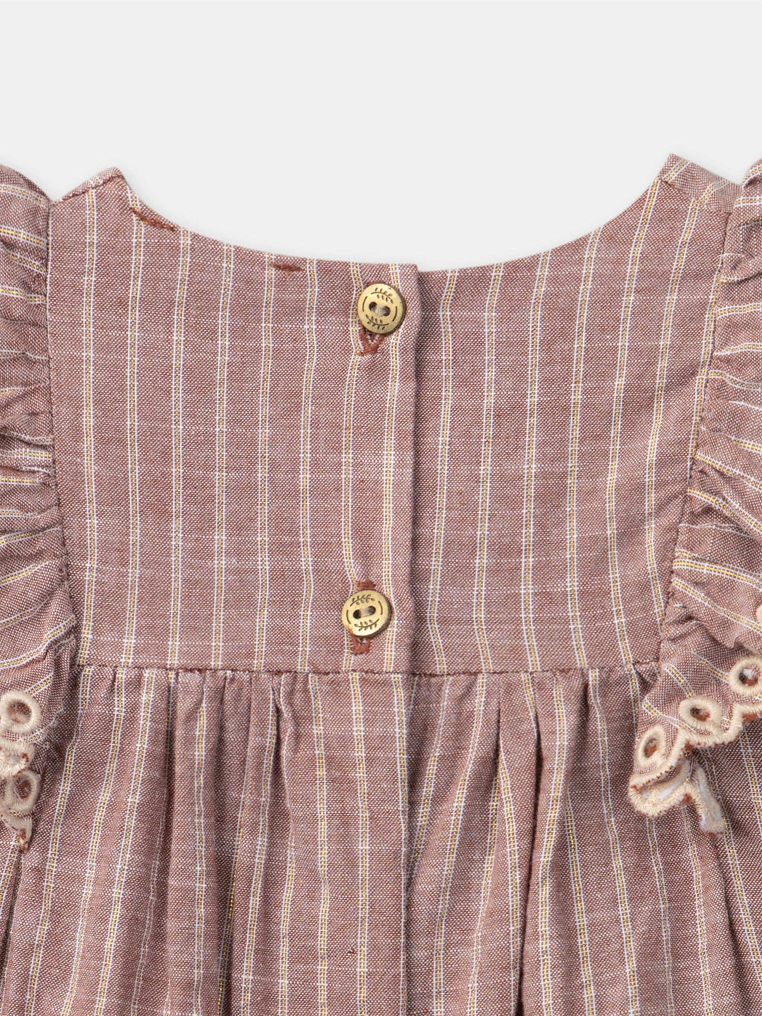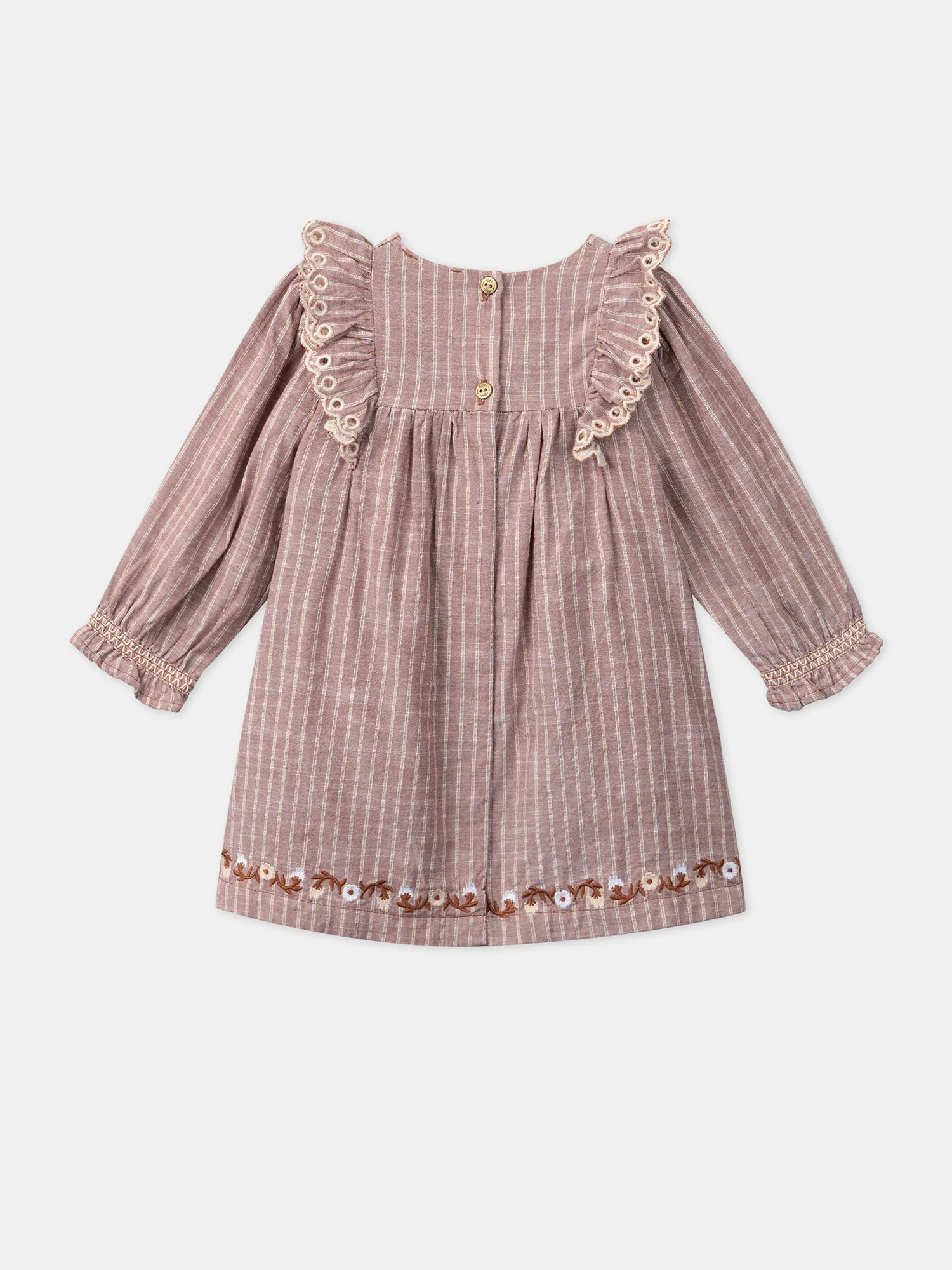 Optez pour cette robe rayée marron aux fils métallisés, parfaite pour la saison automne-hiver. Avec ses manches longues et ses rayures écrues agrémentées de fils métallisés, elle apporte une touche de brillance discrète. Les broderies fleurs beige et marron clair au bas de la robe ajoutent une touche de délicatesse. Le buste est orné de volants avec smocks, tandis que les poignets sont élastiqués pour un ajustement confortable. L’ouverture intégrale dans le dos est dotée de boutons fantaisies et de boutons à pression dissimulés, offrant à la fois style et praticité.