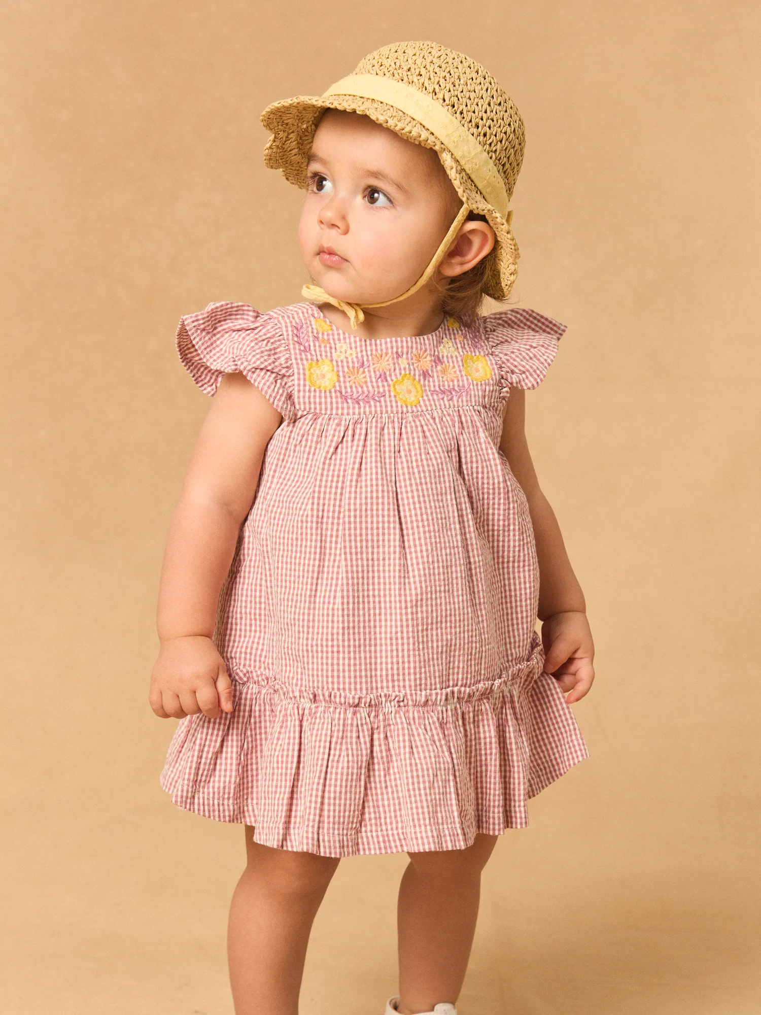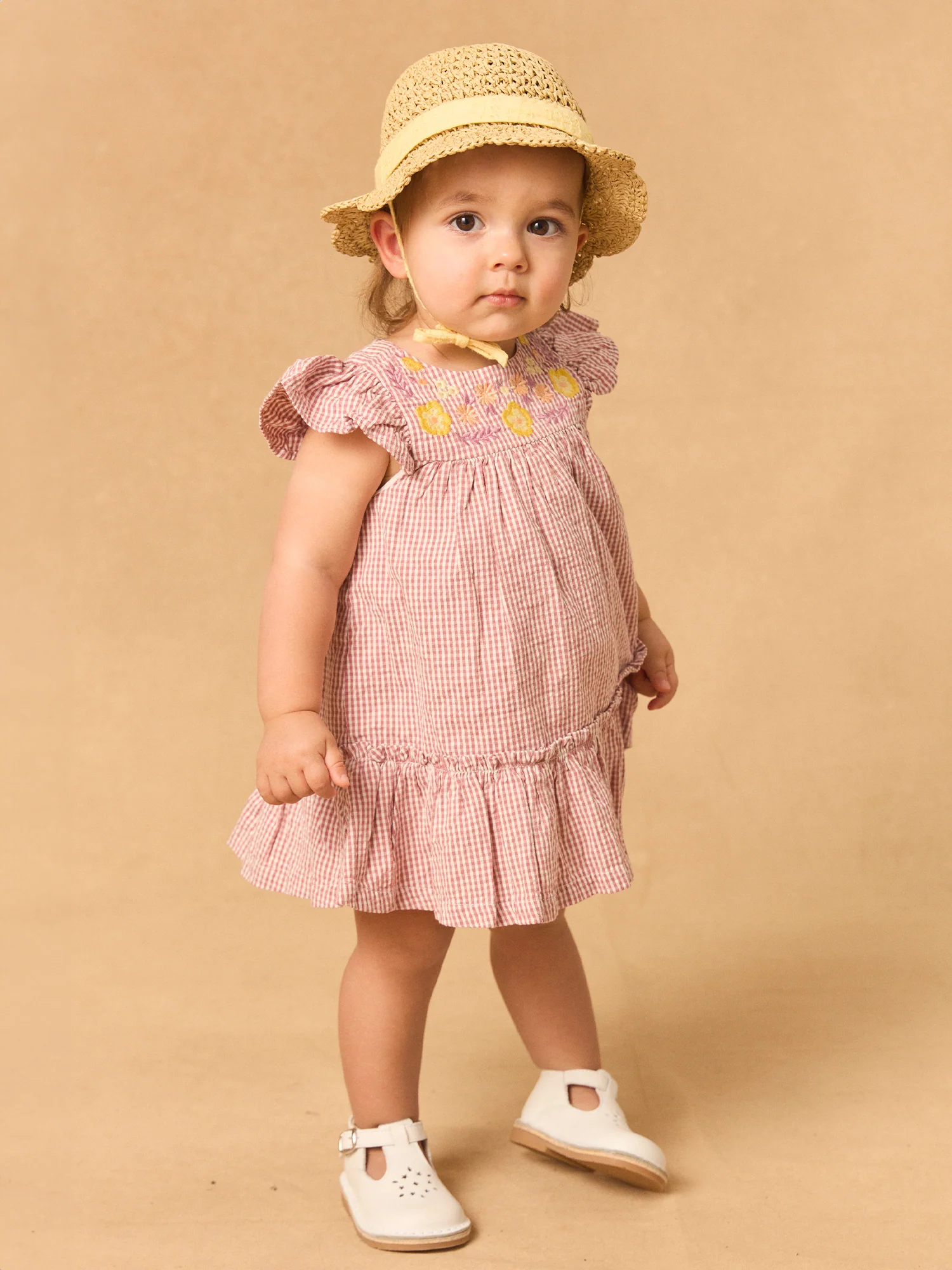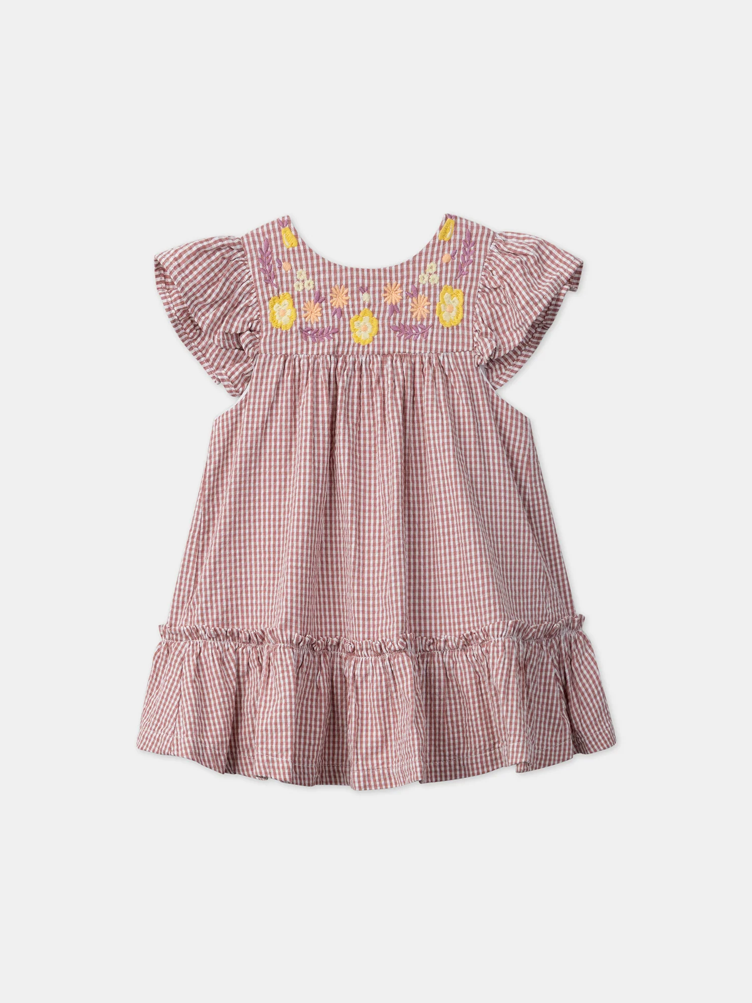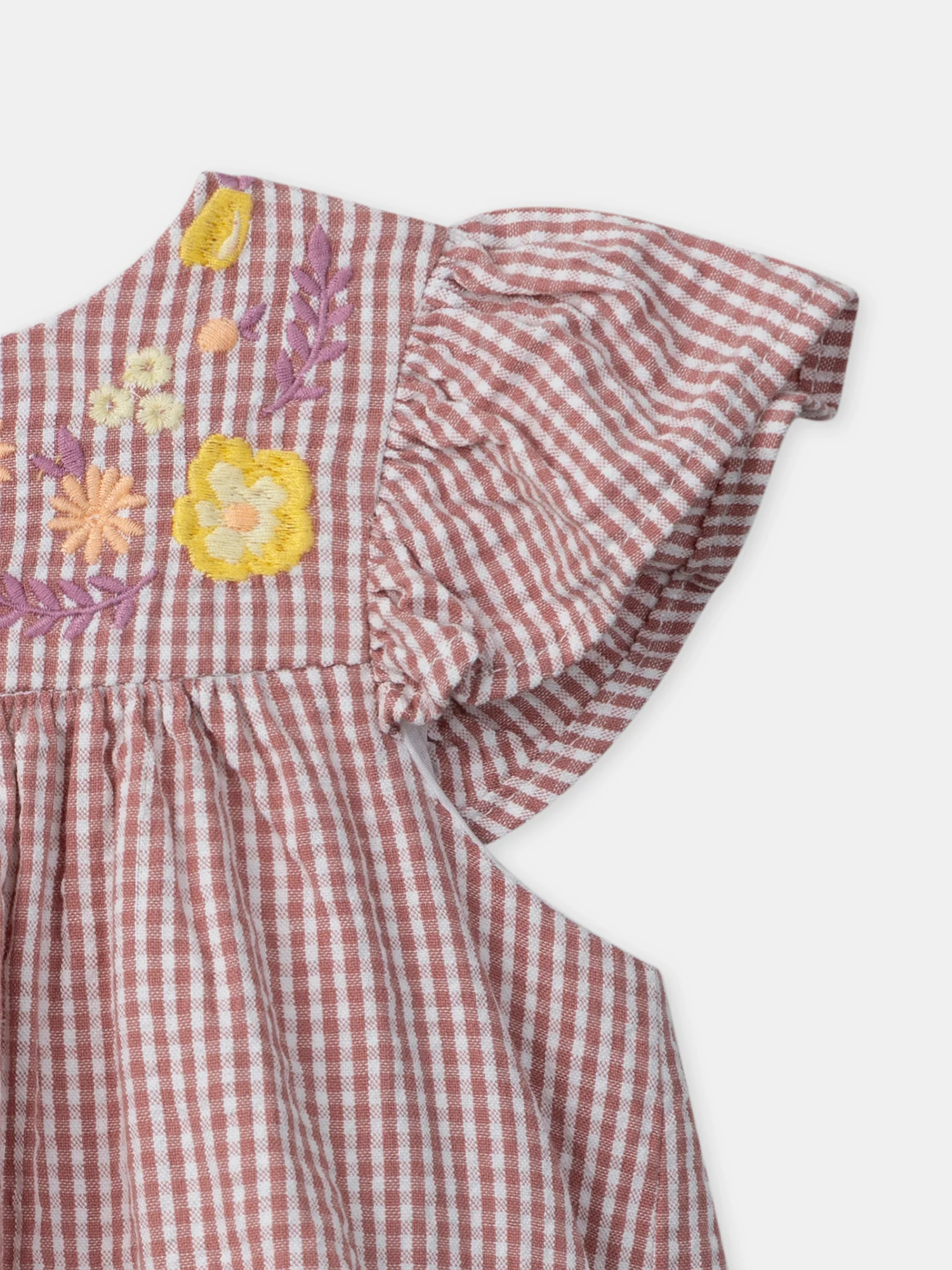 Cette robe vichy est idéale pour les petites filles en quête de fraîcheur et de légèreté, parfaite pour les journées d’été. Elle présente un buste brodé de fleurs jaunes, orange pâle et lilas, avec un joli volant sur le bas de la robe pour un effet délicat. Accompagnée de son bloomer et avec une ouverture dos intégrale par boutons fleurs, elle allie confort et style.