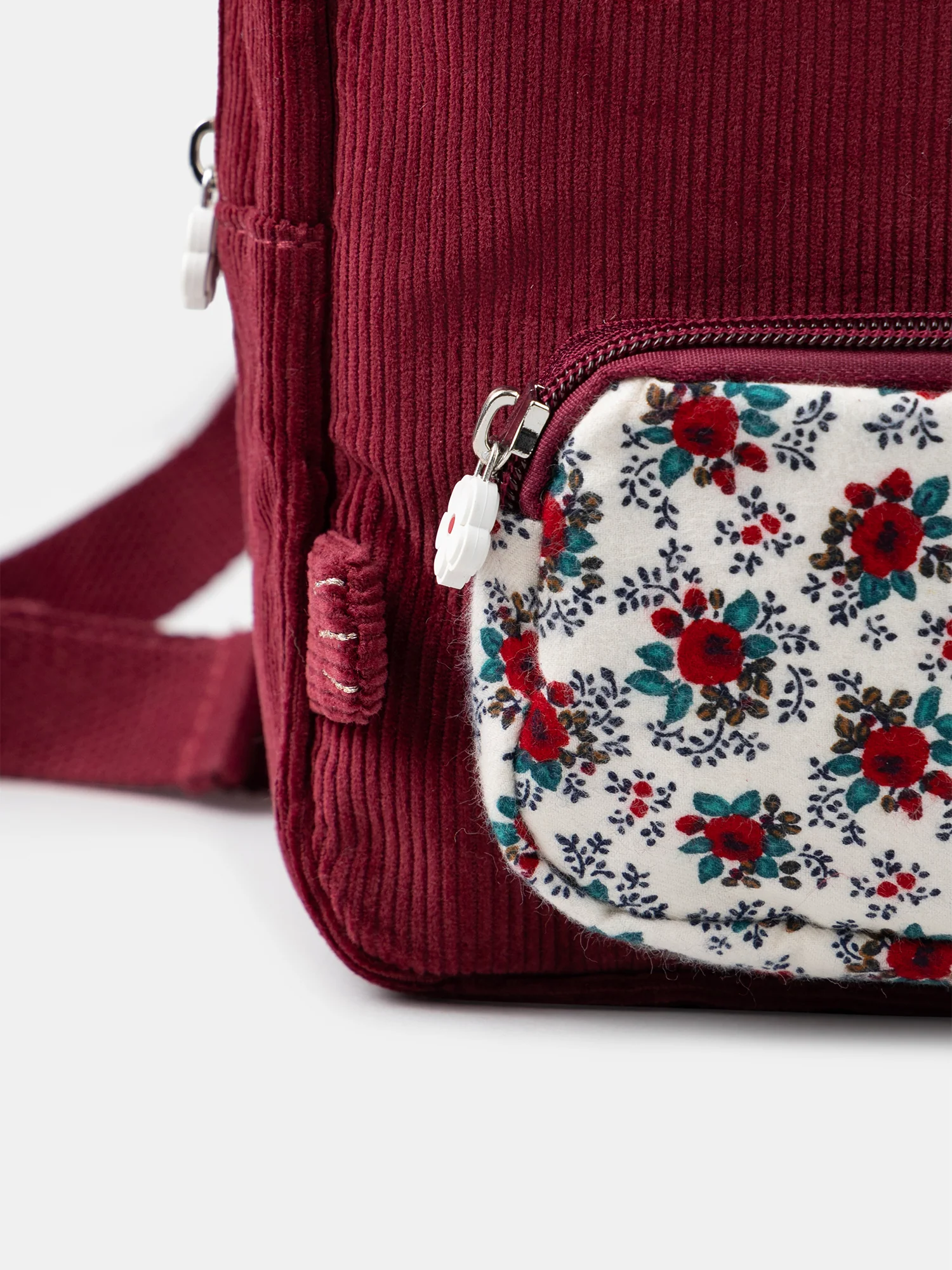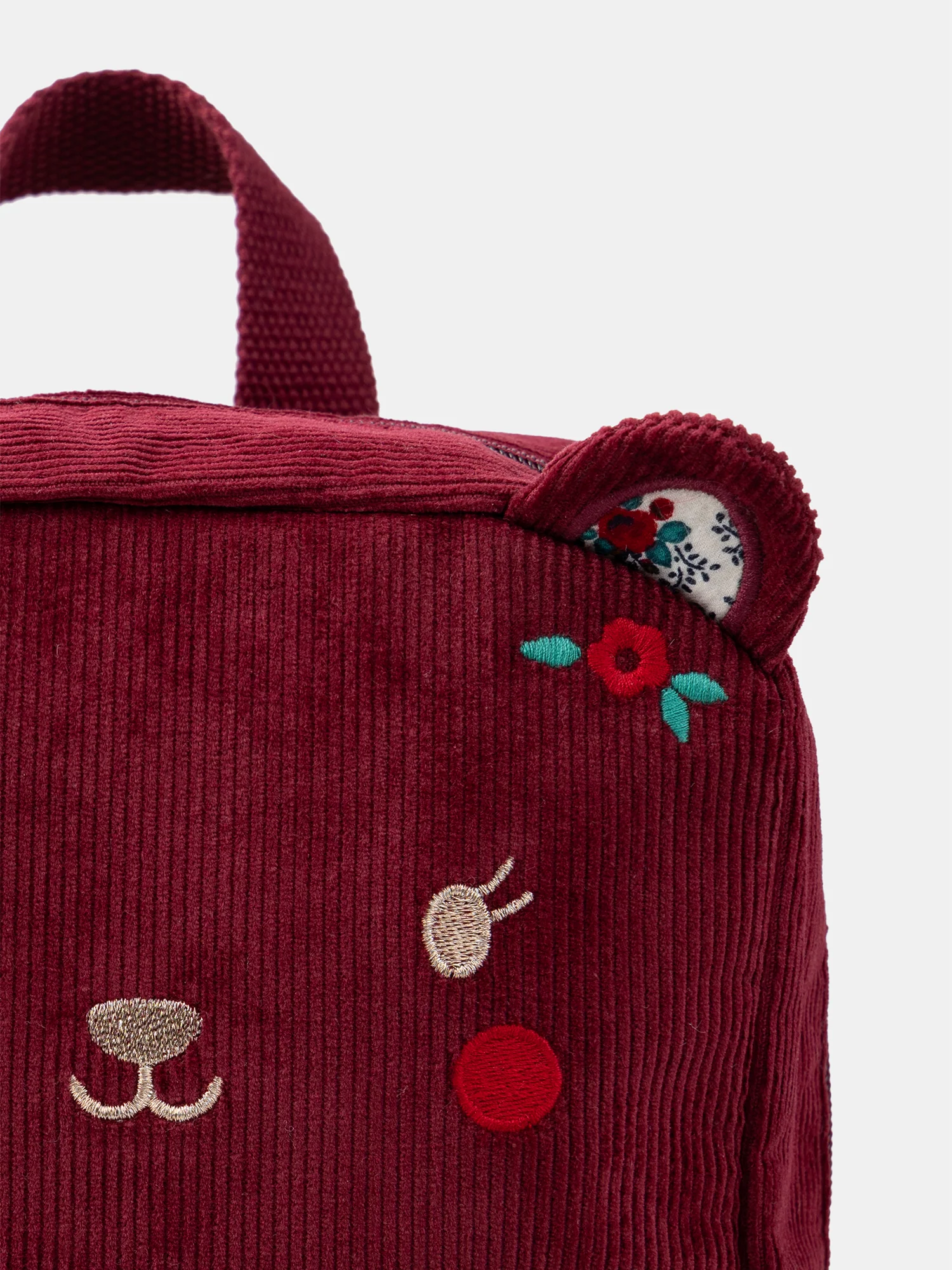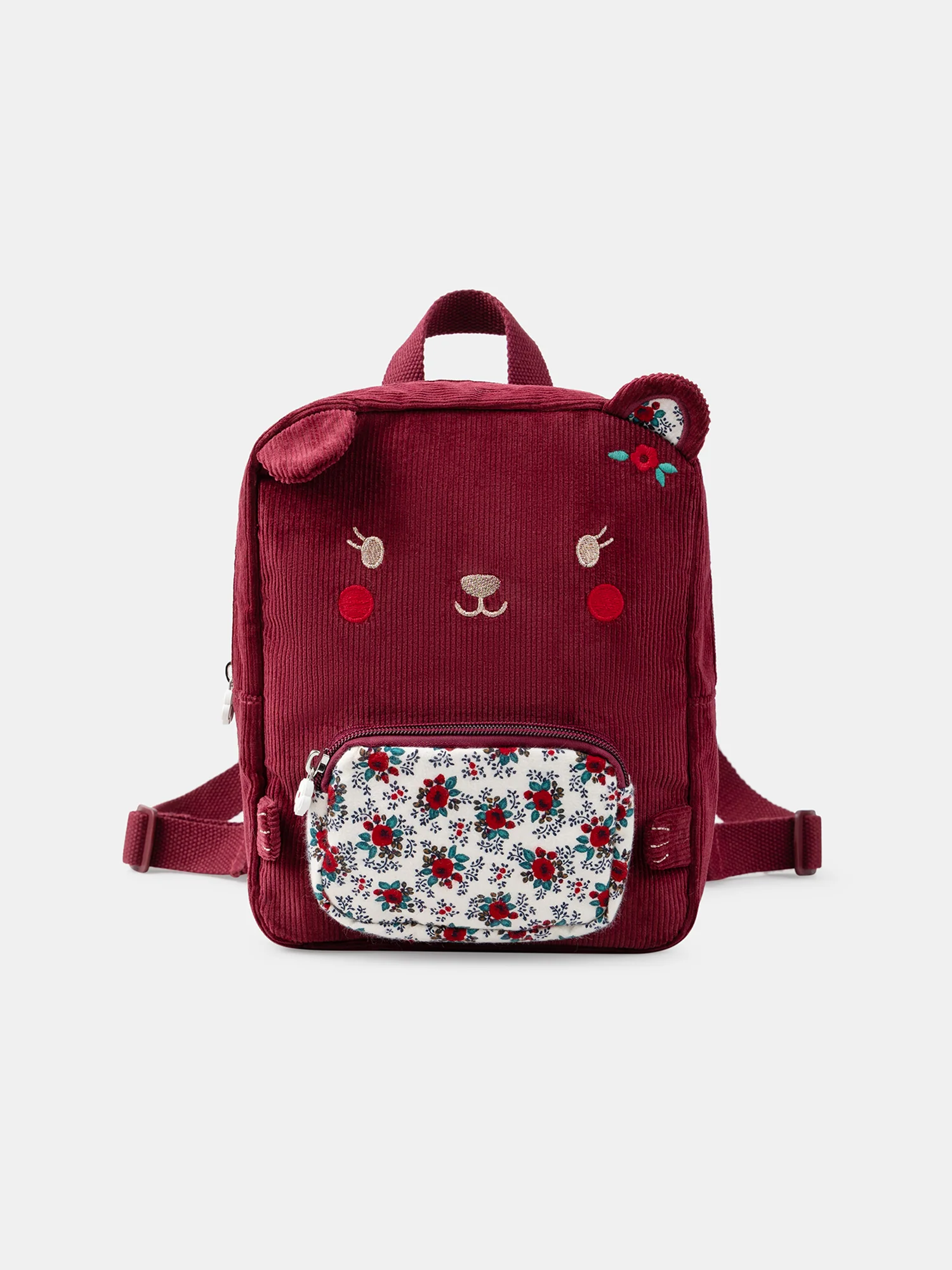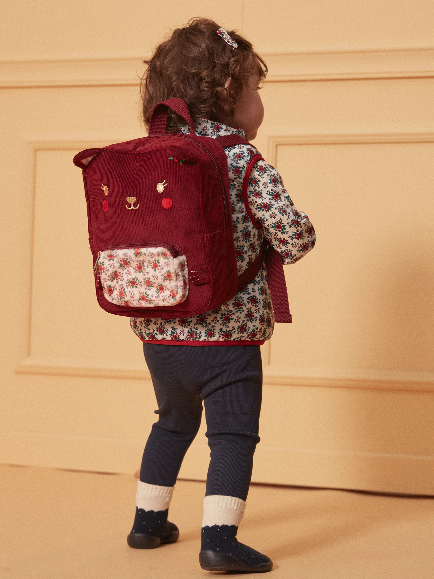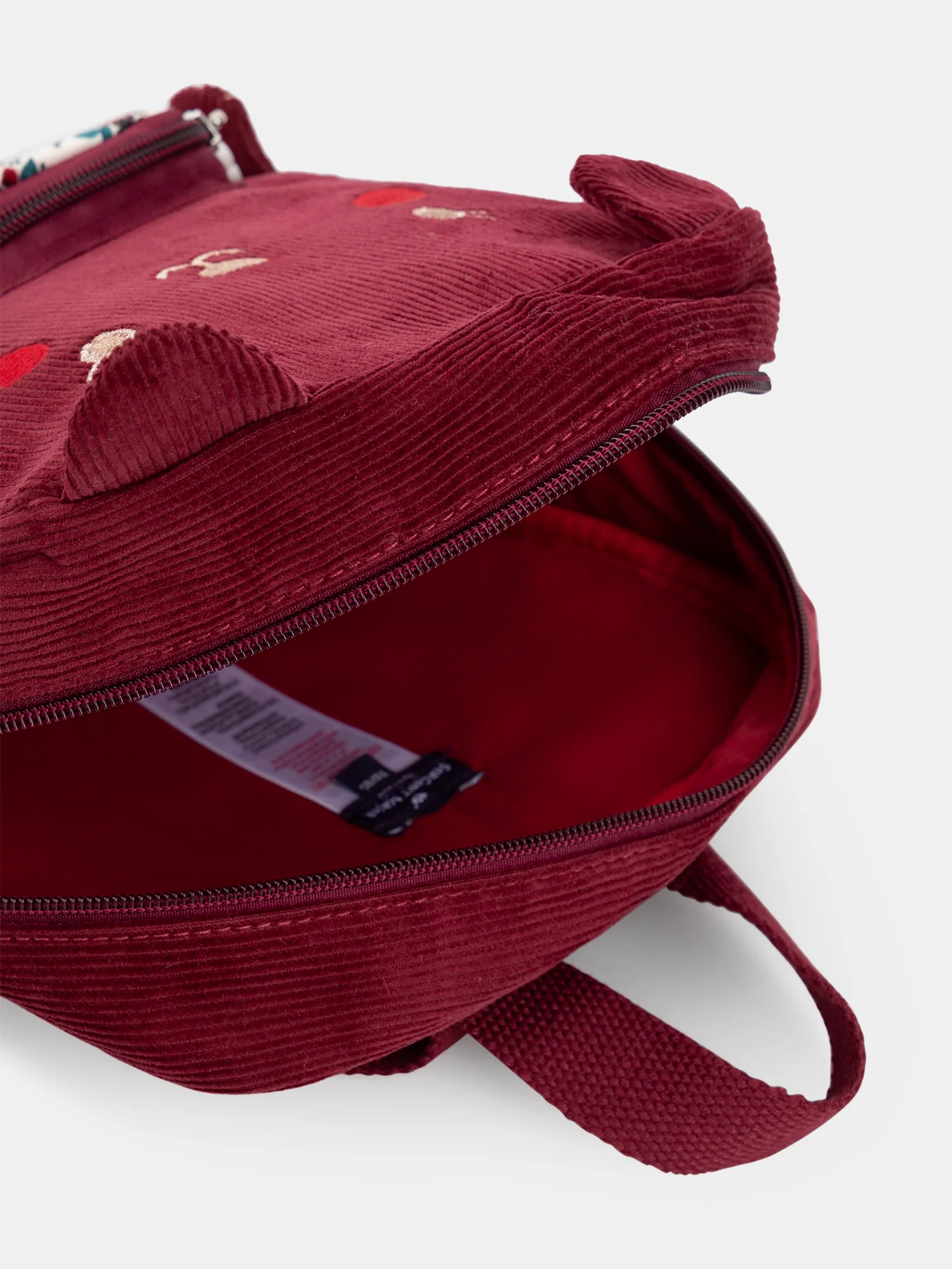 Sac à dos en velours côtelé de couleur bordeau Broderie visage chat sur le devant Poche avant imprimé petites fleurs Oreilles 3D Bretelles réglables avec boucle réglable Anse main Hauteur 23.5cm Largeur 19cm Profondeur 9cm Boucle ajustable sur les bretelles