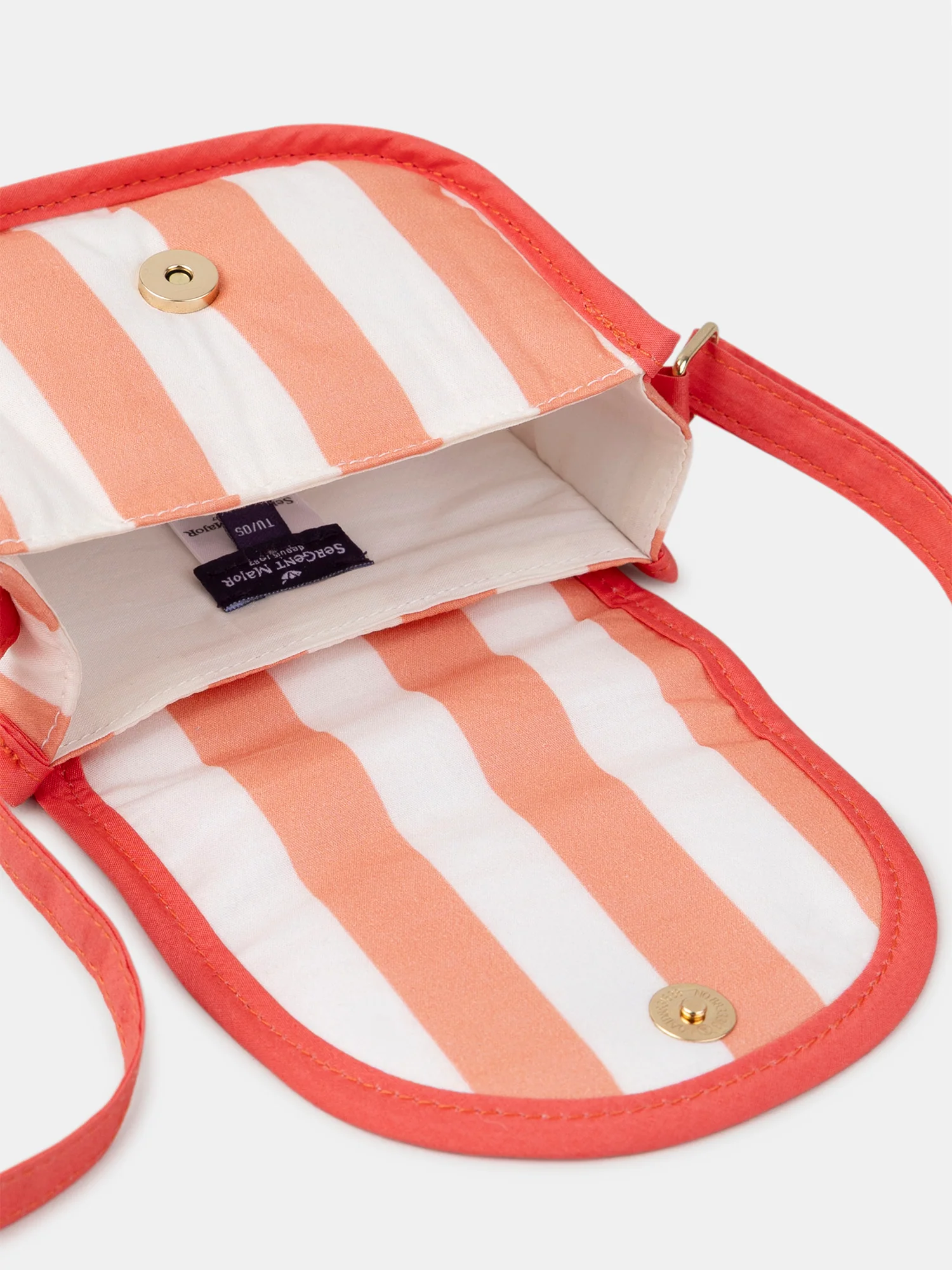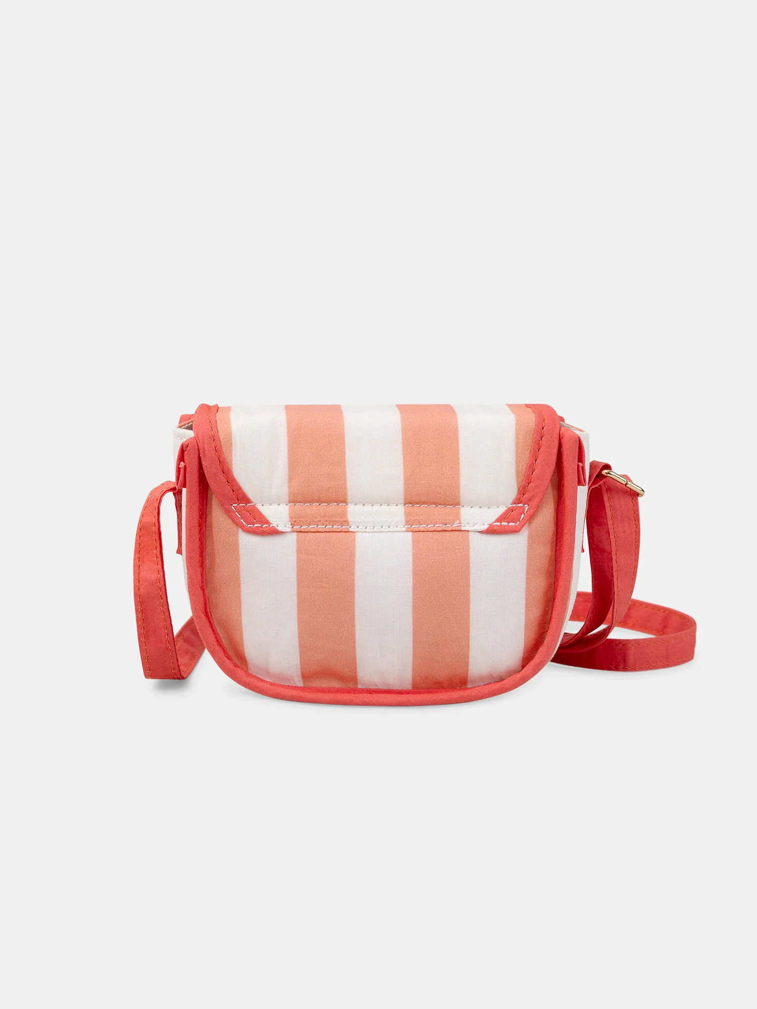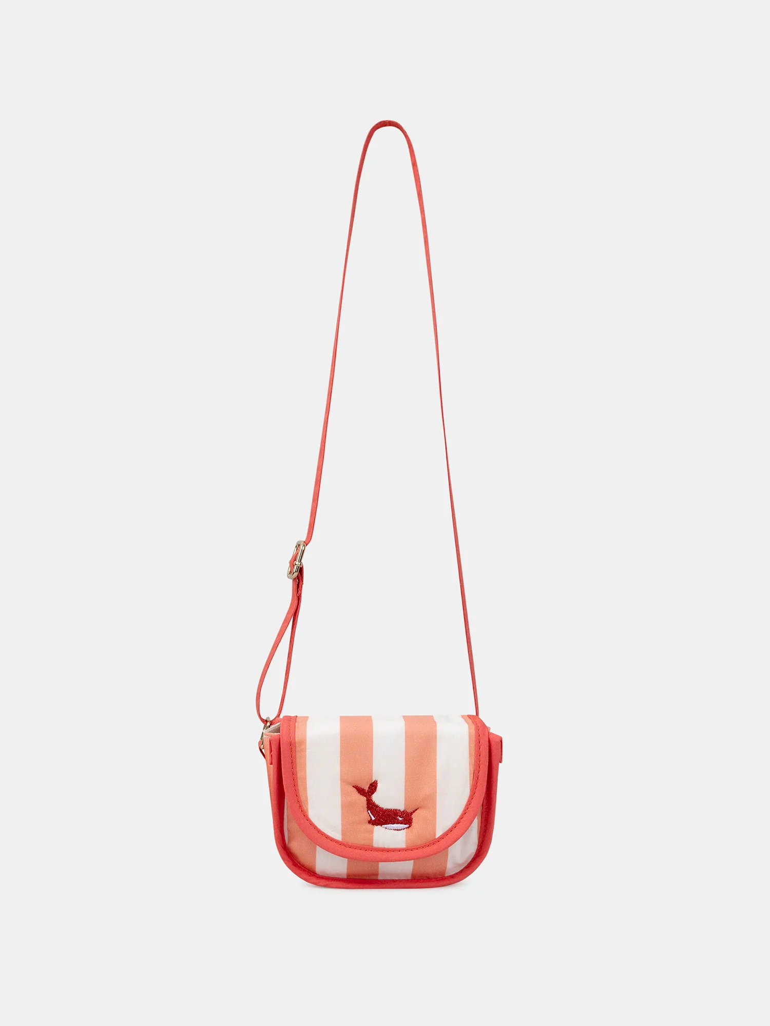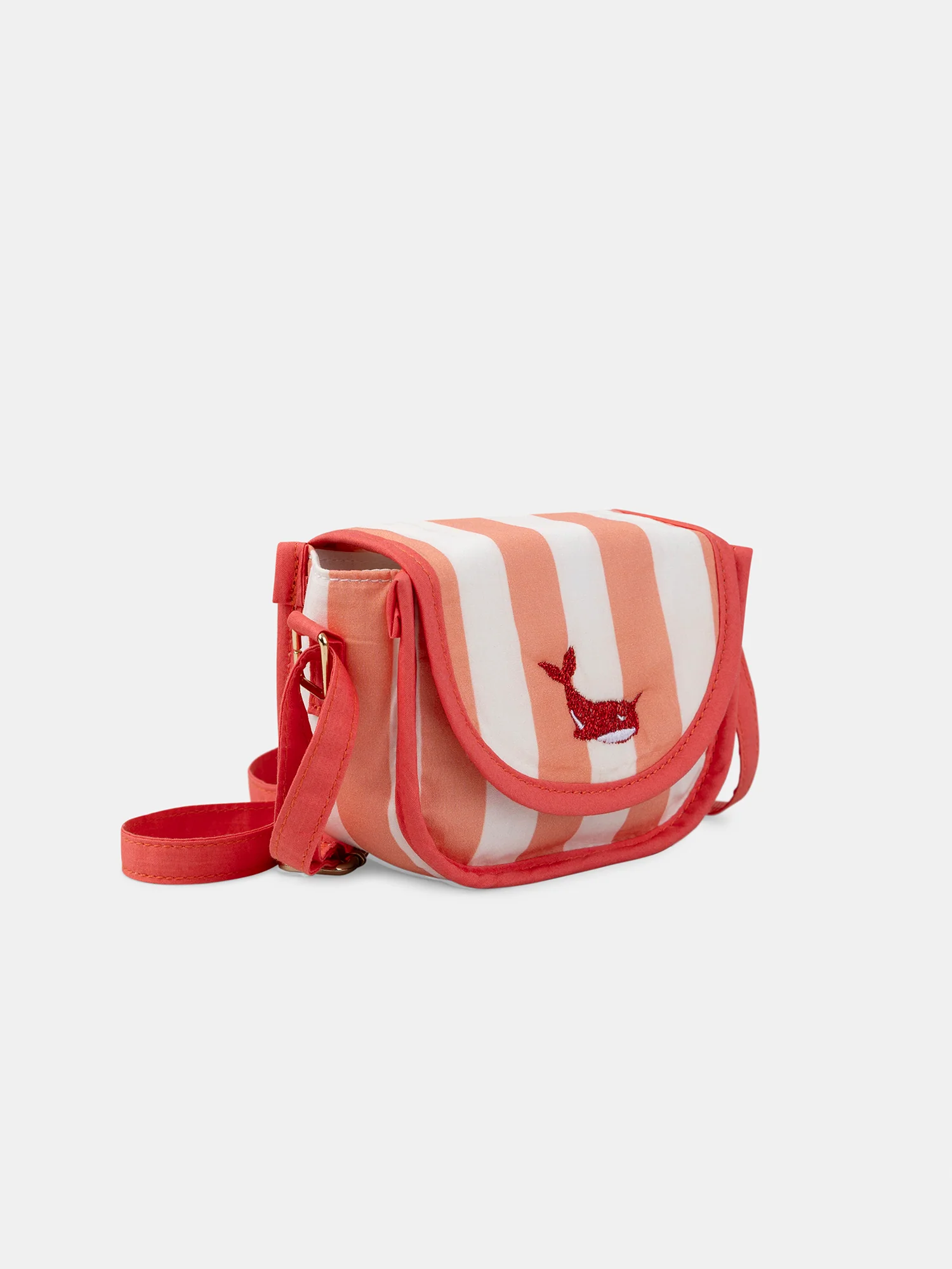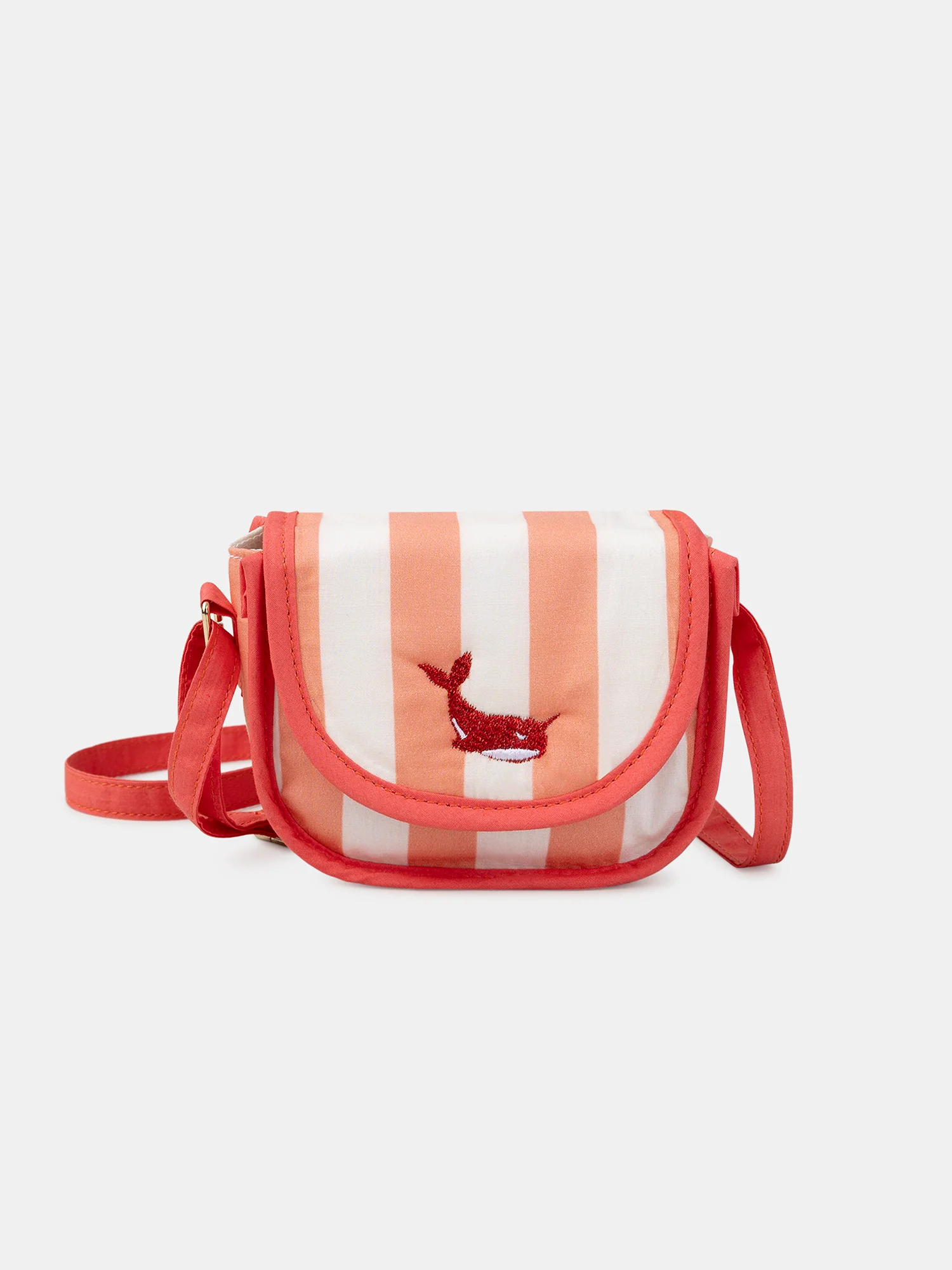 Pour les enfants pratiques au printemps et été, ce sac rayé léger est facile à porter. Bandoulière réglable et rabat avec bouton pression. Les rayures corail et écrues et broderie baleine apportent style et fantaisie.