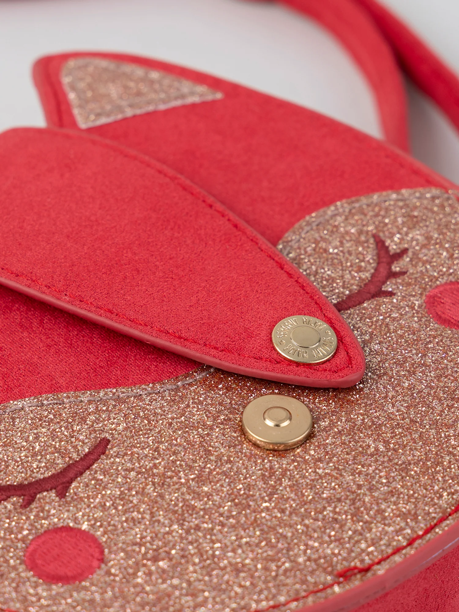 Sac couleur rouge effet daim Oreilles 3D Rabat avec bouton pressions Bandoulière réglable Bandoulière réglable Hauteur 15.5 avec les oreilles Hauteur sans les oreilles 13 cm Largeur 14cm Profondeur 4cm Le petit plus :