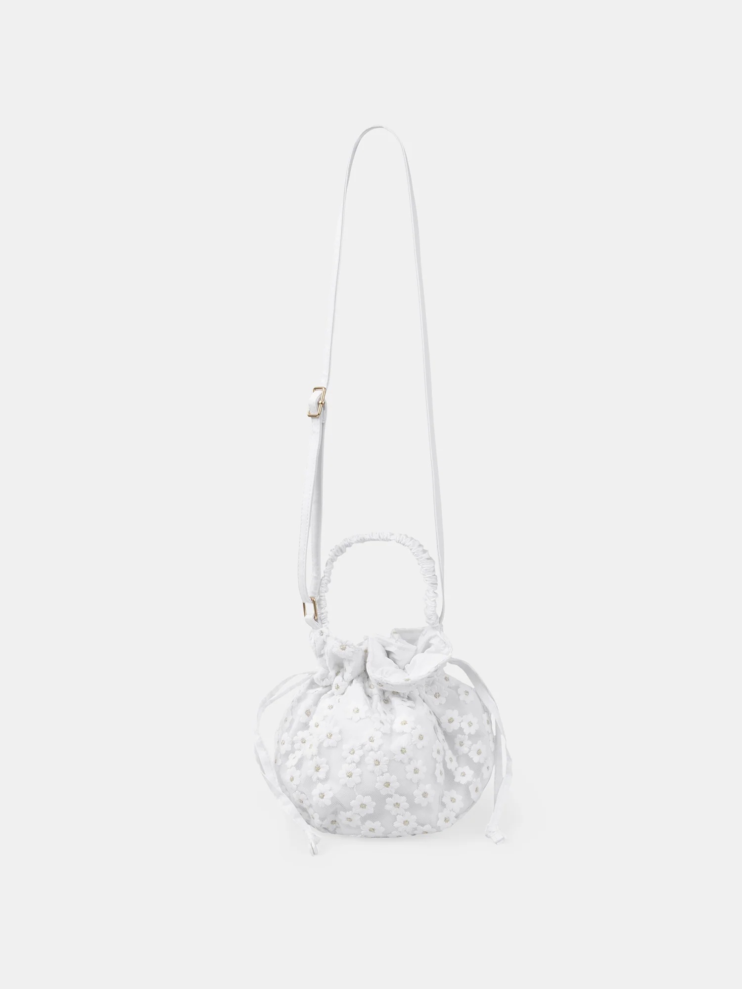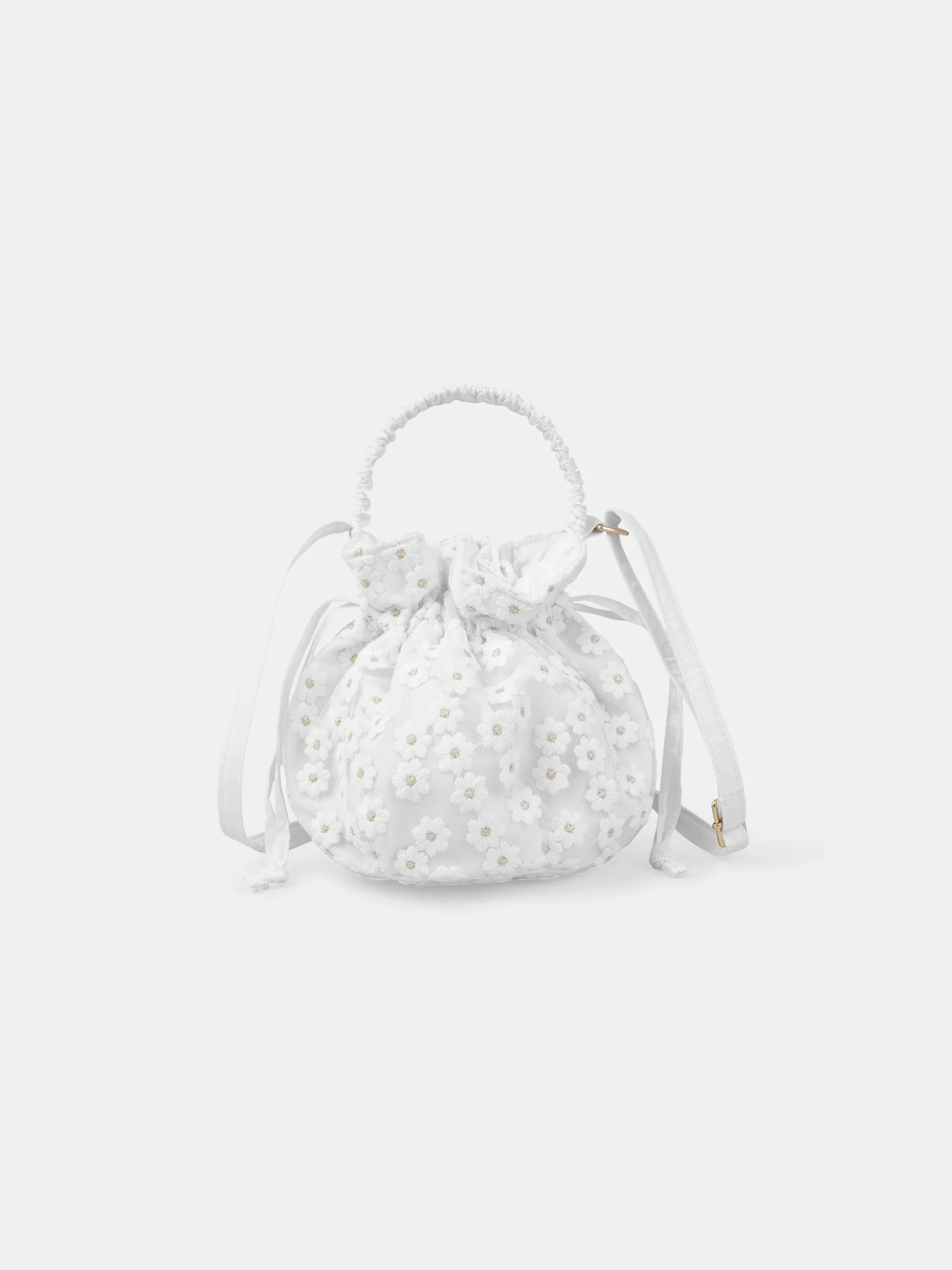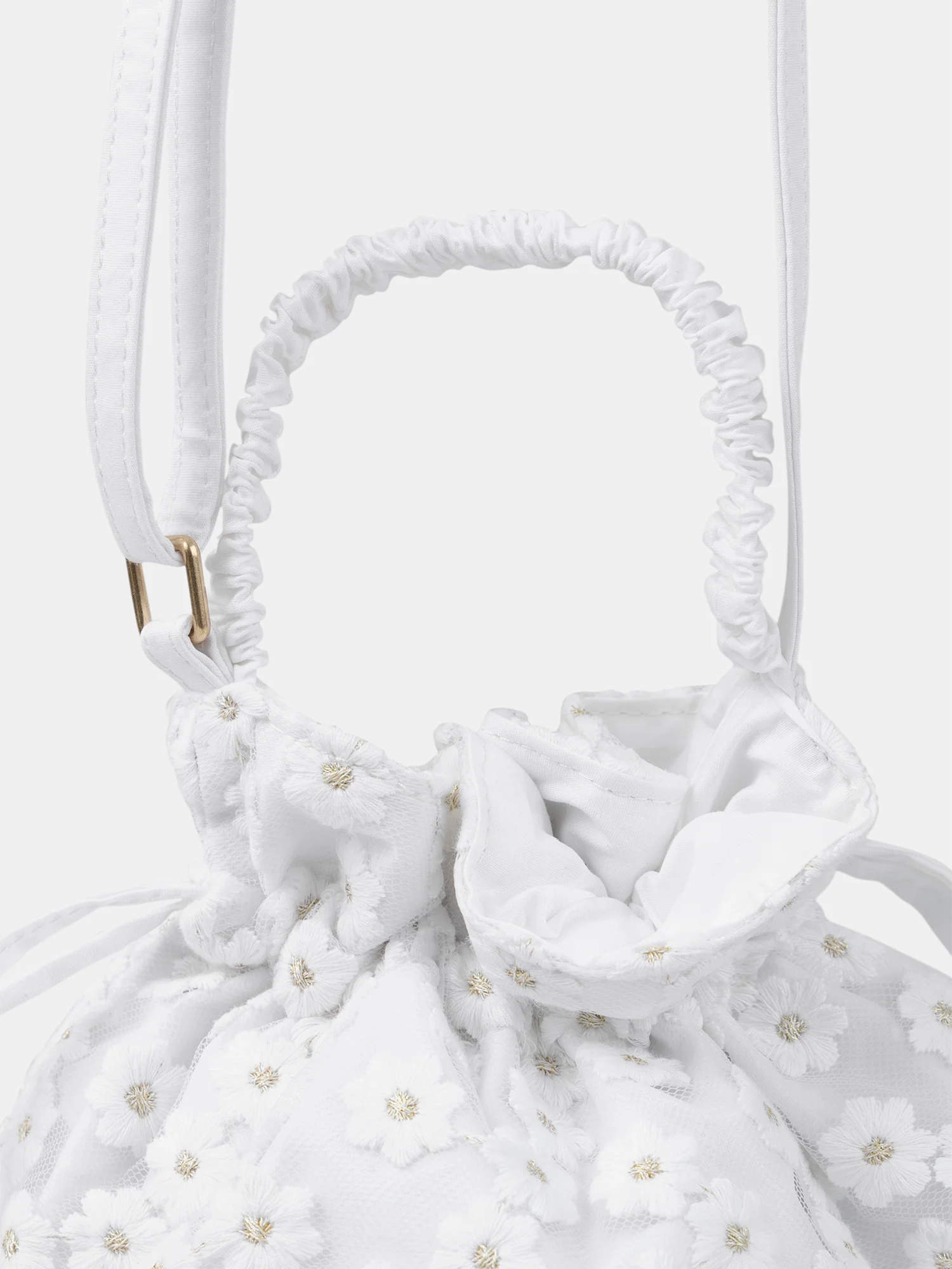 Le sac bourse bandoulière brodé présente une broderie florale écrue sur du tulle, avec une touche de doré au centre des fleurs. Sa doublure écru ajoute une finition soignée. Il dispose d’une poignée pour être porté à la main ainsi qu’une bandoulière réglable en écru, avec une boucle dorée pour un ajustement personnalisé.