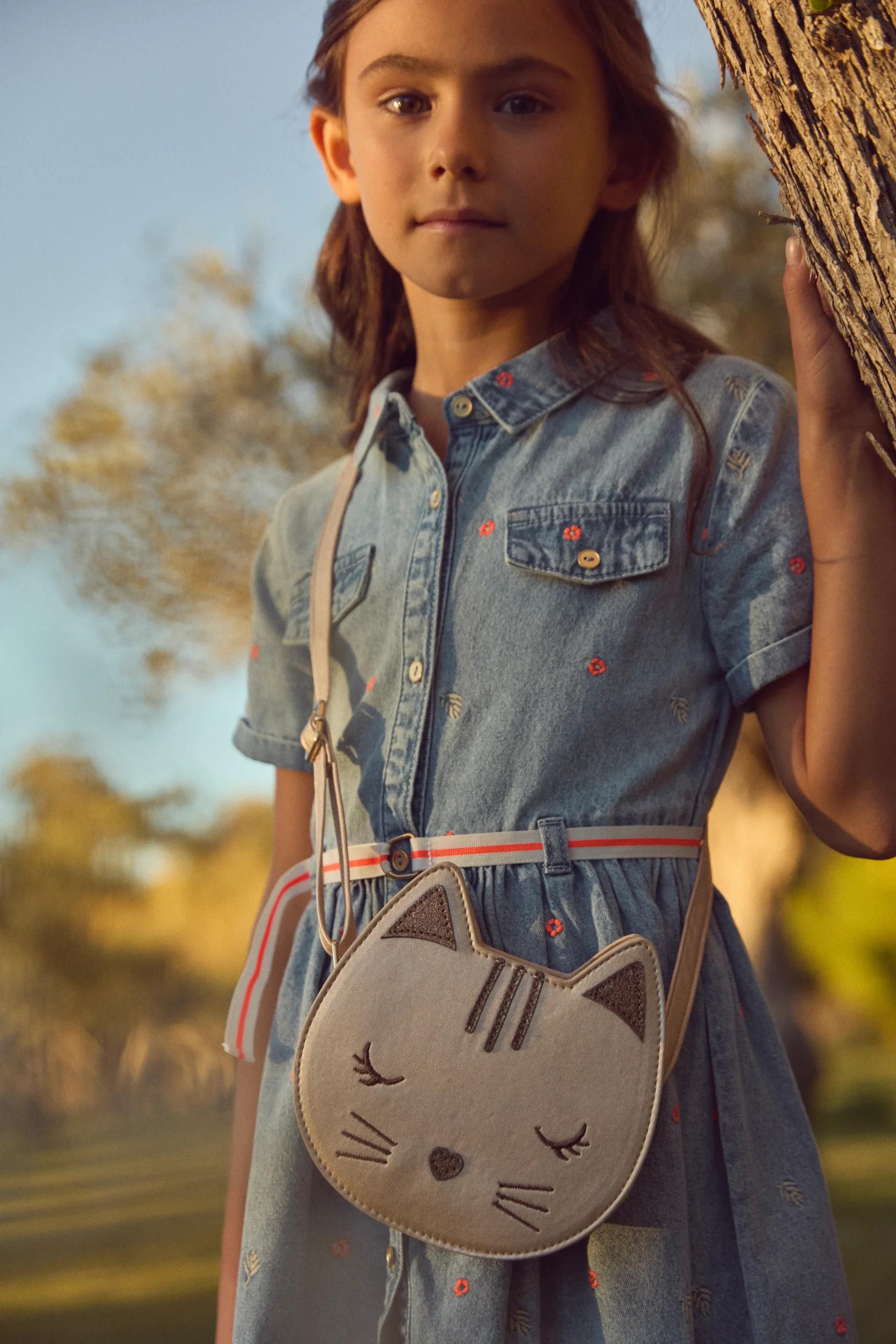 Pour les enfants qui aiment les accessoires ludiques. Sa matière irisée est résistante. Le visage de chat et les oreilles pailletées apportent tendresse. Tête de chat, visage brodé Fond rose gold irisé Bandoulière réglable Dimensions : 15,3cm x 15,3cm Oreilles et museau marron à paillettes Ce produit appartient à l’Histoire N°3 : Exploration Lointaine.