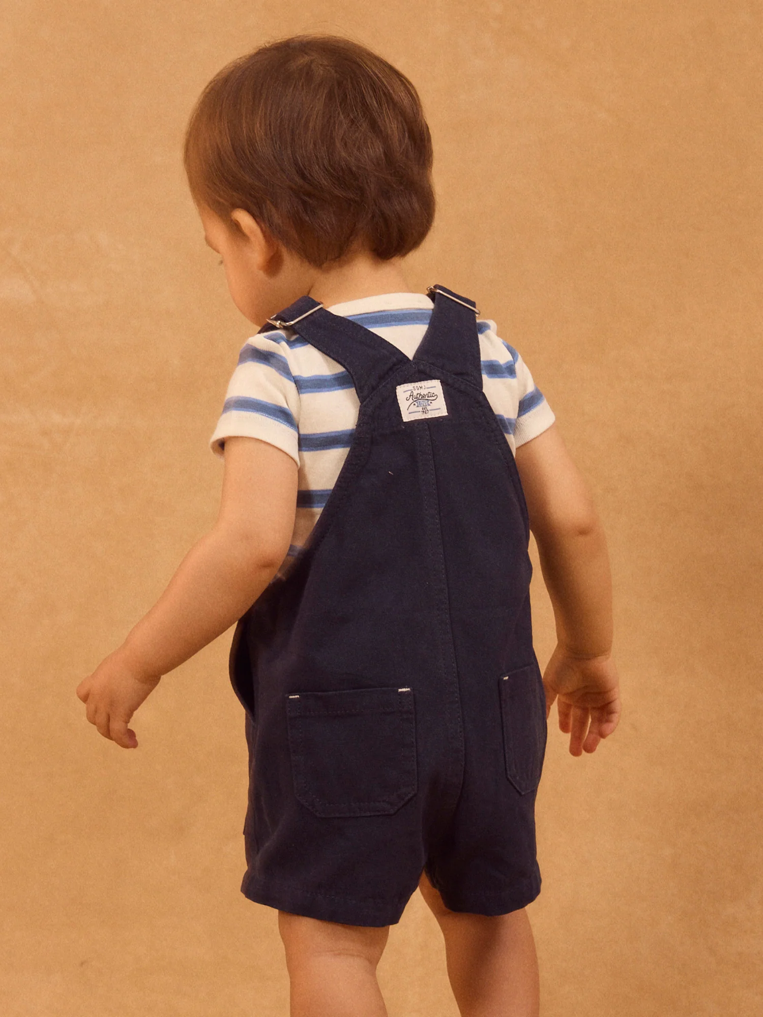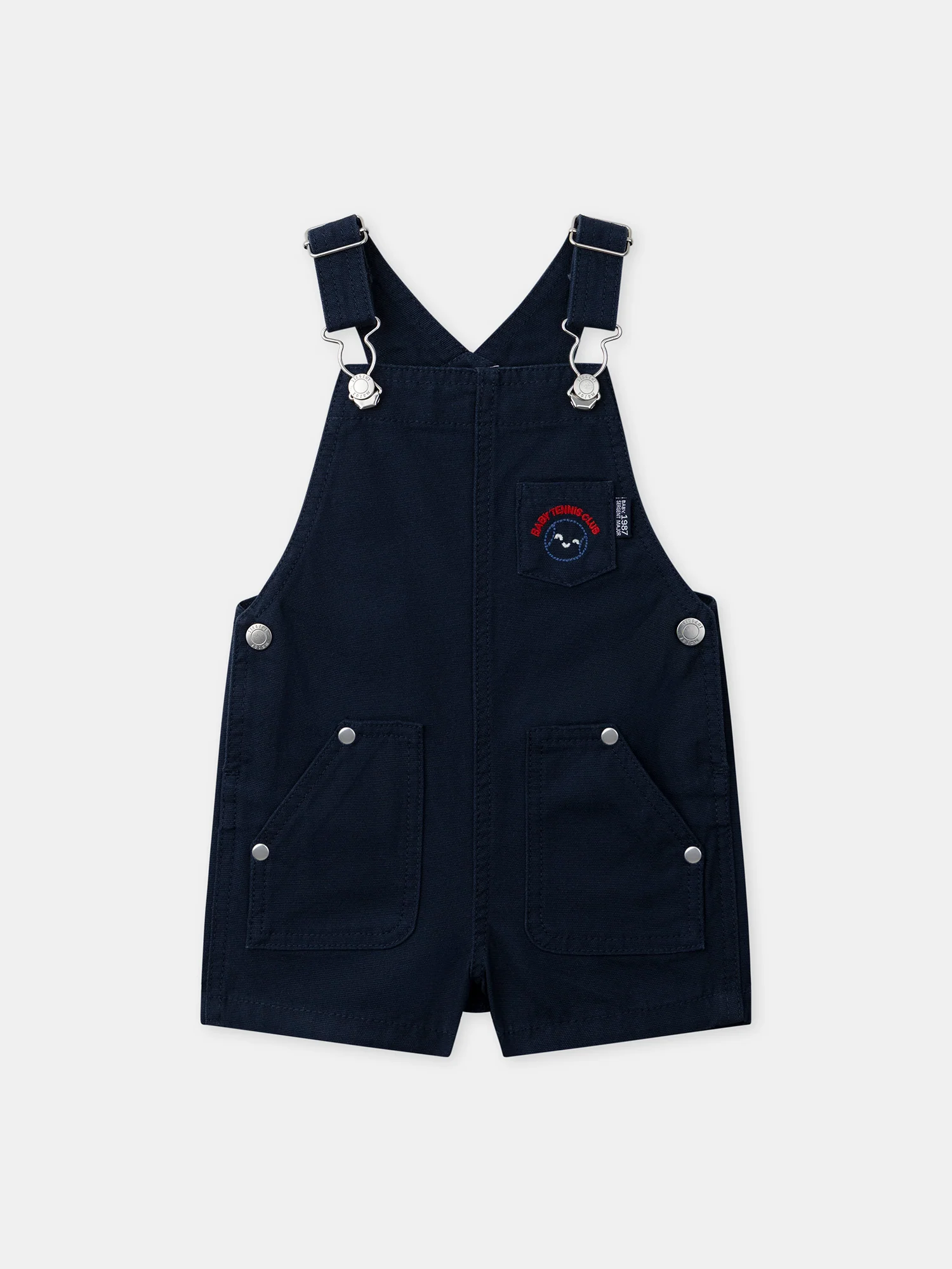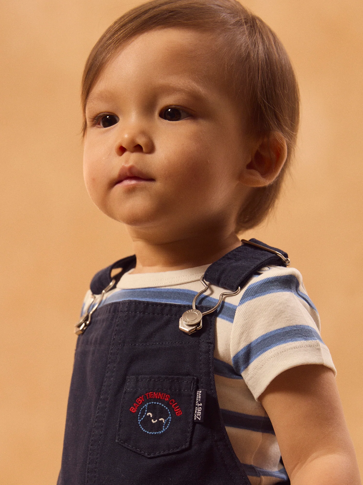 Pour les bébés actifs au printemps et été, cette salopette courte marine est confortable. Ouverture taille et entrejambe par boutons à pression et bretelles ajustables. La poche sur buste brodée tennis et volants apportent style et charme sportif.