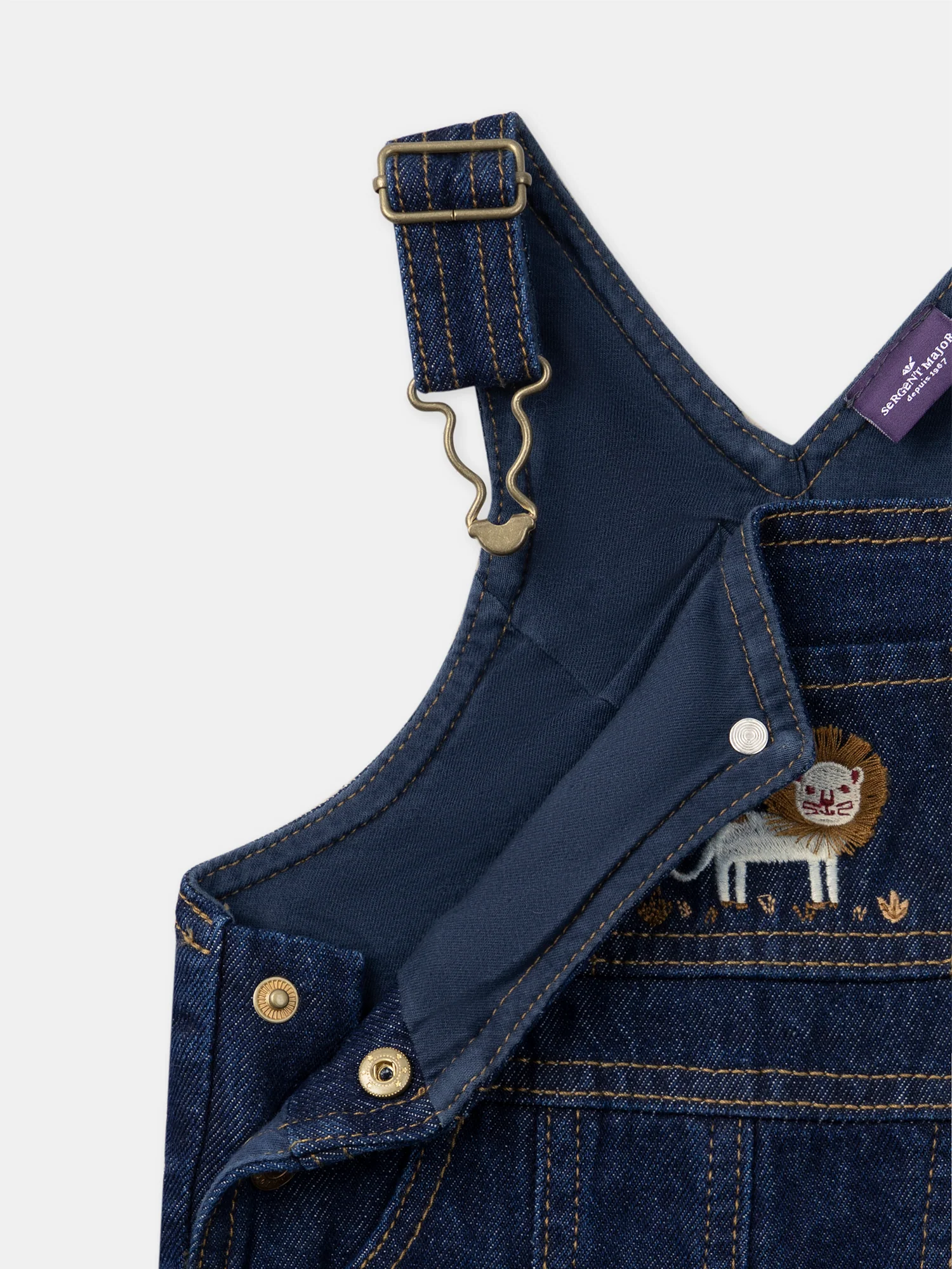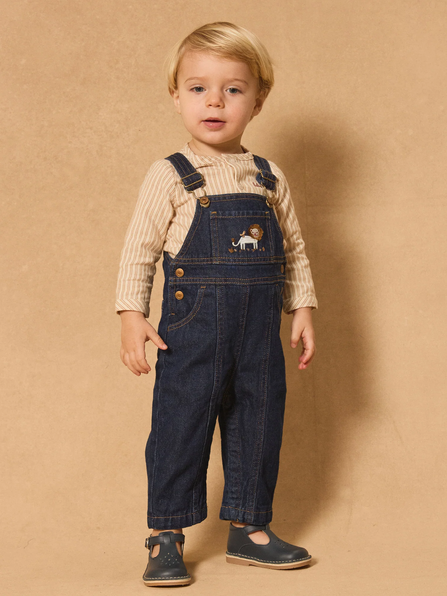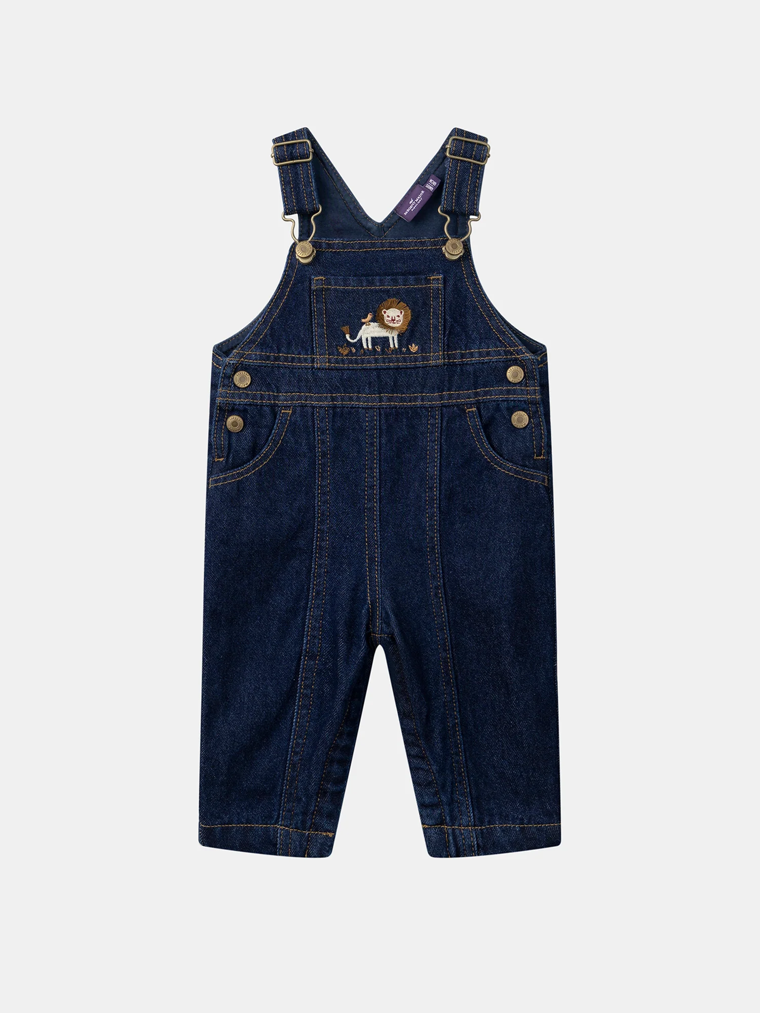Cette salopette longue en denim brut est idéale pour les petits explorateurs, offrant confort et style. Avec son lion brodé sur la poche avant, ses détails frangés et ses coutures contrastées marron camel, elle allie originalité et qualité. Pratique, elle dispose de bretelles ajustables et d’ouvertures à boutons à pression à la taille et à l’entrejambe, avec des vignettes tissées pour une touche de caractère.