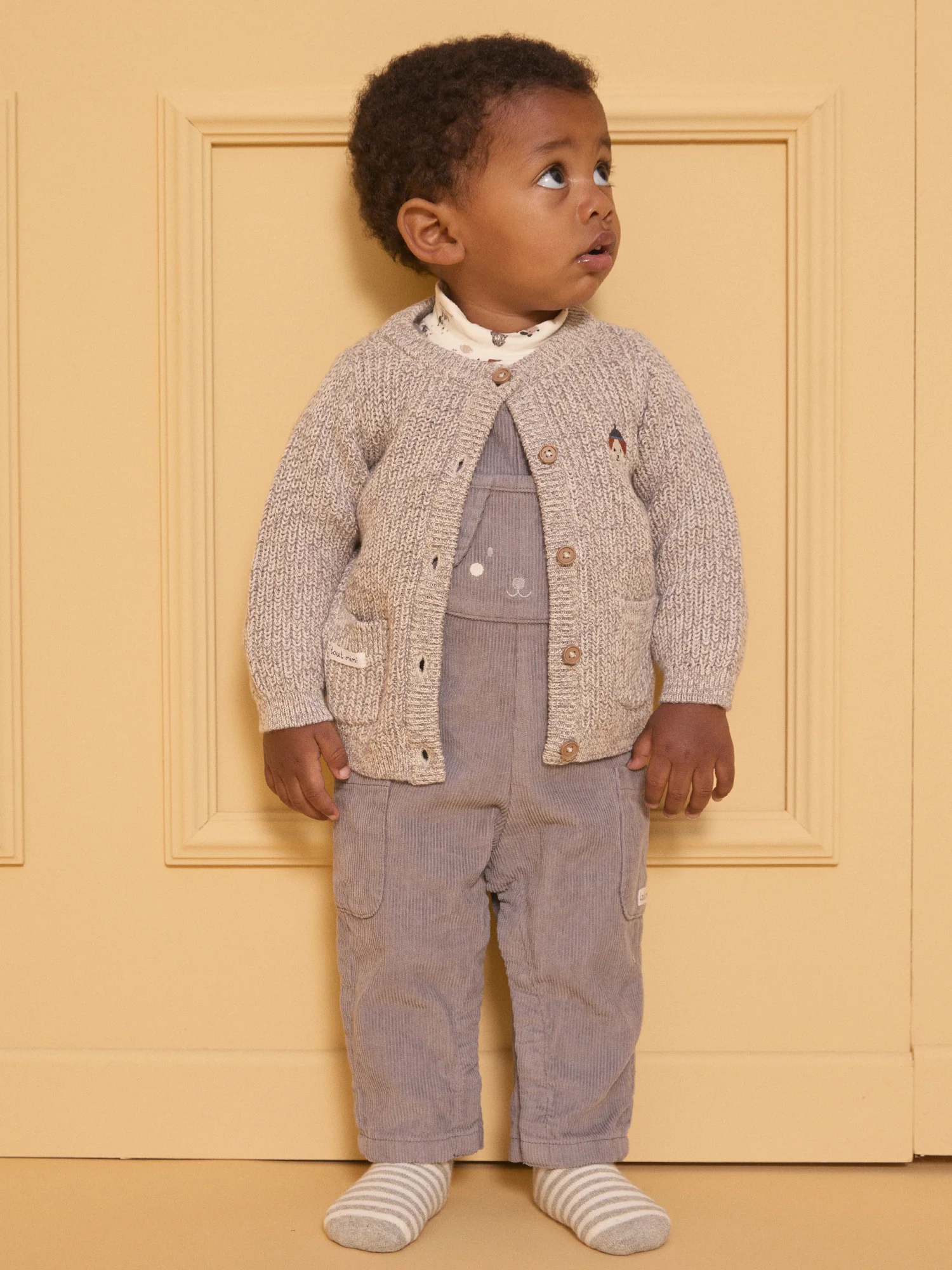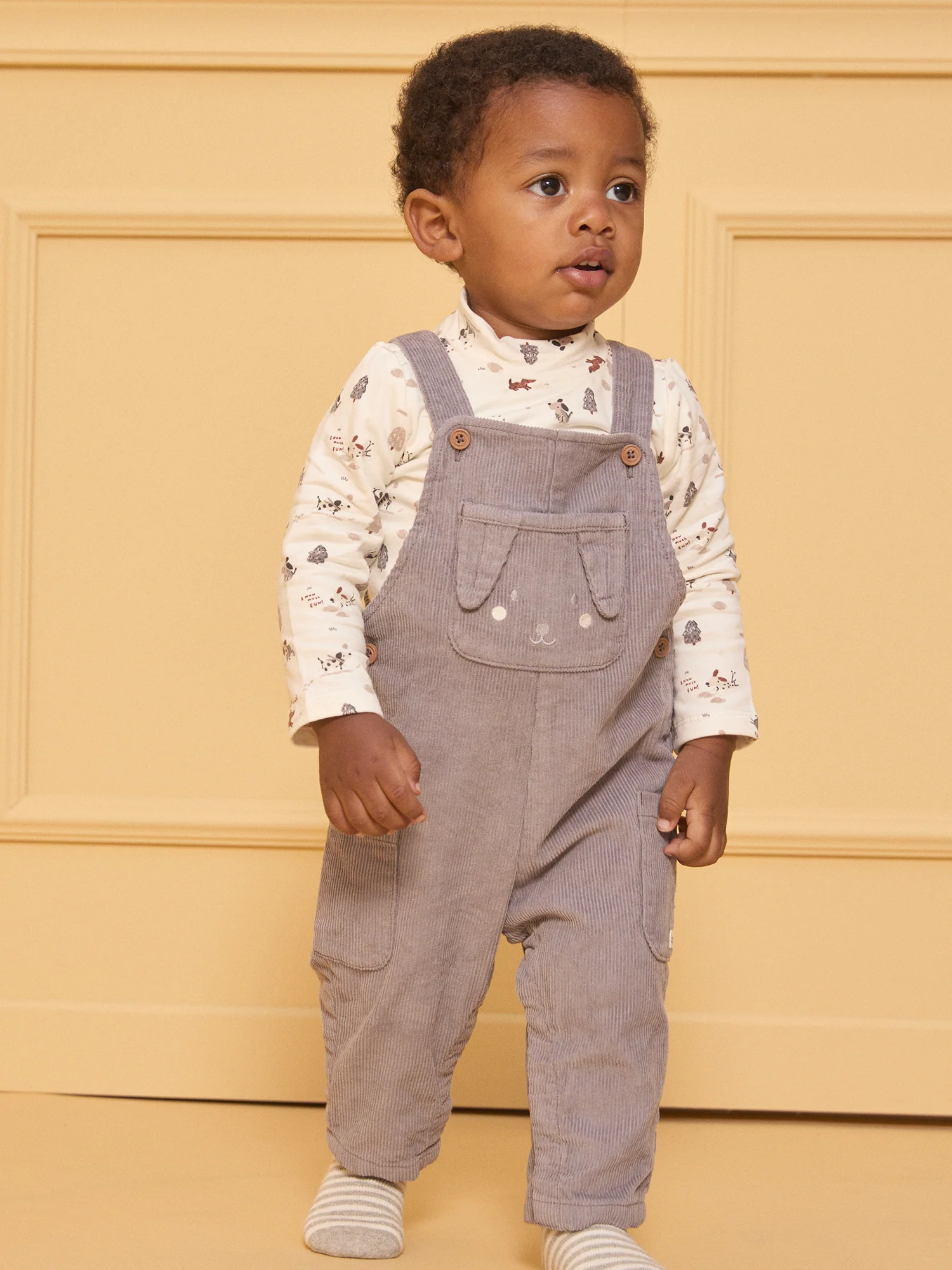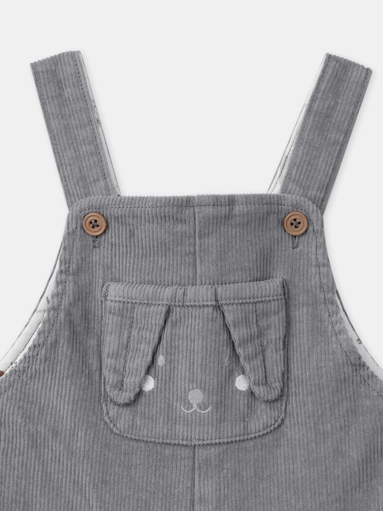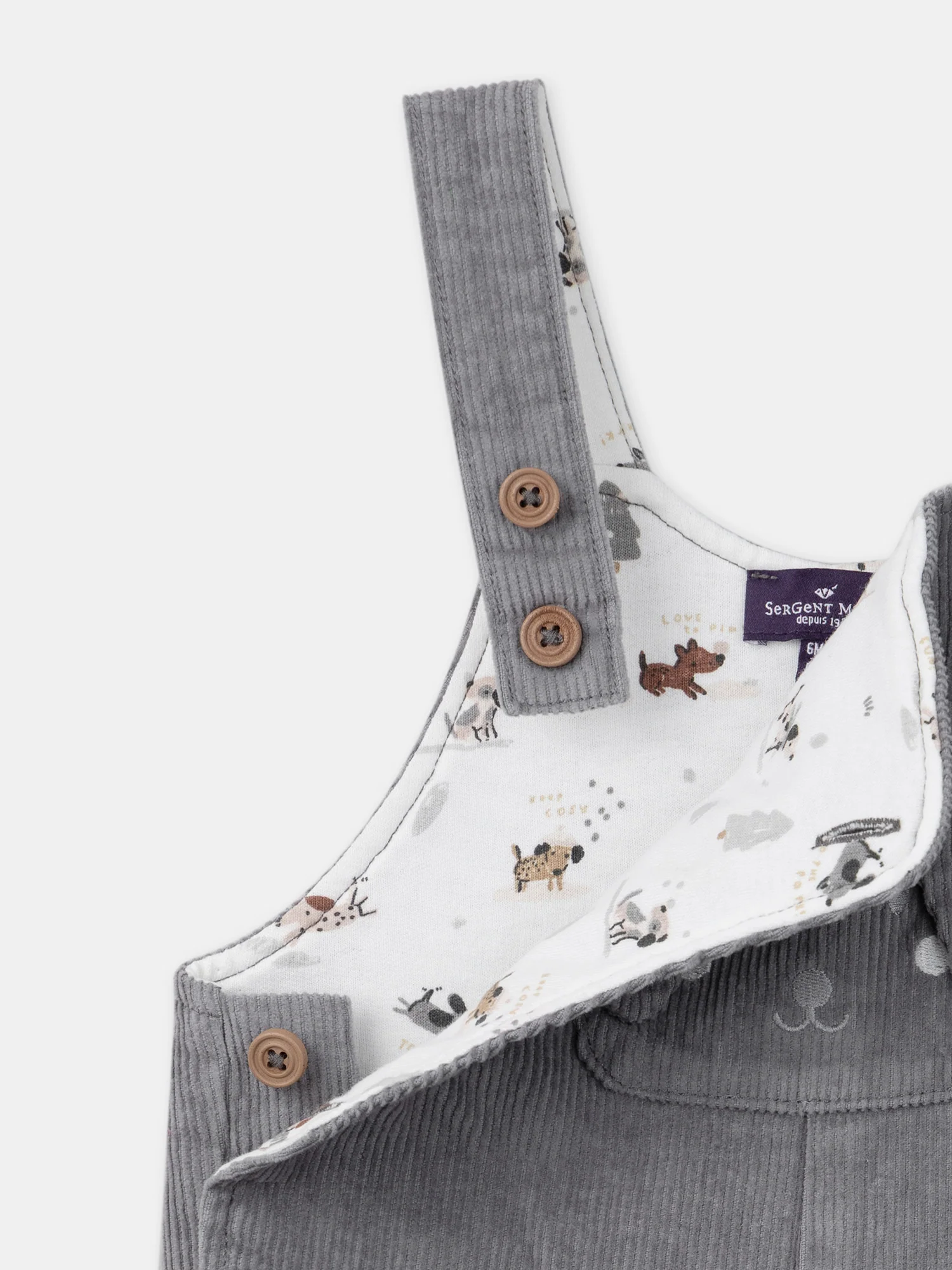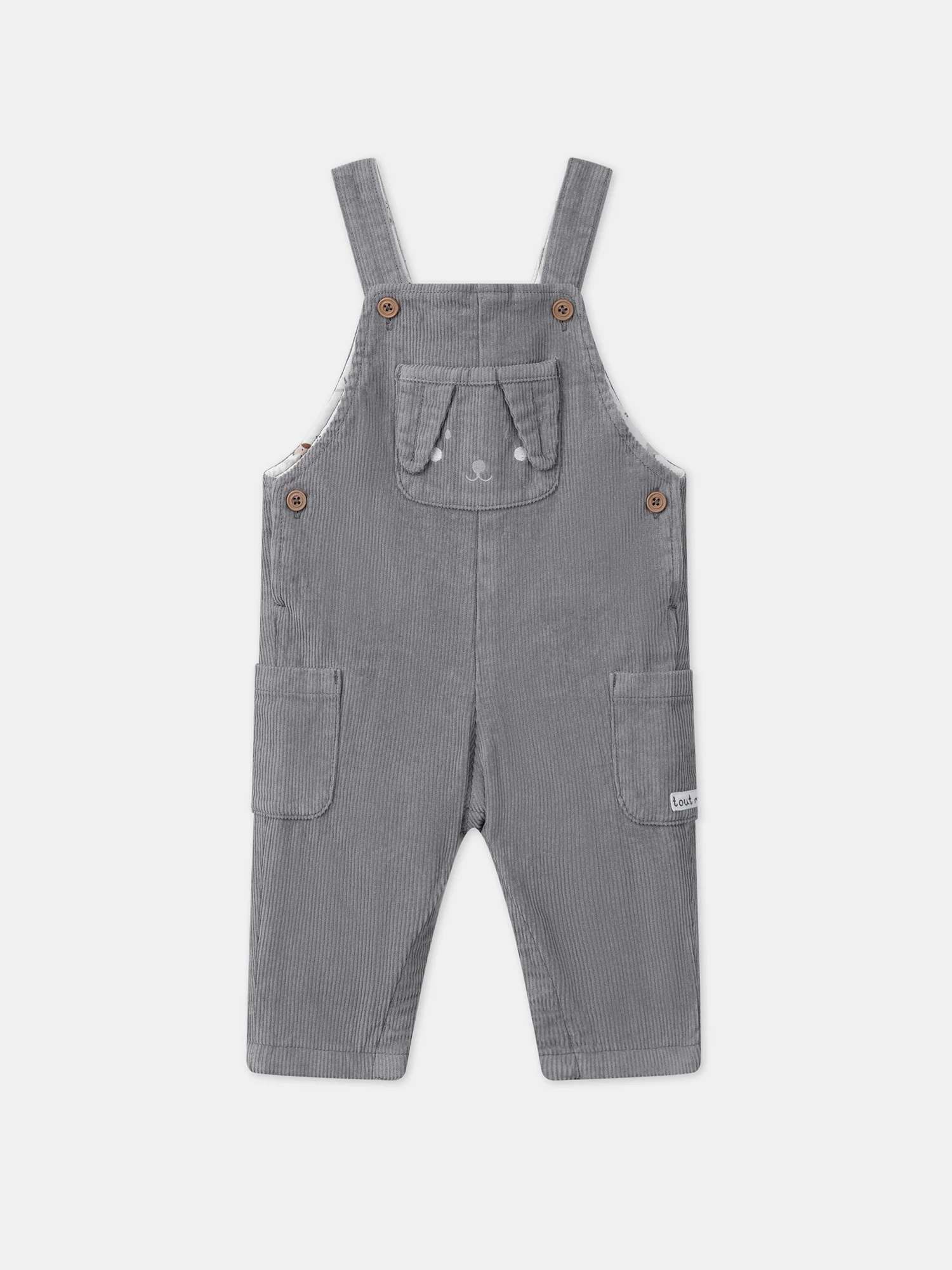 Cette salopette en velours côtelé est à la fois adorable et pratique. Elle dispose d’une poche plaquée sur le buste, ornée d’un visage de chien brodé avec des oreilles en 3D pour une touche ludique. Les deux poches latérales sont dotées d’une vignette tissée « tout mimi ». La doublure du buste présente un imprimé de chiens dans des tons de gris clair, moyen, foncé et marron, tandis que les jambes sont également doublées. Les bretelles ajustables, l’ouverture à la taille par boutons et l’ouverture entrejambe par boutons à pression garantissent un confort optimal et un habillage facile. Un choix parfait pour les petits explorateurs !