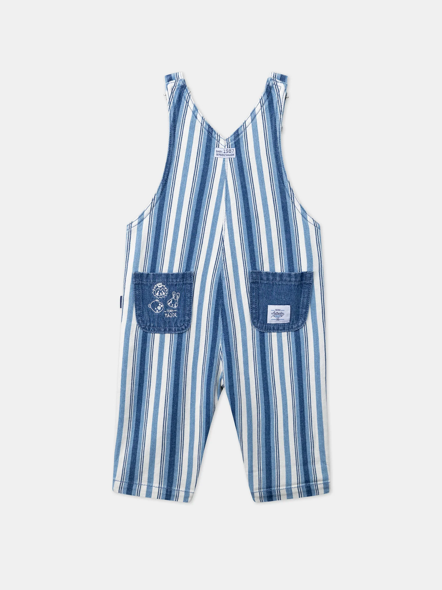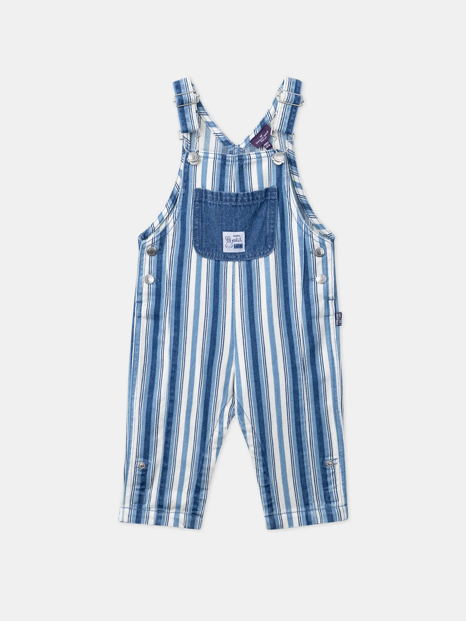 Salopette longue en denim à imprimé à rayures. Bretelles réglables Ouverture par clip à la base des bretelles Ouverture à boutons-pression à la taille et à l’entrejambe Alternance de rayures bleu pastel, écrues et denim moyen Poche contrastante avec vignette brodée Mon petit lapin sur le buste 2 poches contrastantes avec visages d’animaux brodés et […]